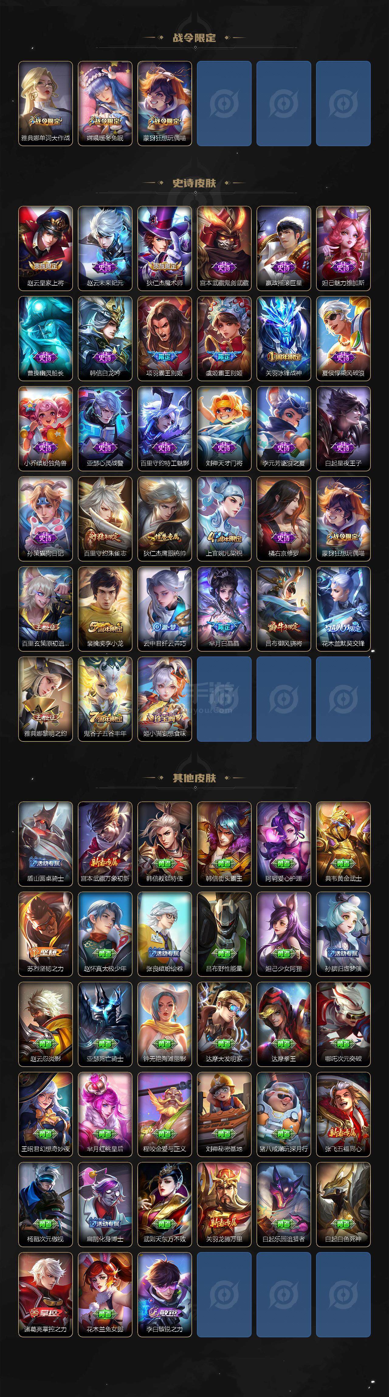 【传说皮肤】:宫本武藏地狱之眼,孙尚香末日机甲,梦奇胖达荣荣