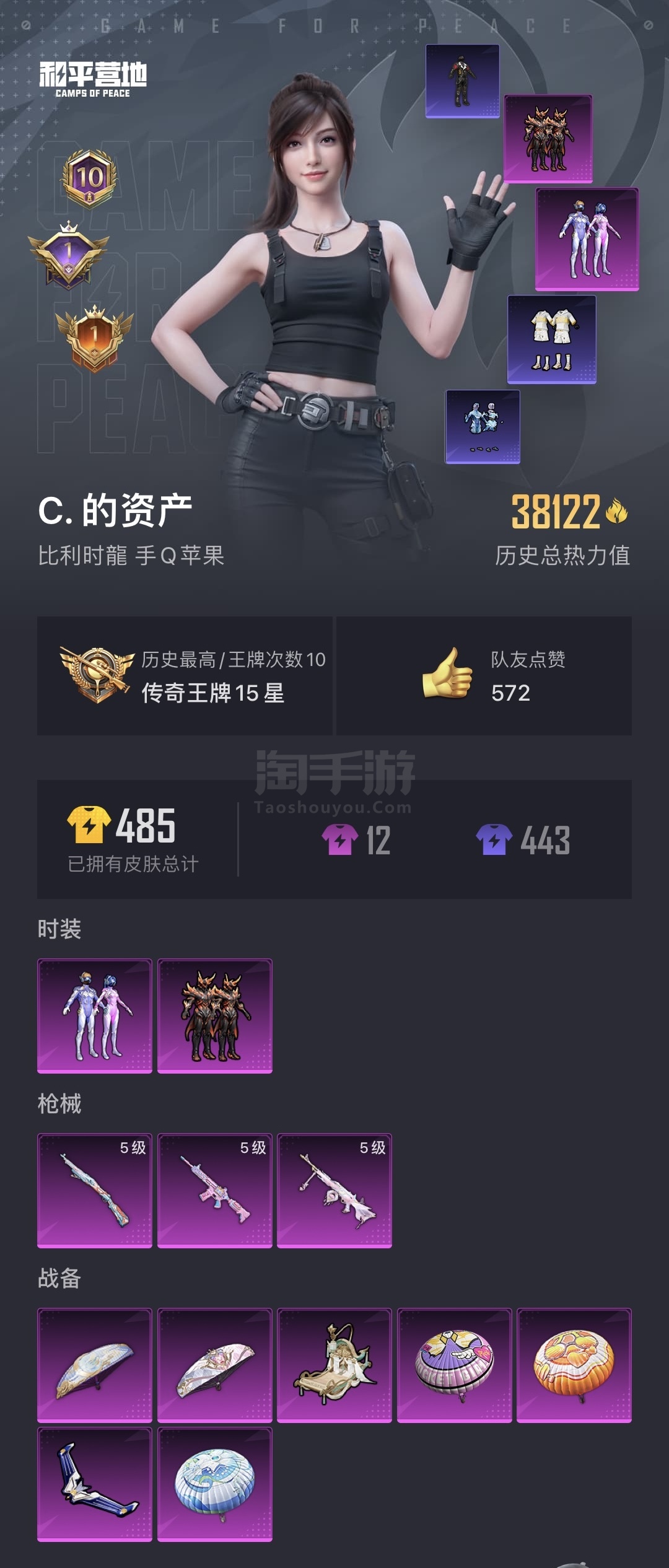 和平:两套粉装,有梦幻火箭,三把升级枪、两个飞行器,最高段位王牌15星10个王牌印记,有黄金龙骨m4和awm