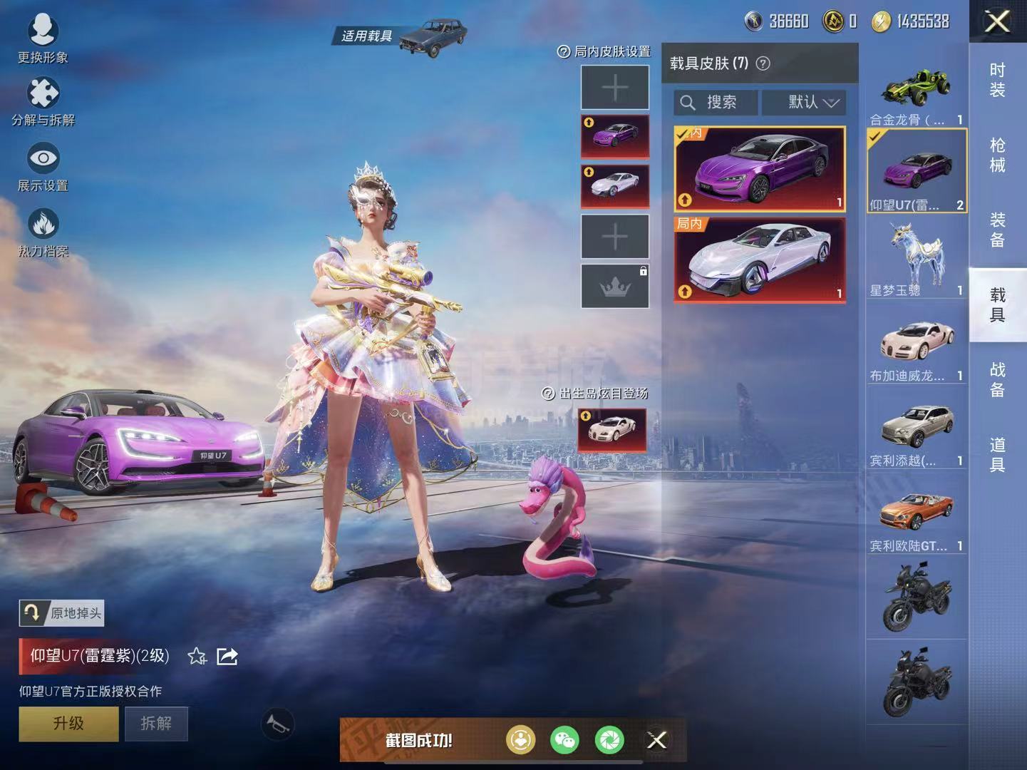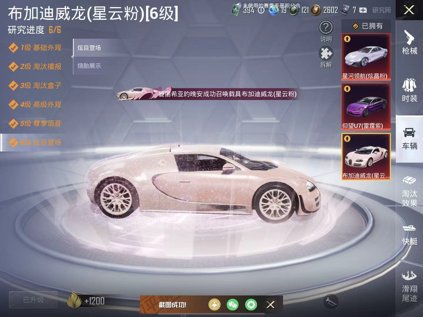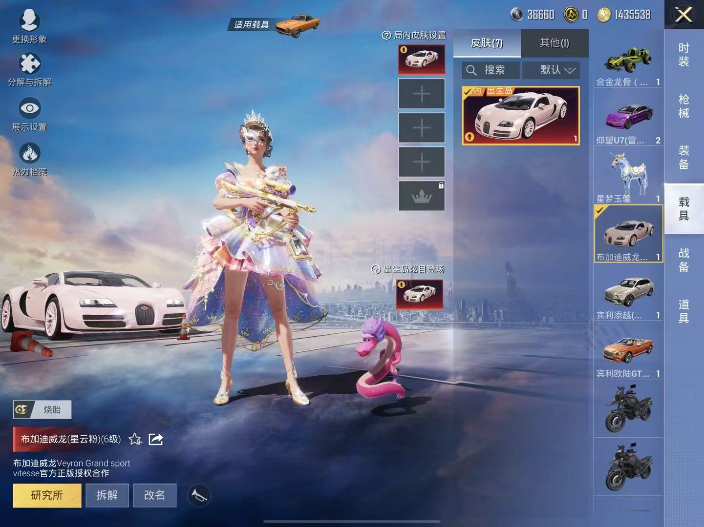 满级车布加迪威龙,红装.欧若拉,10粉枪,1红装,7车皮,3红车,14粉装