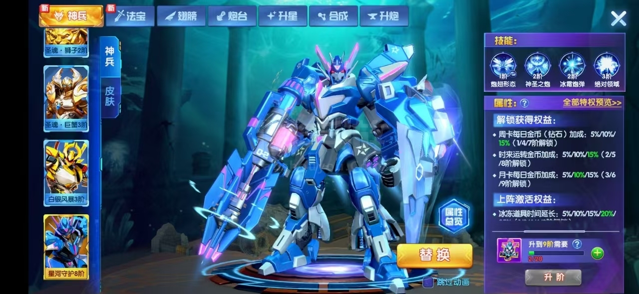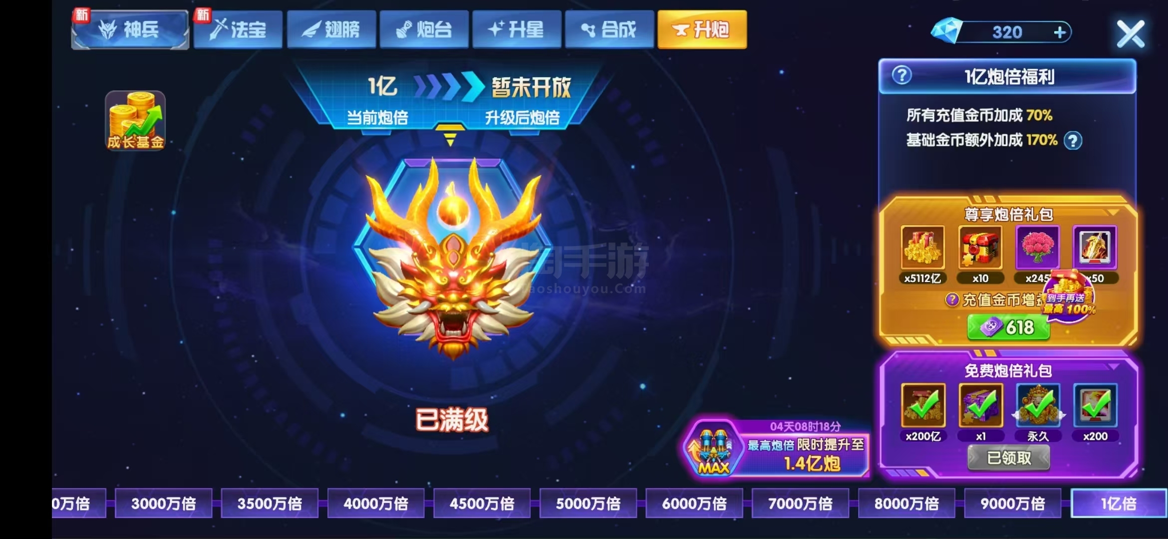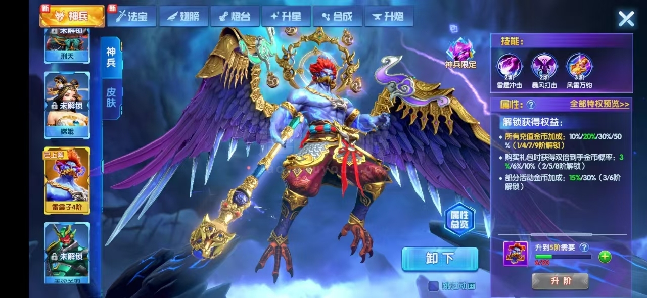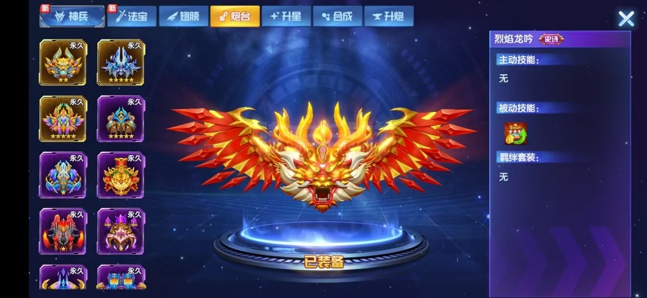 极品文字高充V15,马上v16,神兵大量,最高8阶神兵,带皮肤,五星炮台翅膀好几个,满炮,目前可以1.4亿炮,道具管饱,手慢无