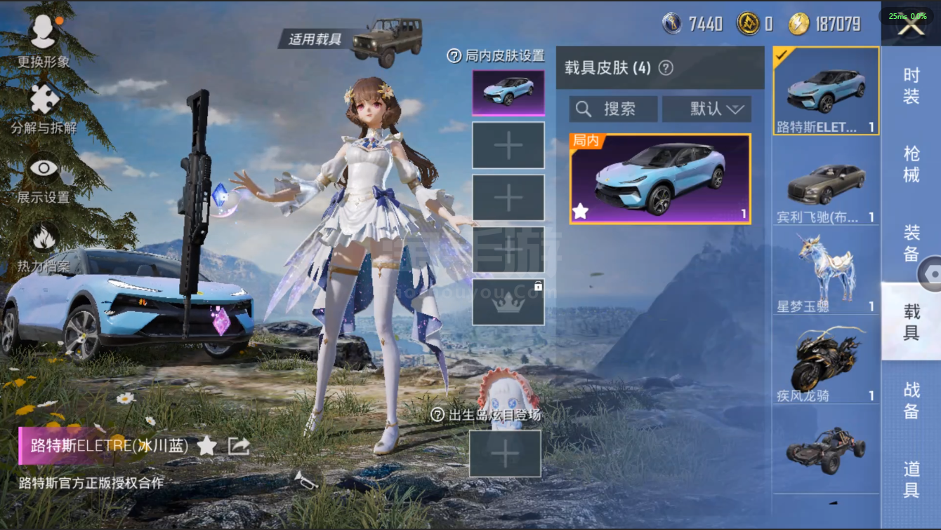 【角色神装】:镜域双华-欧若拉【稀有载具】:路特斯ELETRE(冰川蓝),宾利