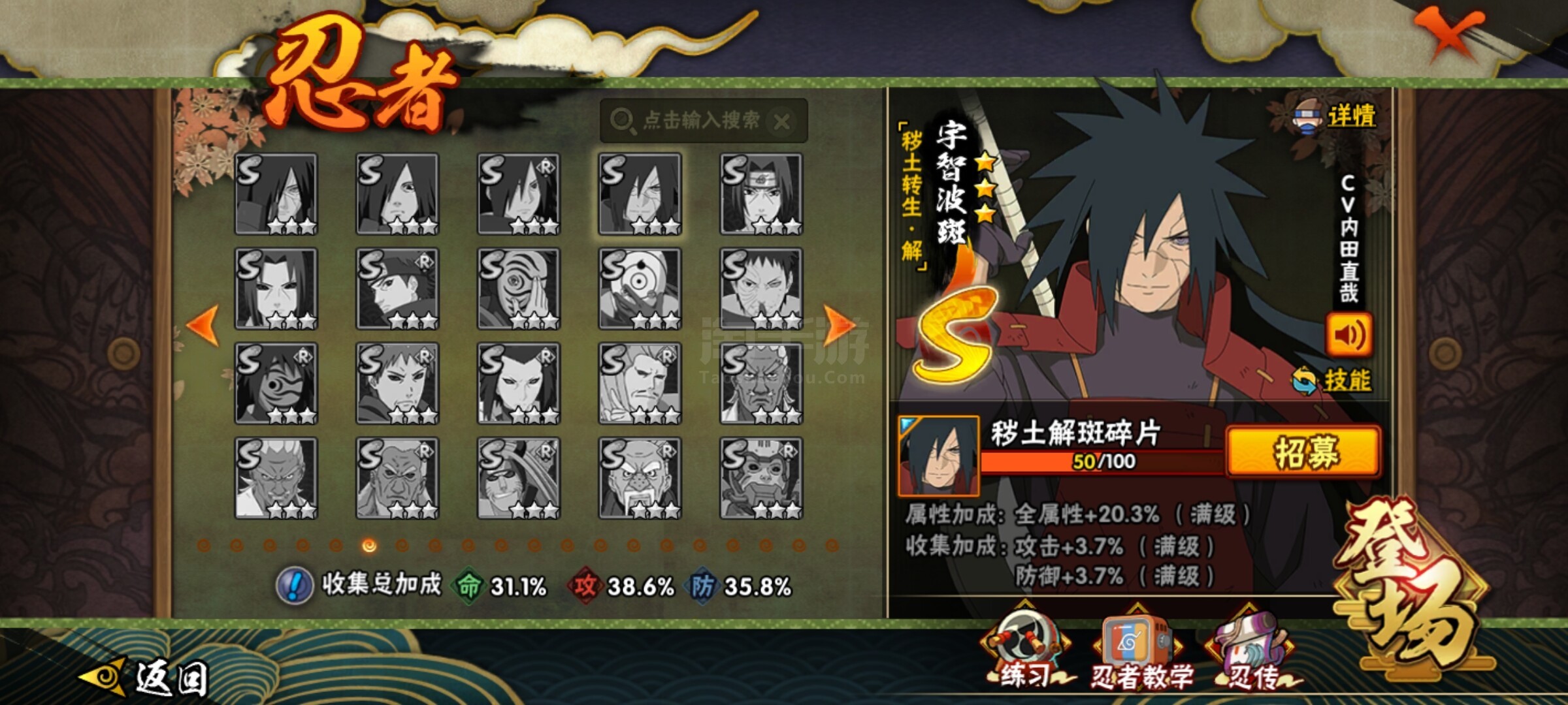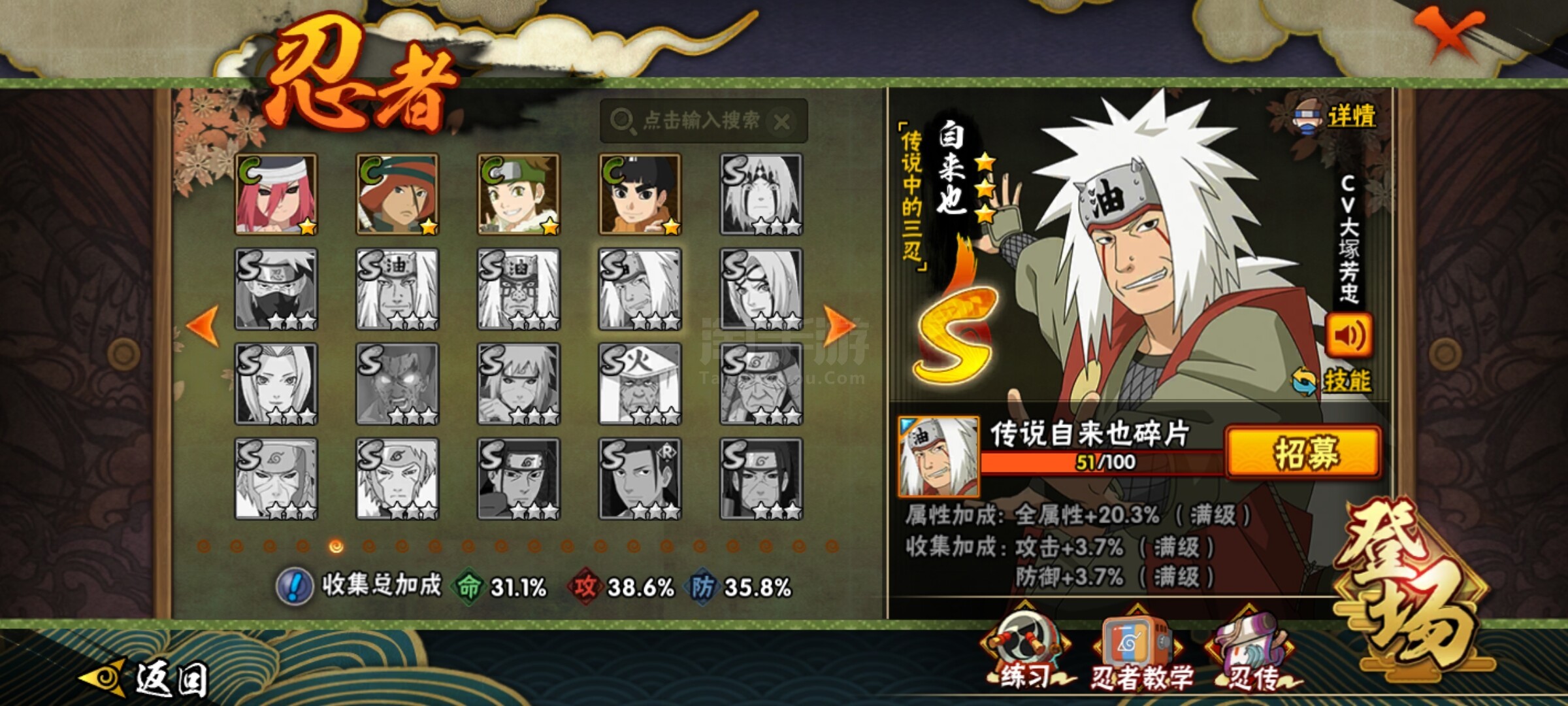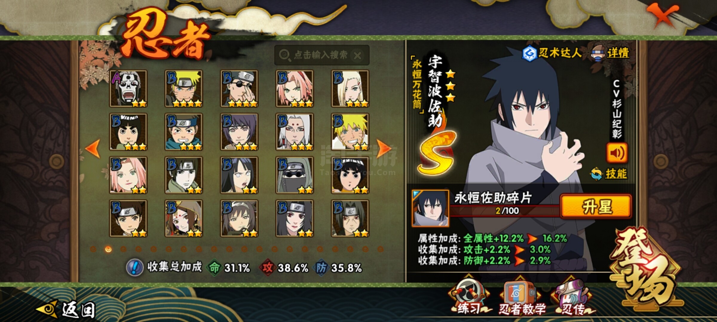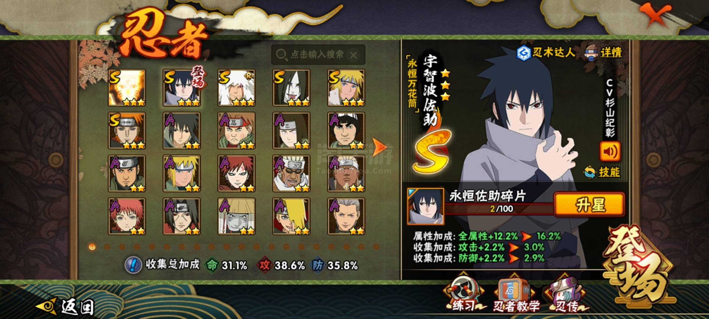 【S级忍者】:自来也「舞之豪杰」(3星),大蛇丸(3星),波风水门(3星),漩涡鸣人「九喇嘛连结」(3星),佩恩「天道」(3星),宇智波佐助「永恒万花筒」(3星)