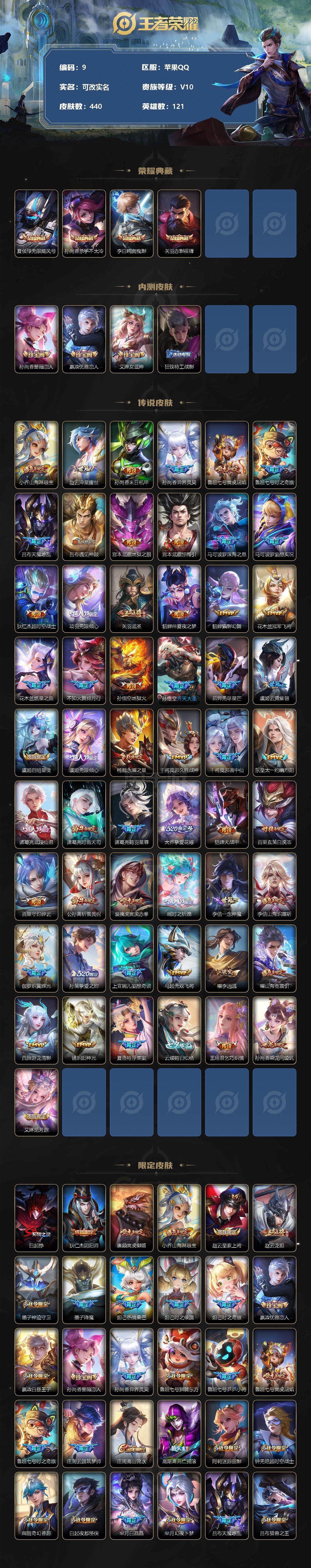 王者荣耀【苹果QQ】【商品标题】:苹果Q-V10-永恒钻石III段位-121英雄-440皮肤-4典