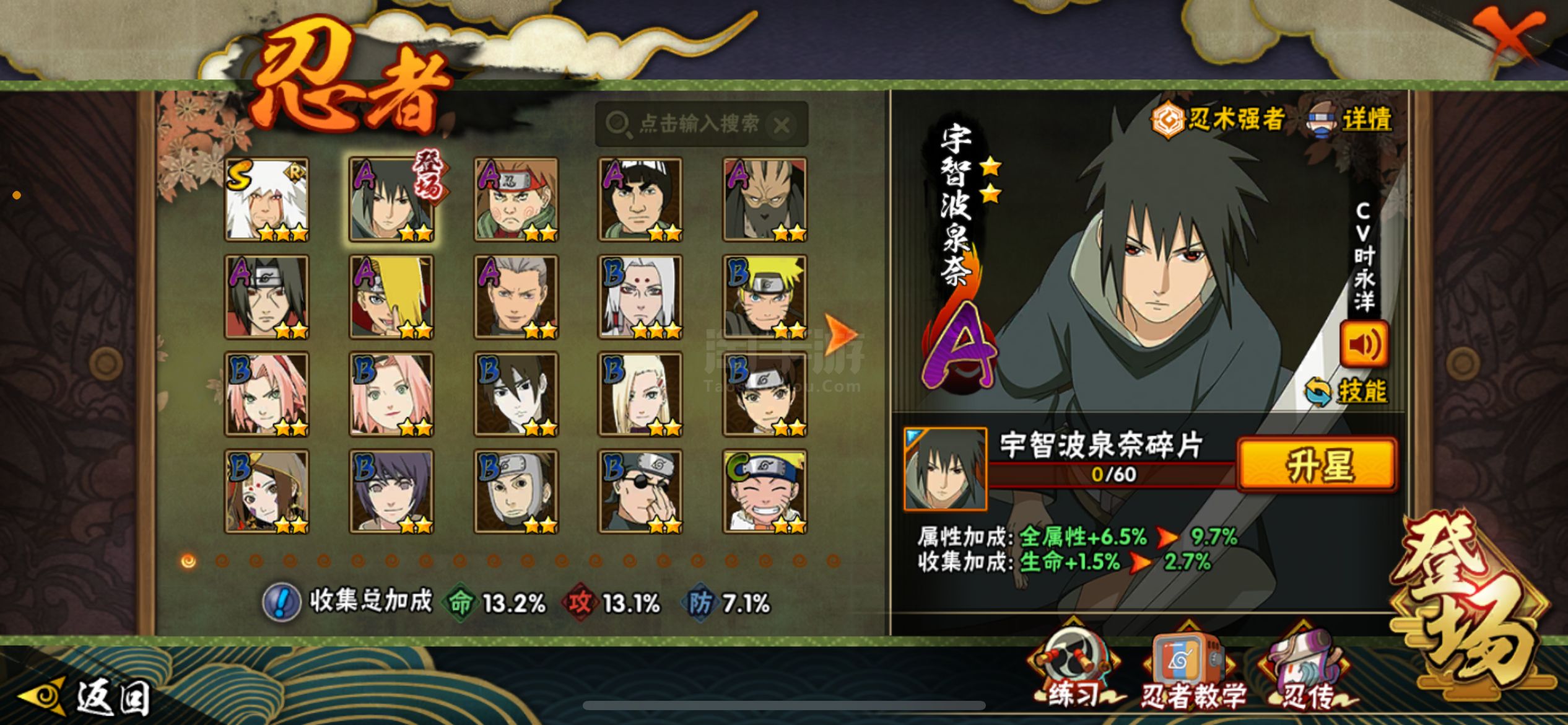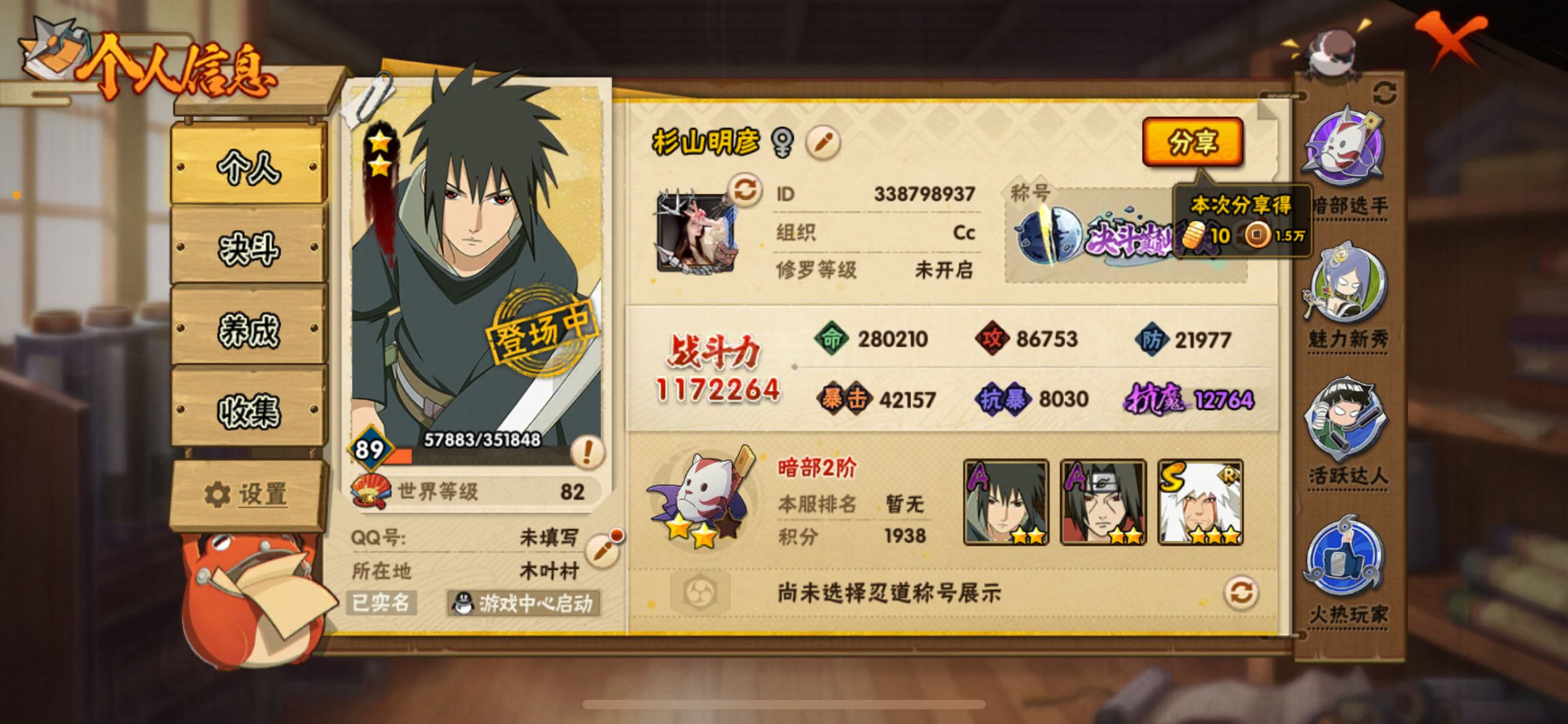 组织首长排行前十,战力117万,活动有须佐鼬百战,三忍自来也差26片包出的