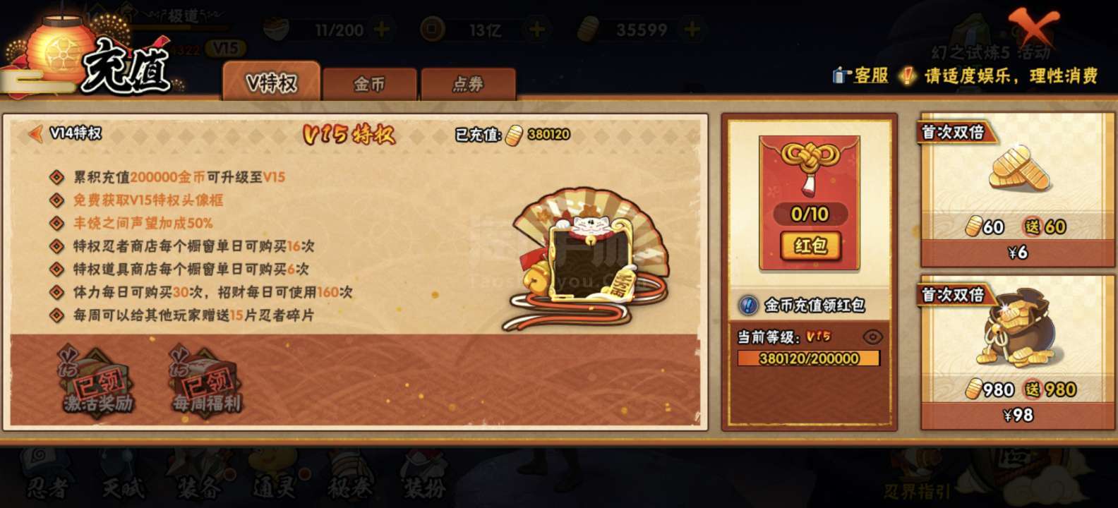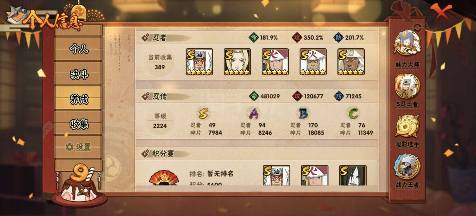 榜第六,新忍发帖已购,福袋里面11800,绿水200多万。忍具套装好几个差一个配齐,V15 49s