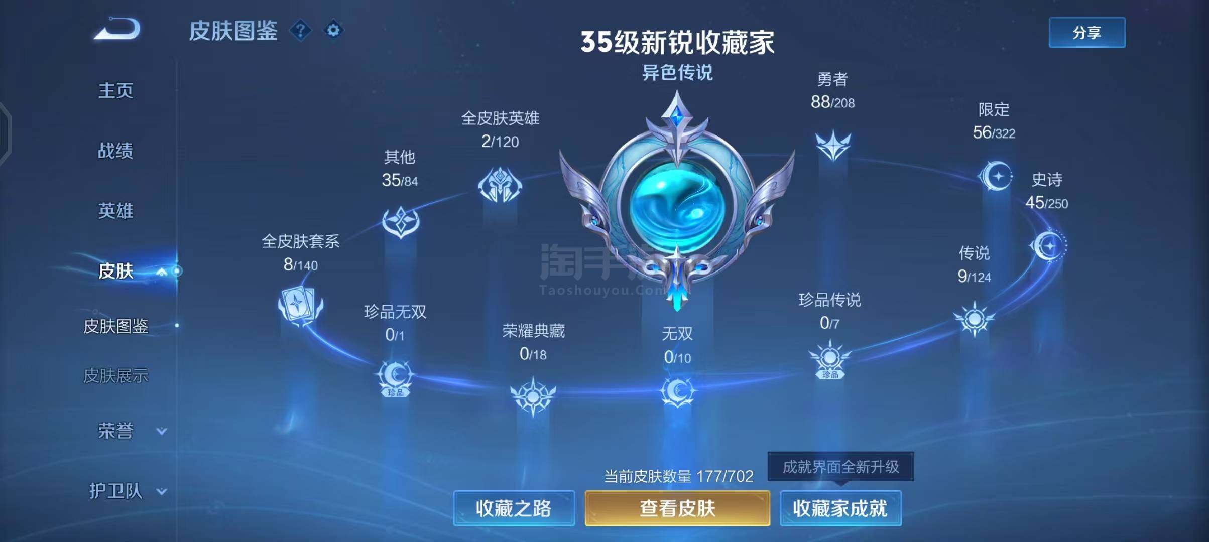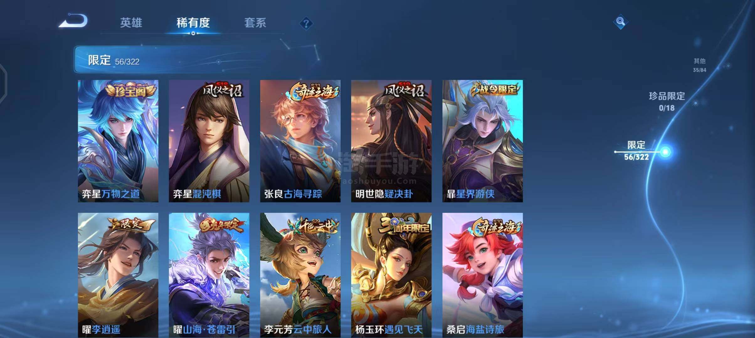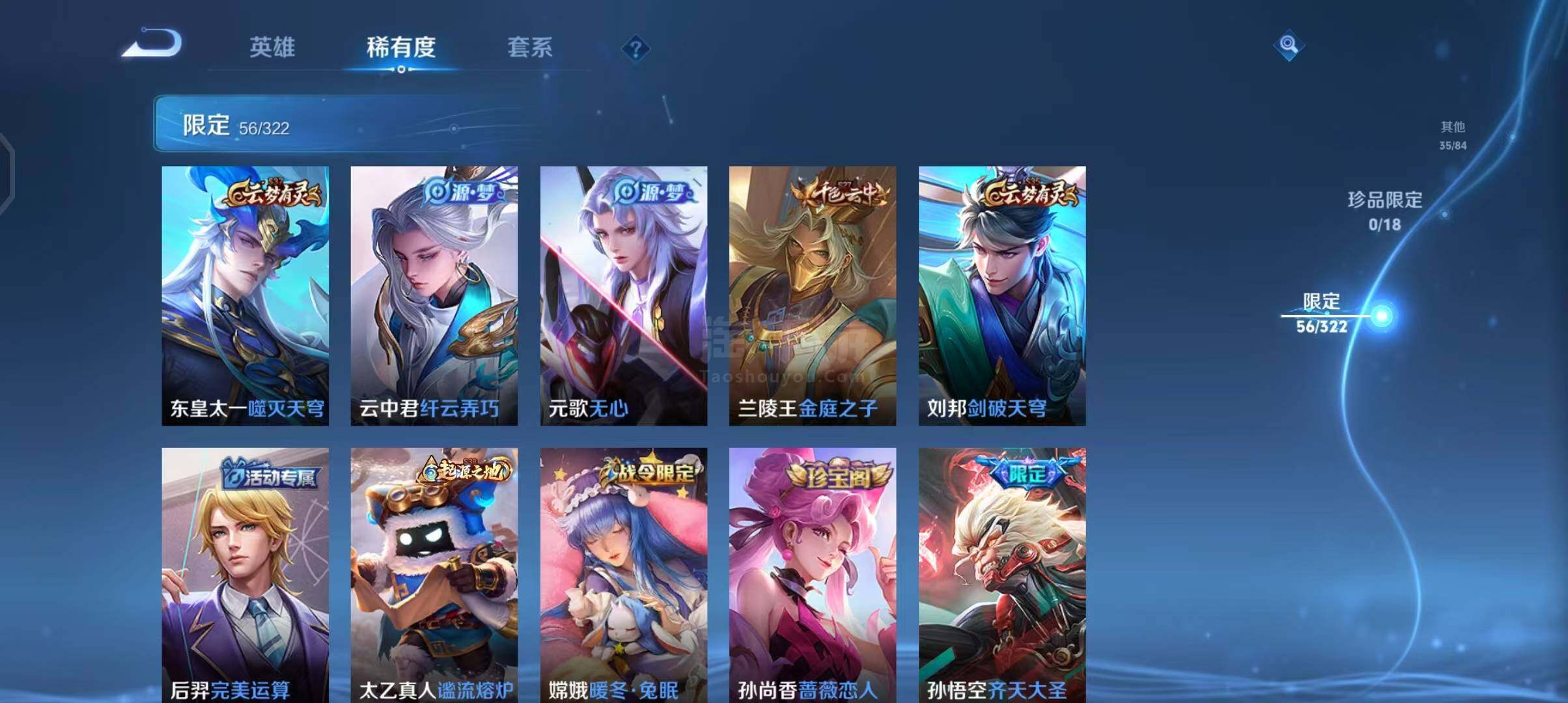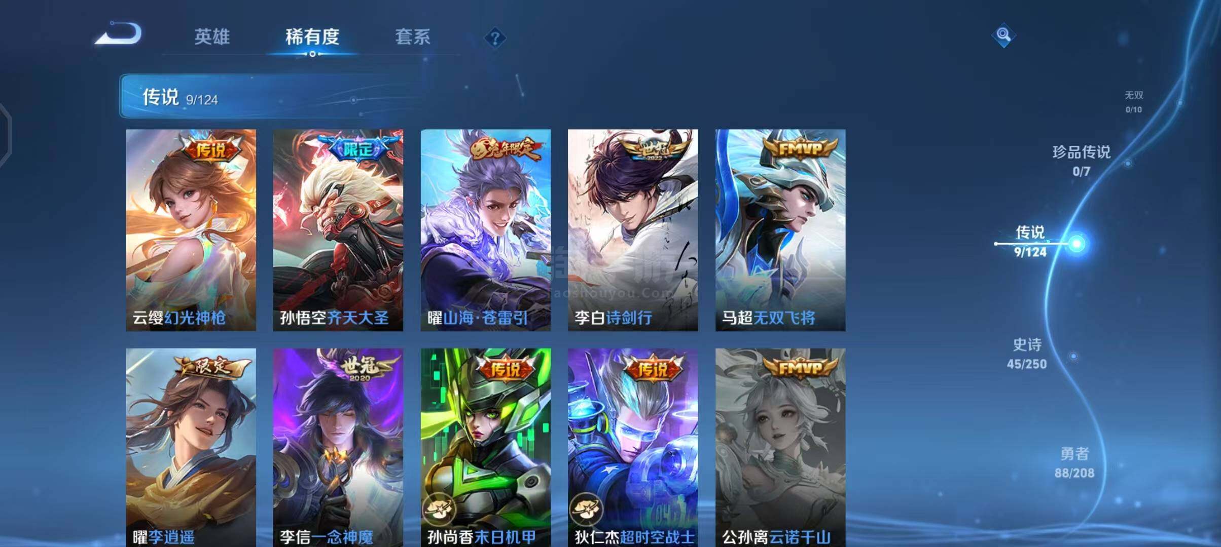 【传说皮肤】:狄仁杰超时空战士,孙尚香末日机甲,李信一念神魔,曜李逍遥,马超无双飞将,李白诗剑行,曜山海苍雷引,孙悟空齐天大圣
