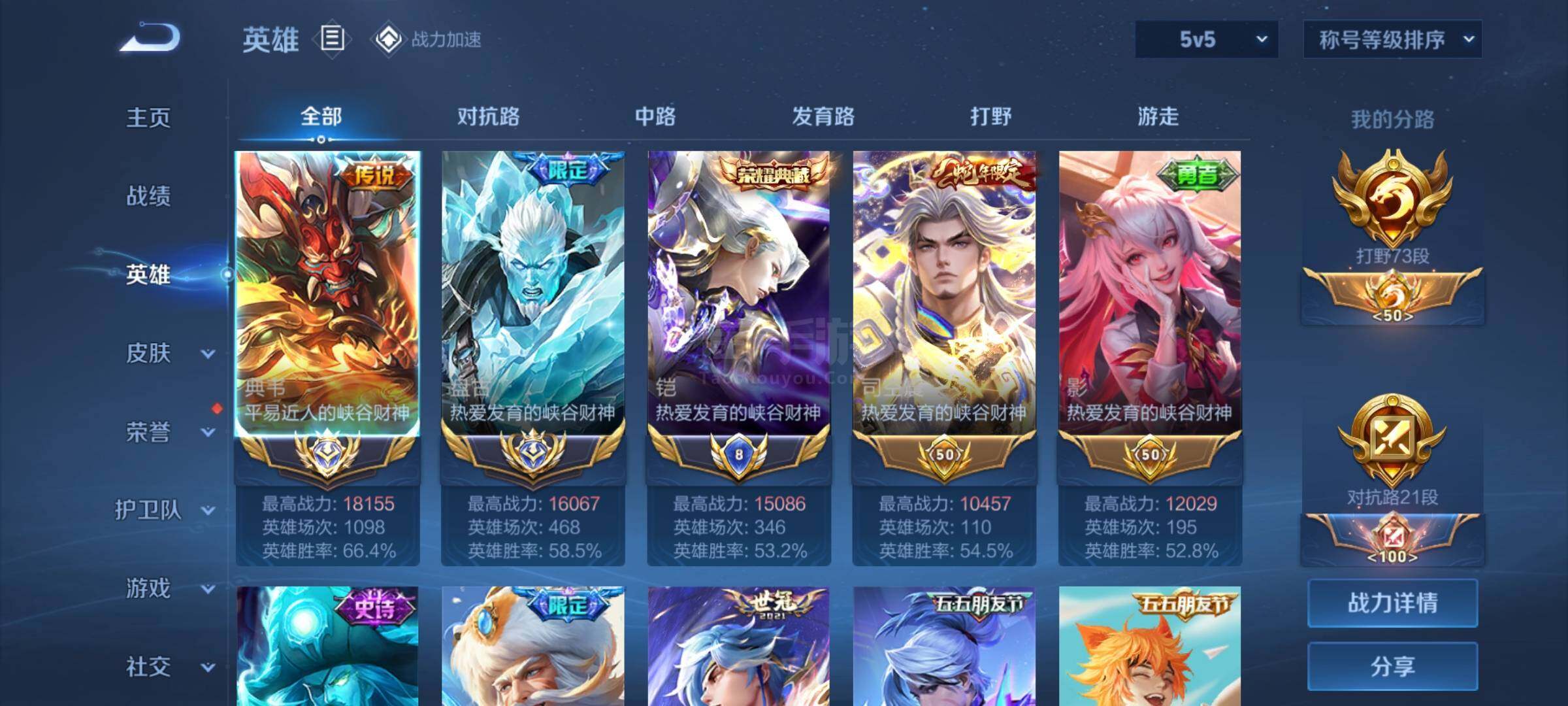 【商品标题】:低场次73段打野双国服典韦盘古小国凯,国服典韦1.8w战,国服盘古1.6w战,小国凯1.5w战,有魔方,安卓Q-V7-最强王者段位-85英雄-111皮肤-1典藏-0无双-1珍品传说-14传说-33史诗