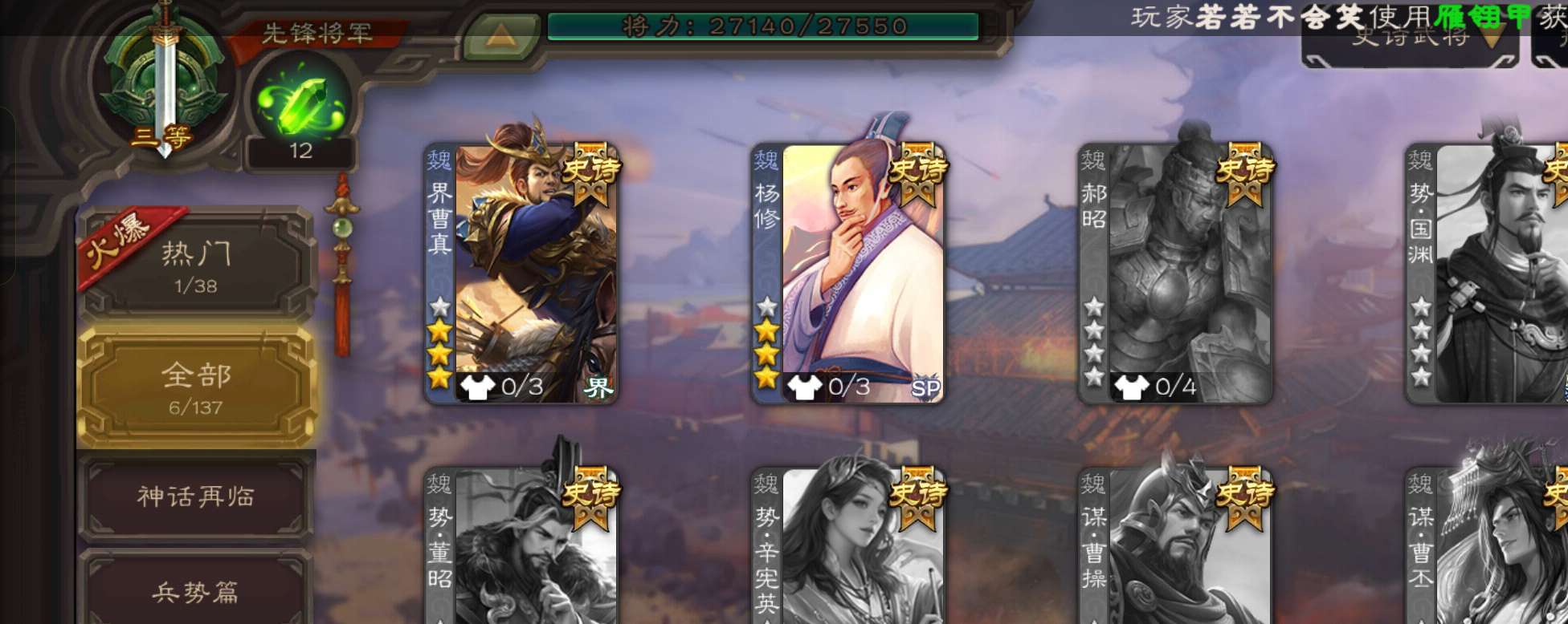 6史诗双神先锋,4万豆,回廊动态界黄忠诸葛瞻界曹真谯周杨修,神周瑜神吕蒙界孙权动态界陆逊143将