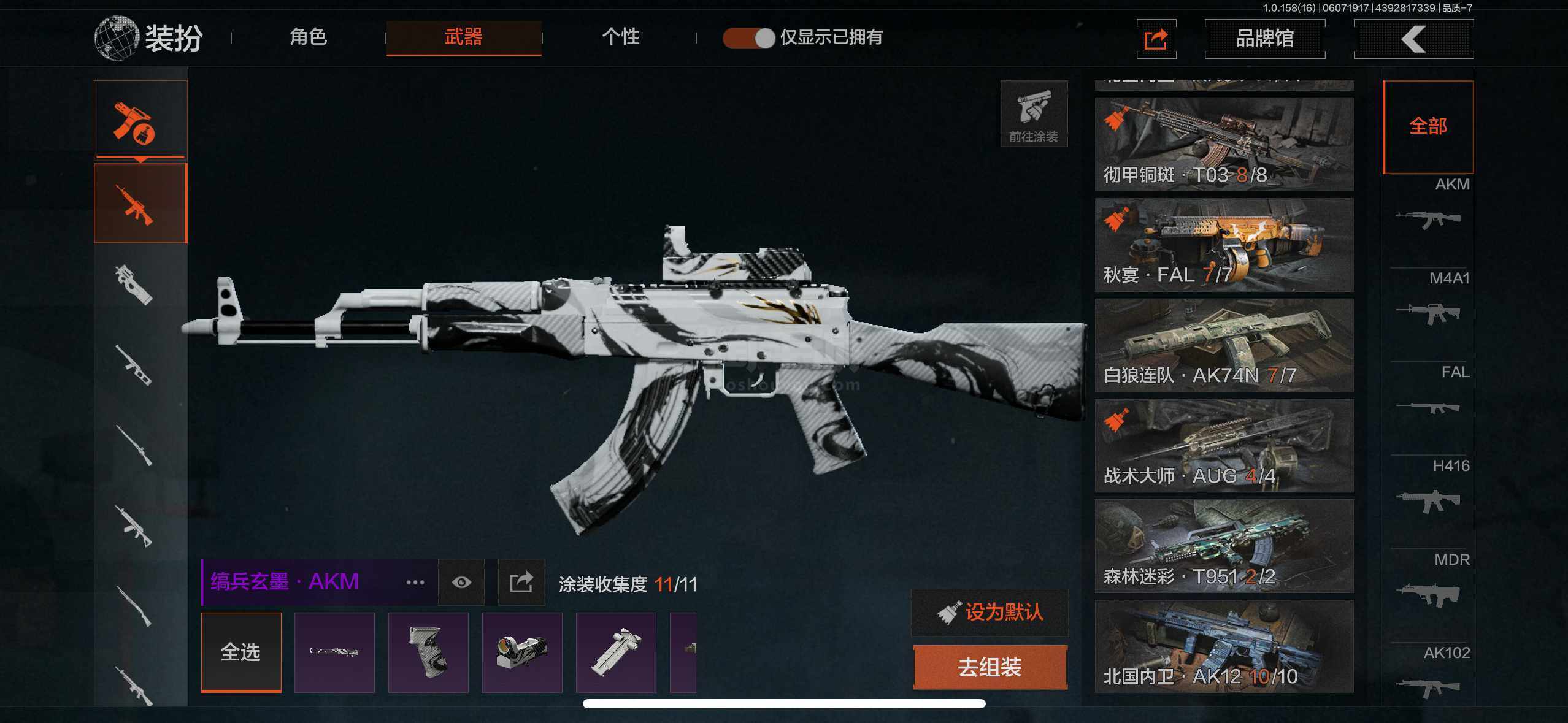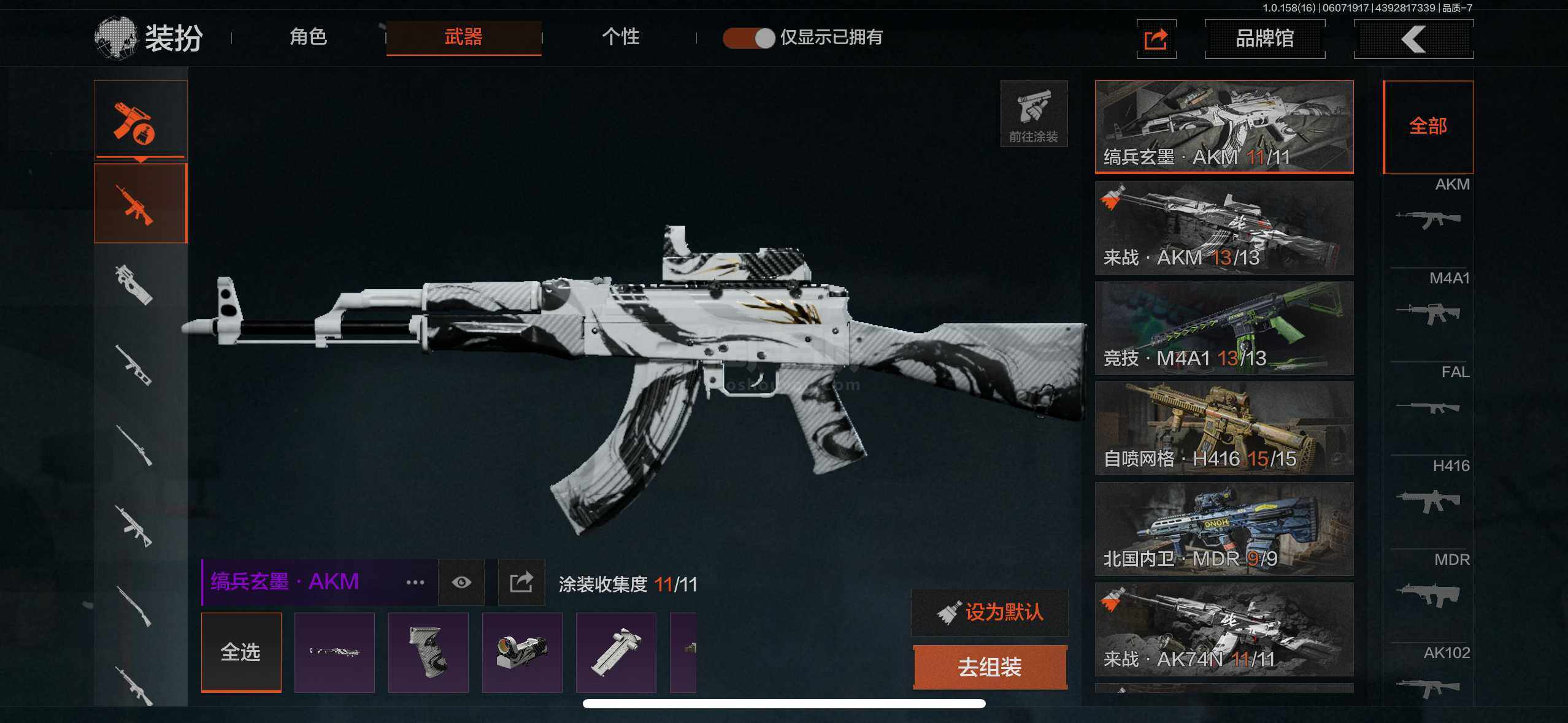 【紫色枪皮】:缟兵玄墨·AKM,来战·AKM,竞技·M4A1,自喷网格·H416,北国内卫·MDR,来战·AK74N,山地伪装·AK74N,骑士之剑·AKS74U,最后防线·AKS74U,竞技·