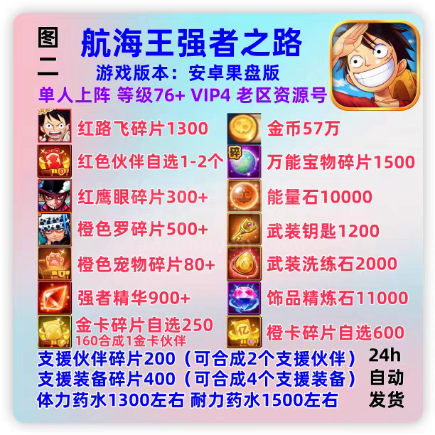❤️金币45W❤️红卡自选1-2个❤️红路飞碎片1000橙罗碎片500橙碎片自选300橙色宠物碎片