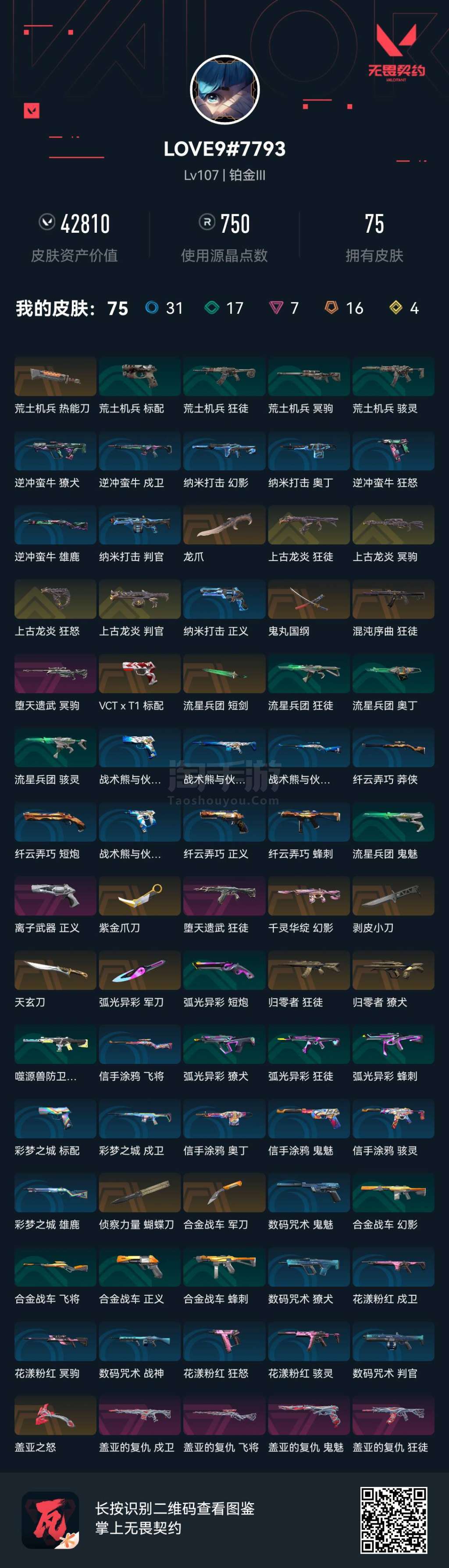 无畏契约【端游】R19910 剩余点券:147 皮肤价值:42810 剩余R点: 游戏等级:107 段位:未定级 英