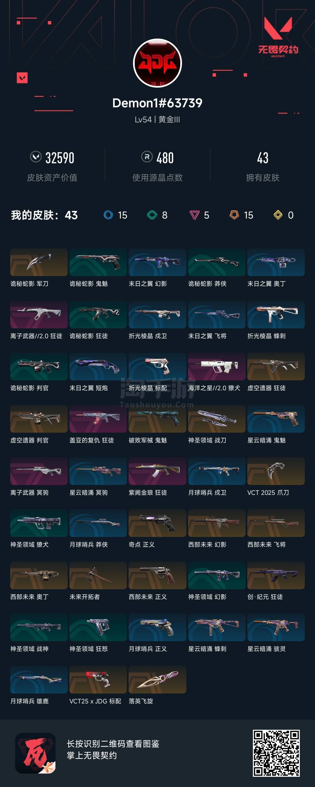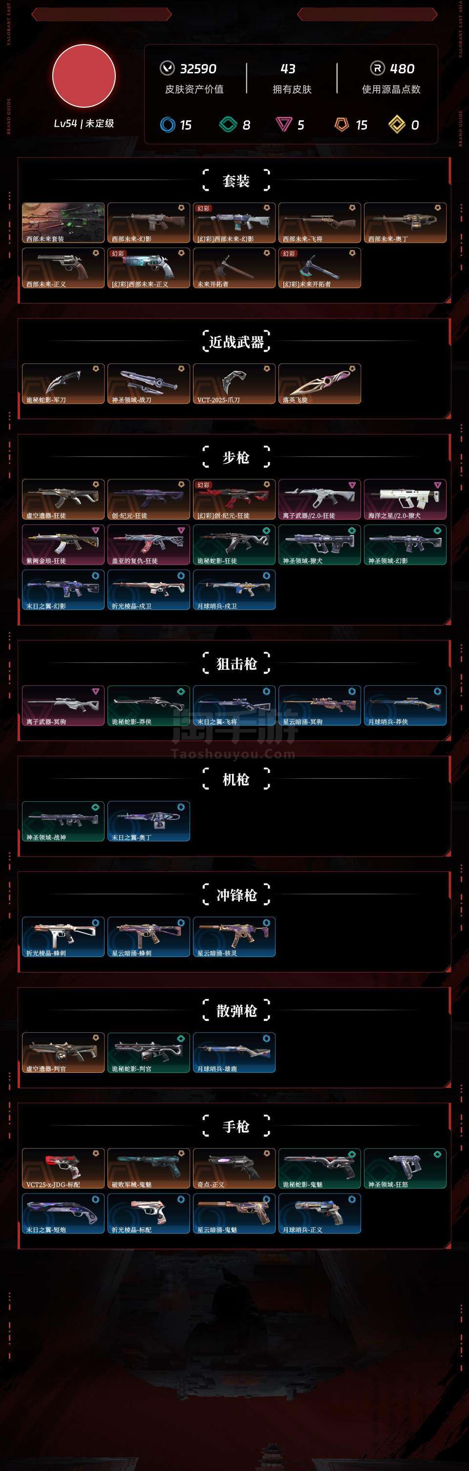 无畏契约【端游】R20357,有二次,剩余点券:2076, Lv54 ,皮肤总价值32590,未定级,总皮肤43,刀