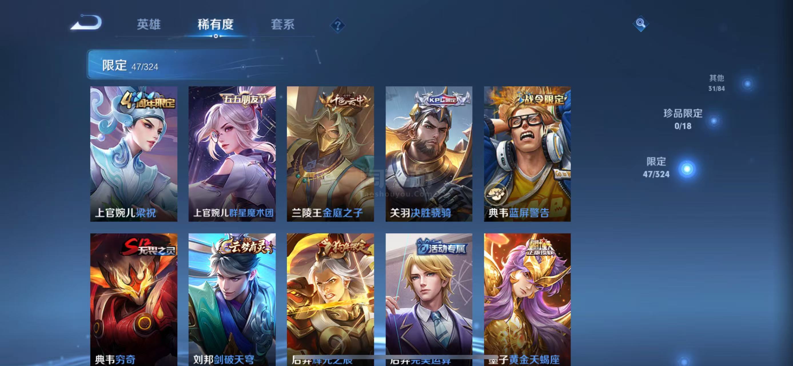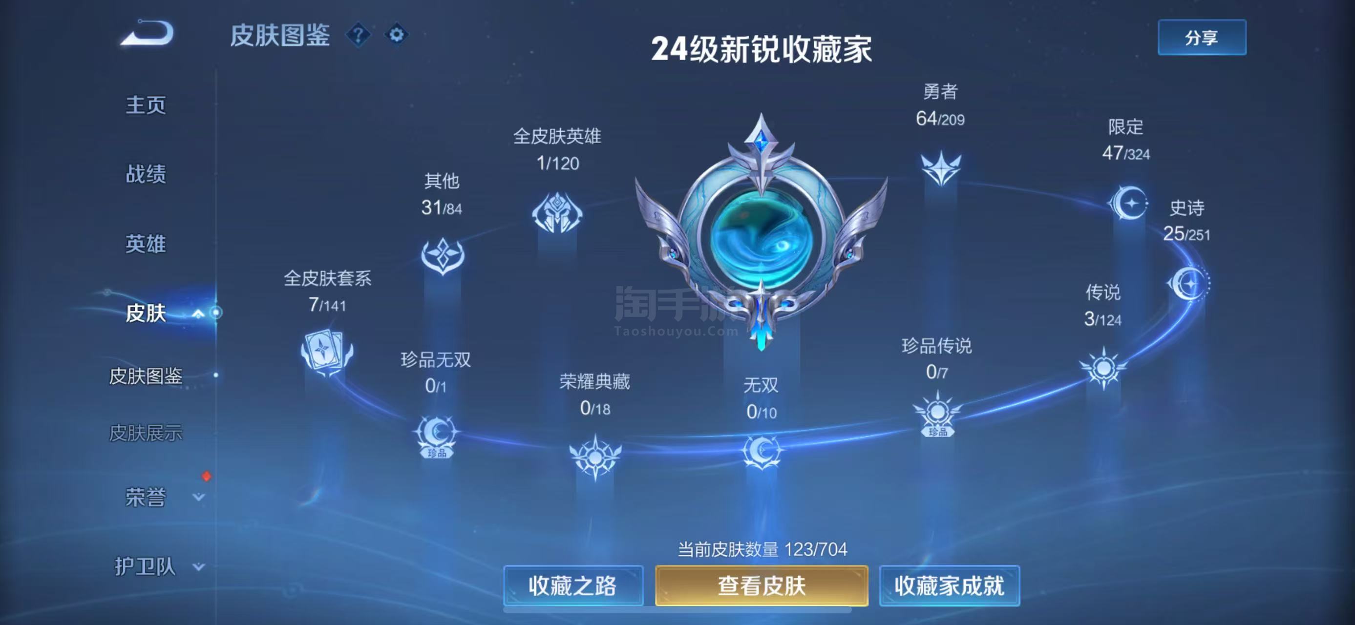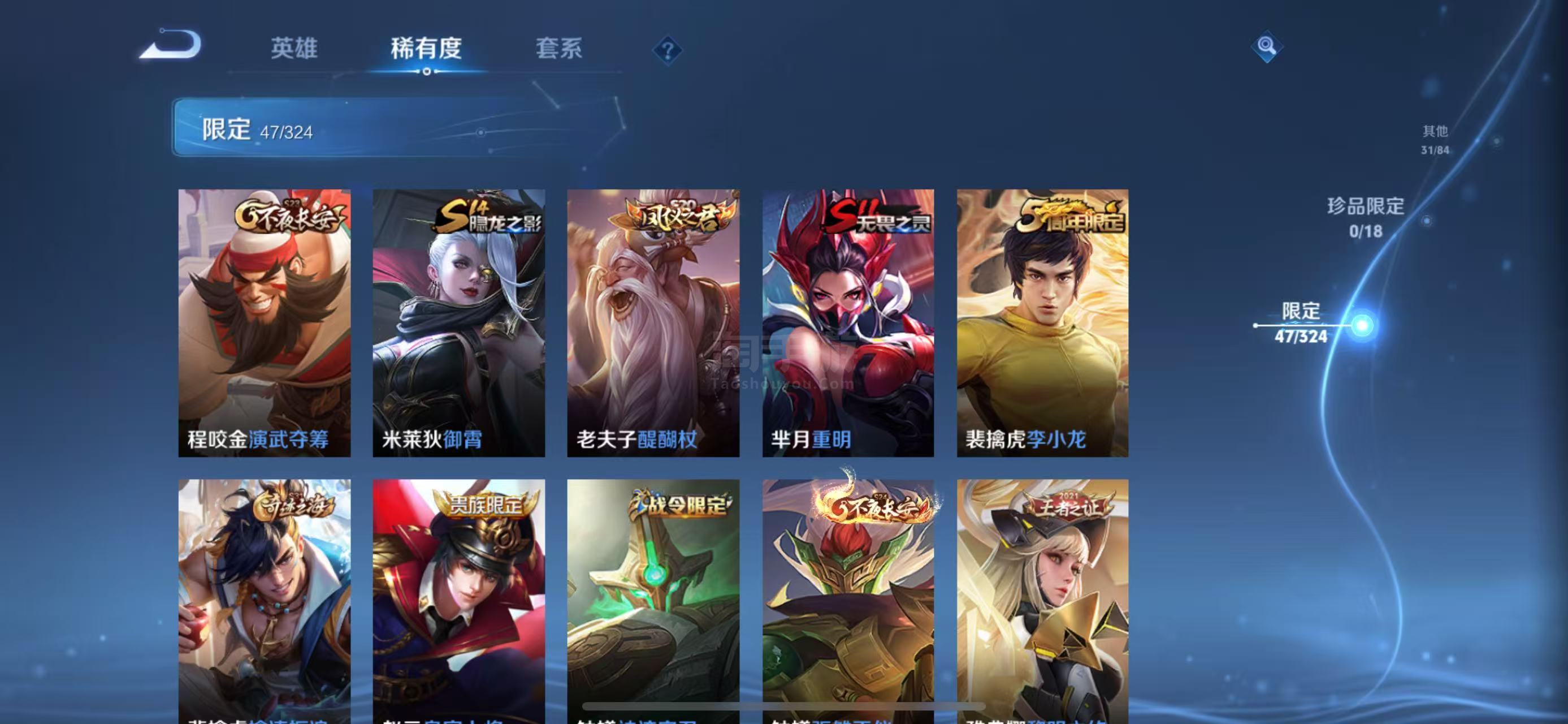 王者荣耀-苹果QQ 贵族6 传说皮肤3 史诗皮肤24 皮肤数量123 皮肤价值:67716 英雄121 荣耀黄金III 【内测皮肤】1 孙尚香_蔷薇恋人【传说皮肤】3 墨子_黄金天蝎座 狄仁杰_超时空战士 李白_诗剑行 【史诗皮肤】24 上官婉儿_群星魔术团 狄仁杰_魔术师 赵云_皇家上将 后羿_辉光之辰 花木兰_水晶猎龙者 马超_神威 裴擒虎_李小龙 上官婉儿_梁祝 鲁班七号_狮舞东方 典韦_蓝