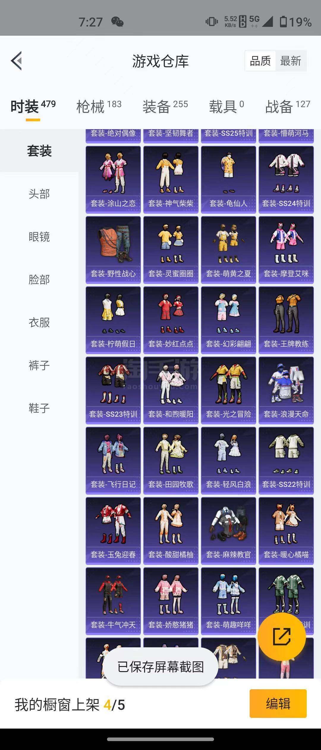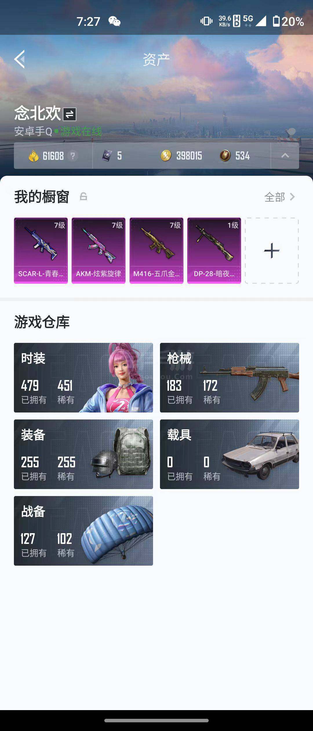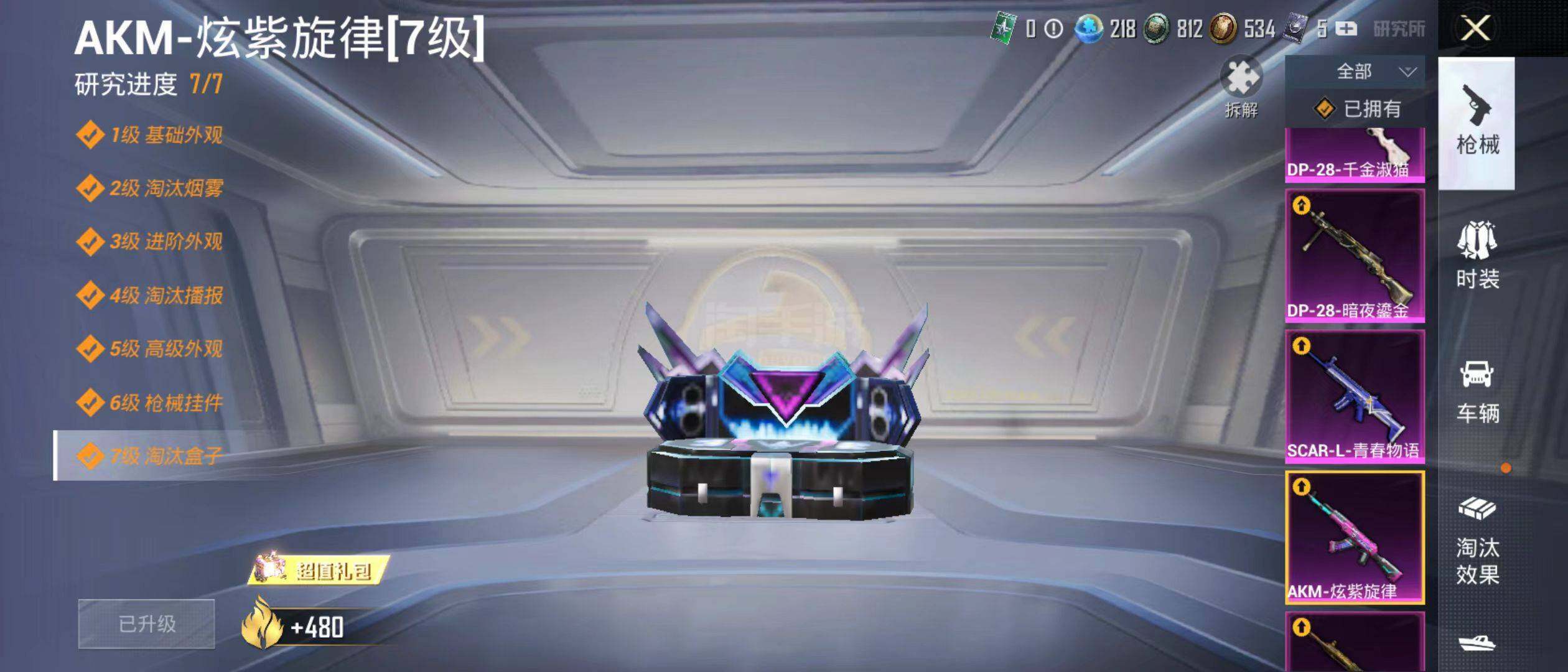 【特效枪等级】:AKM-炫紫旋律(七级),SCAR-L-青春物语(七级),M416-五爪金龙(七级),Kar98K-巳巳如意(五级),AMR-智耀战神(五级),DP-28-暗夜鎏金(一级),DP-28-千金淑猫(四级)