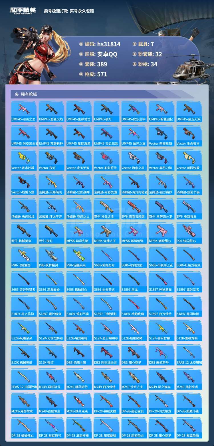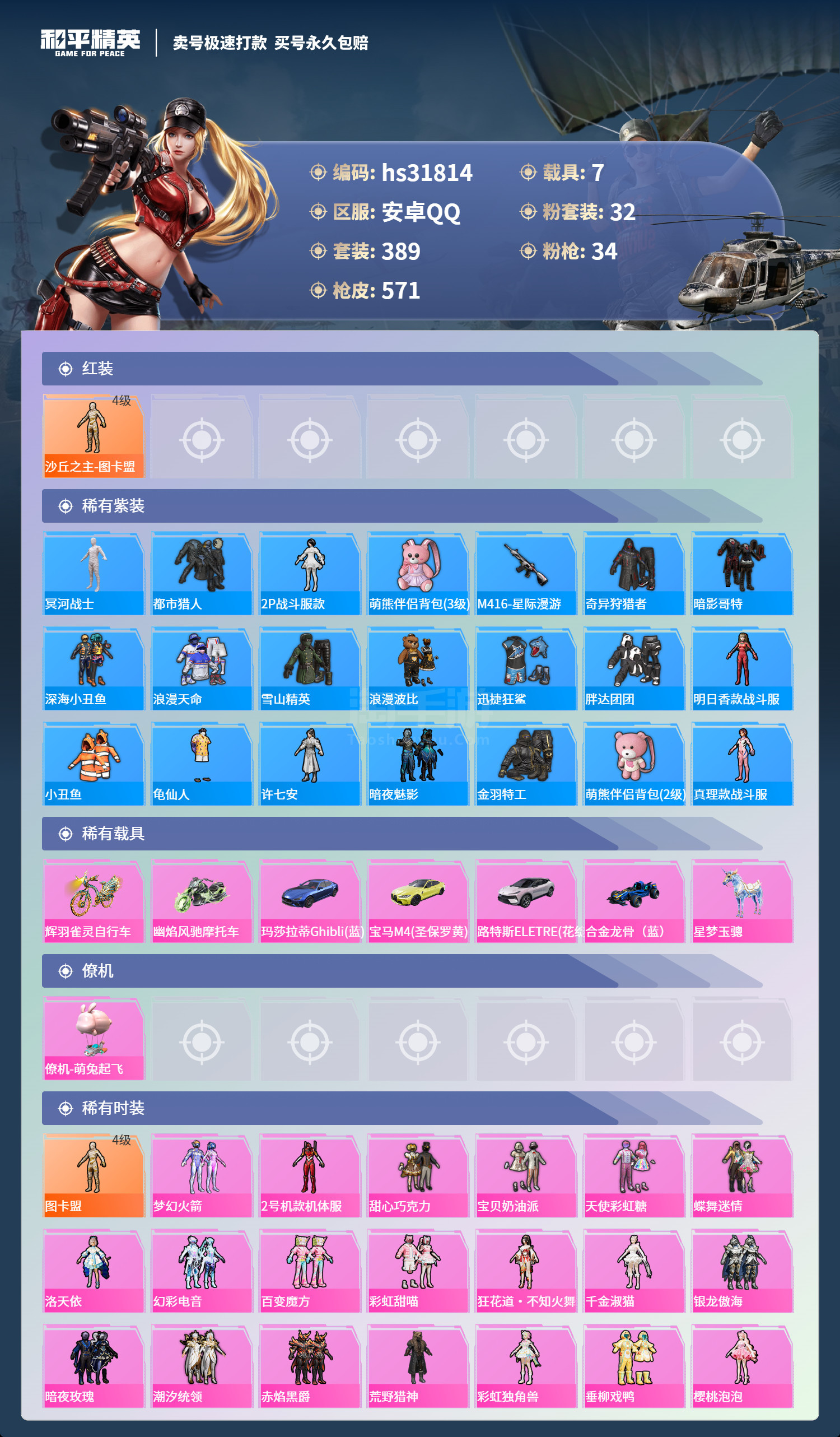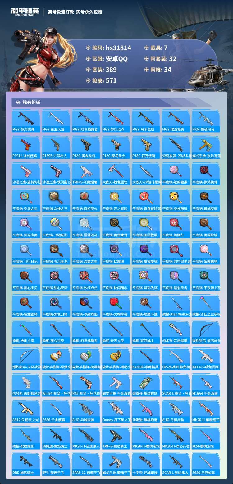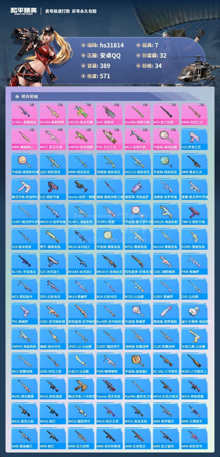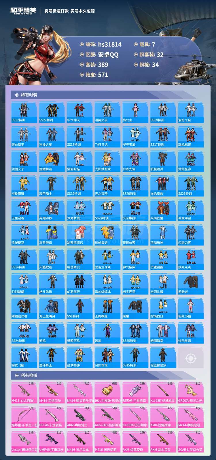 和平精英【安卓QQ】hs31814 安卓手Q-22王牌印记-32粉装-34特效枪-7载具-220042热力值-389套装