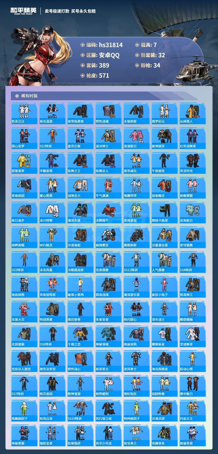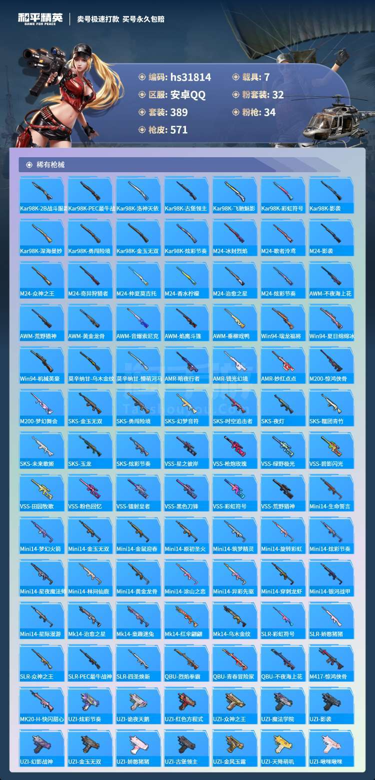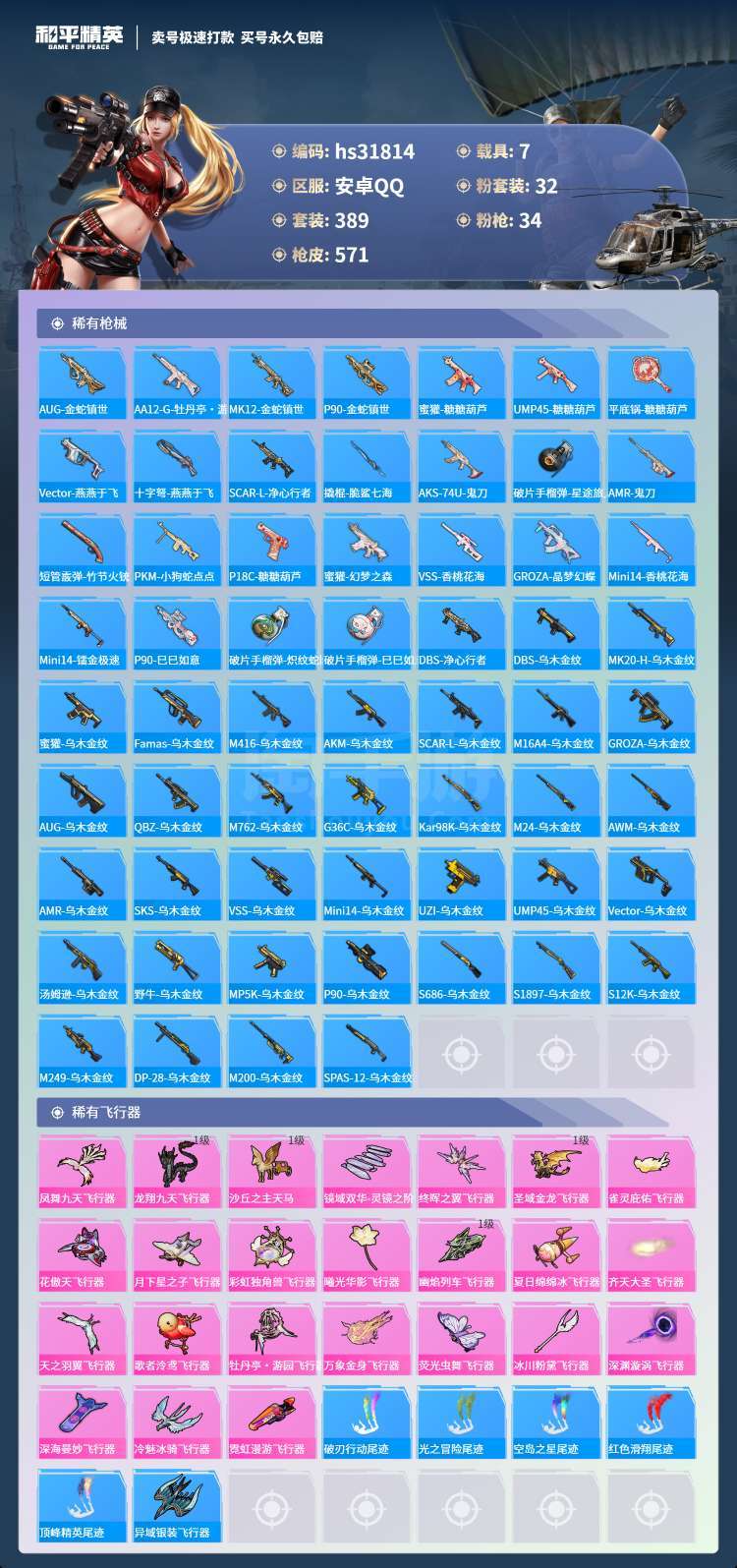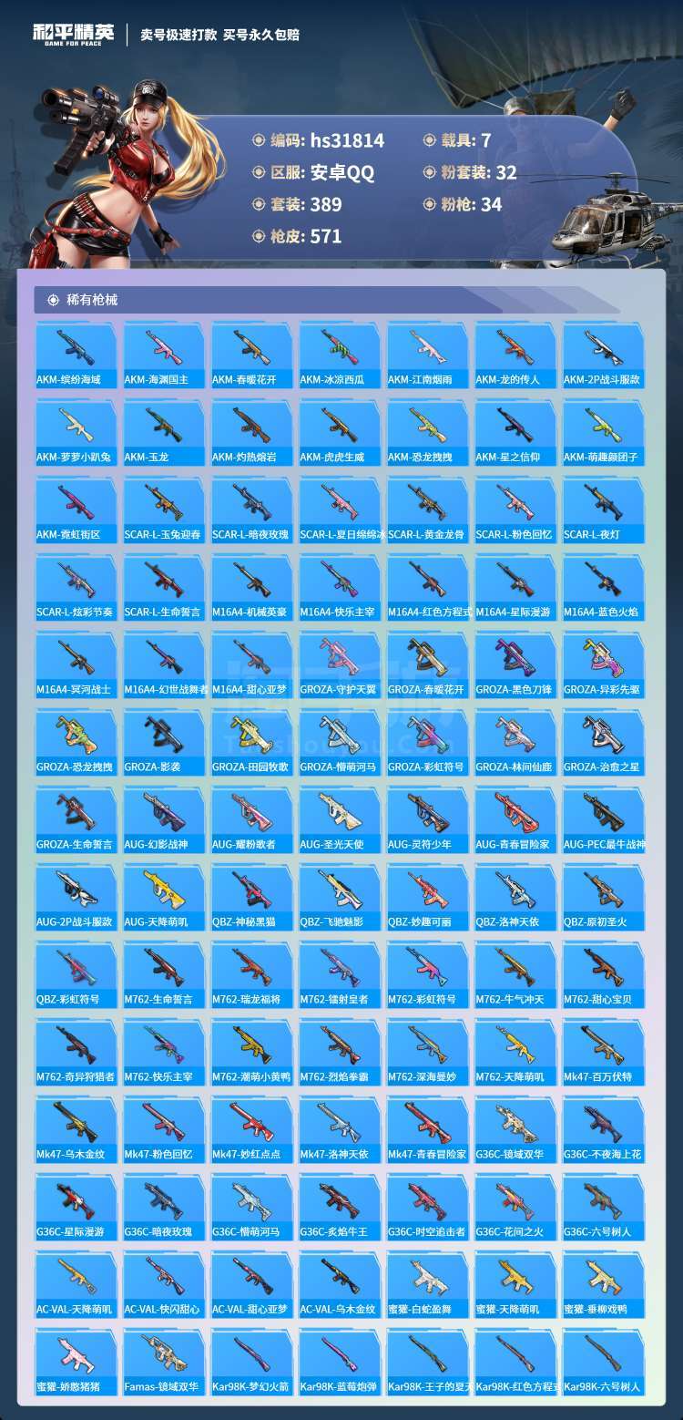 和平精英【安卓QQ】hs31814 安卓手Q-22王牌印记-32粉装-34特效枪-7载具-220042热力值-389套装