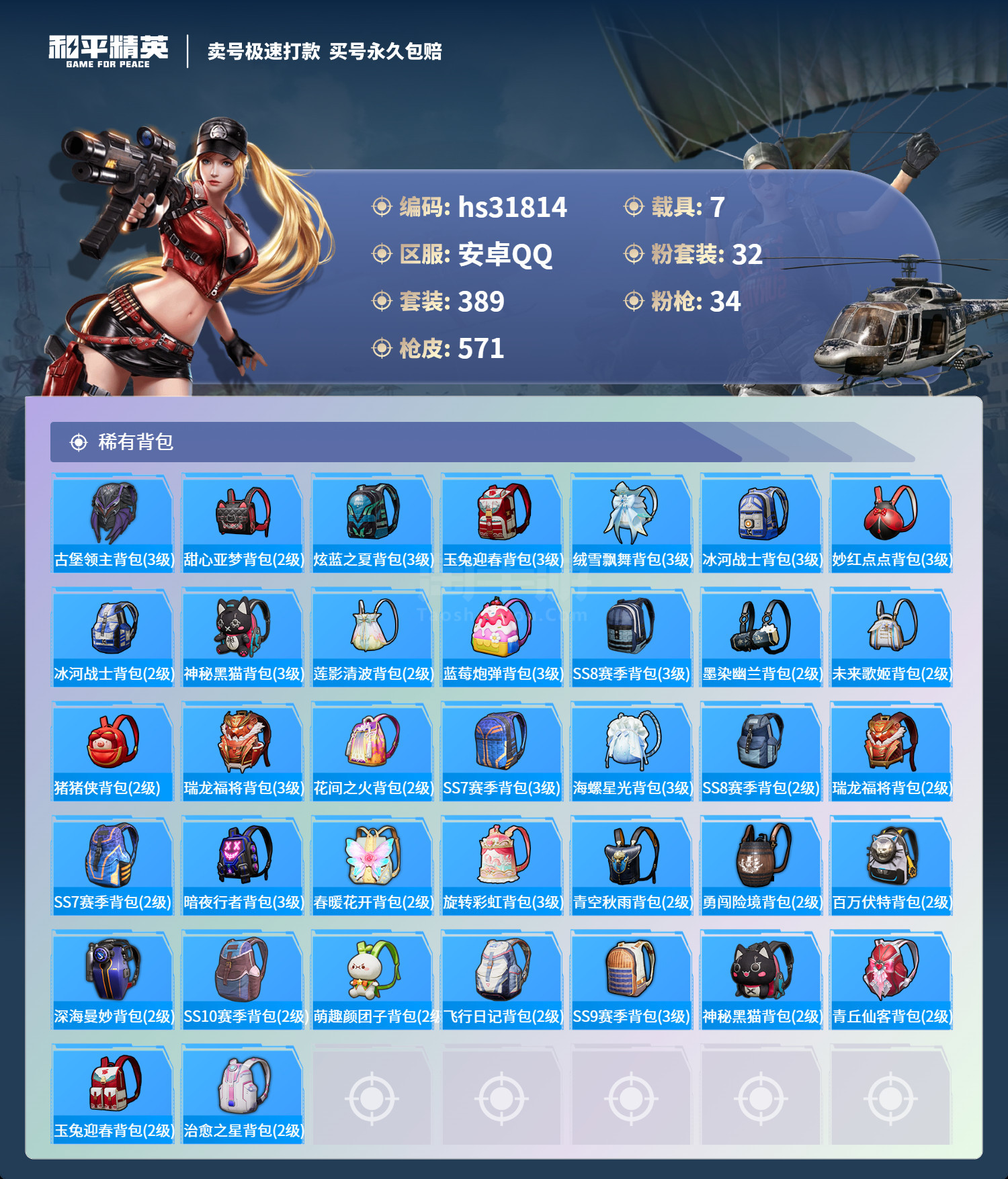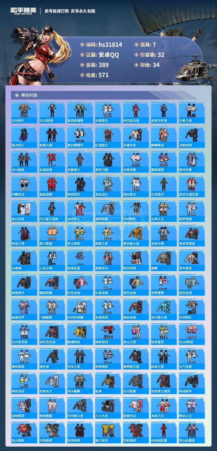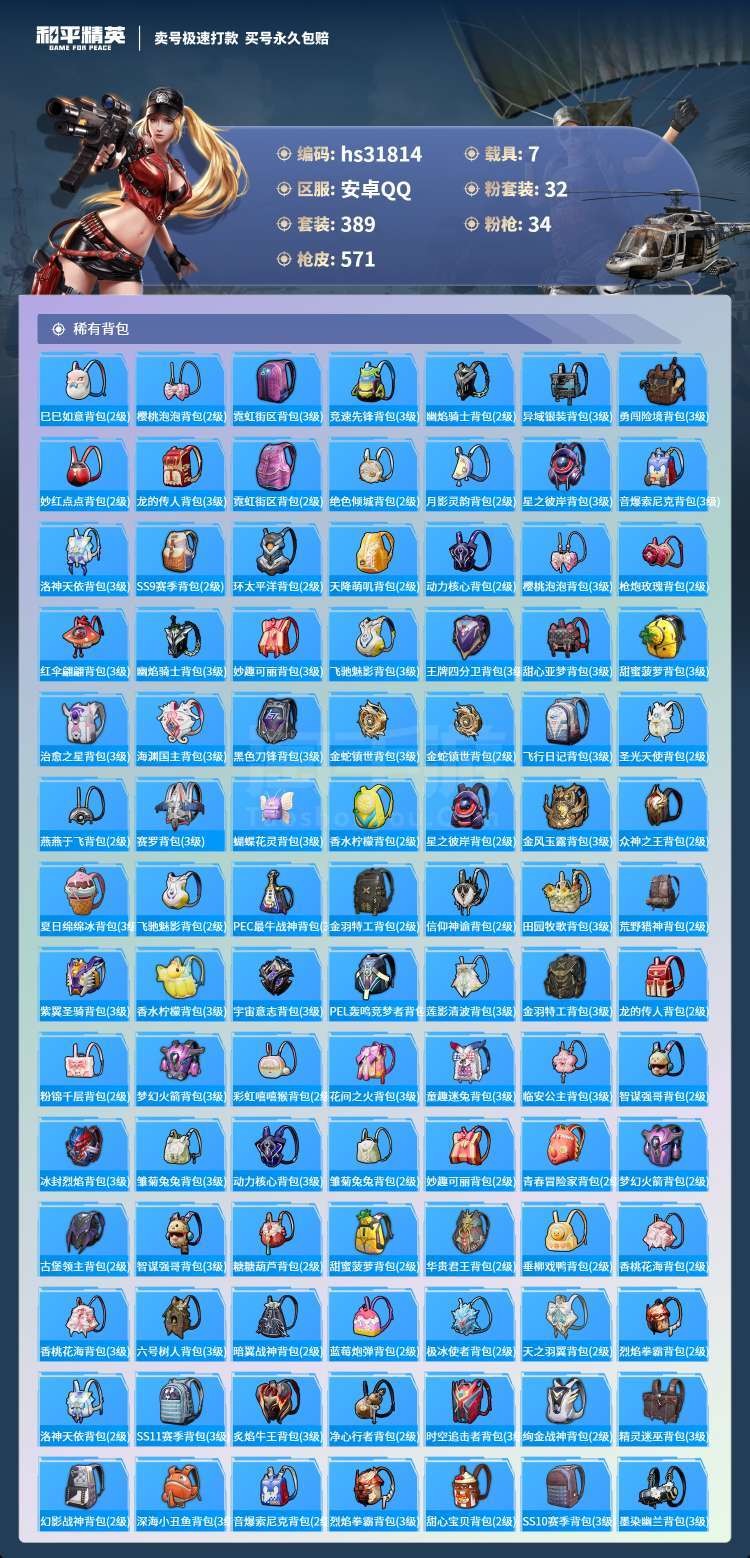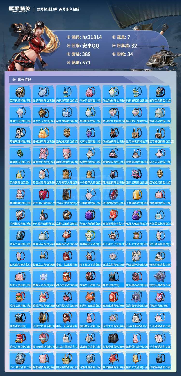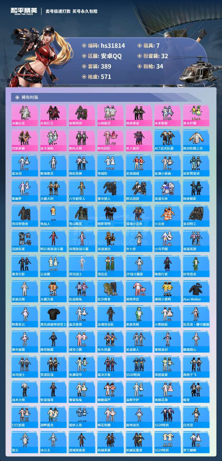 和平精英【安卓QQ】hs31814 安卓手Q-22王牌印记-32粉装-34特效枪-7载具-220042热力值-389套装
