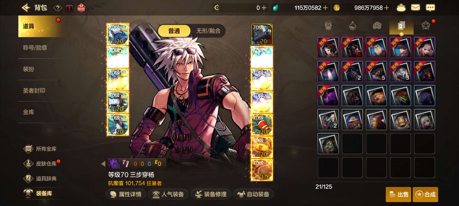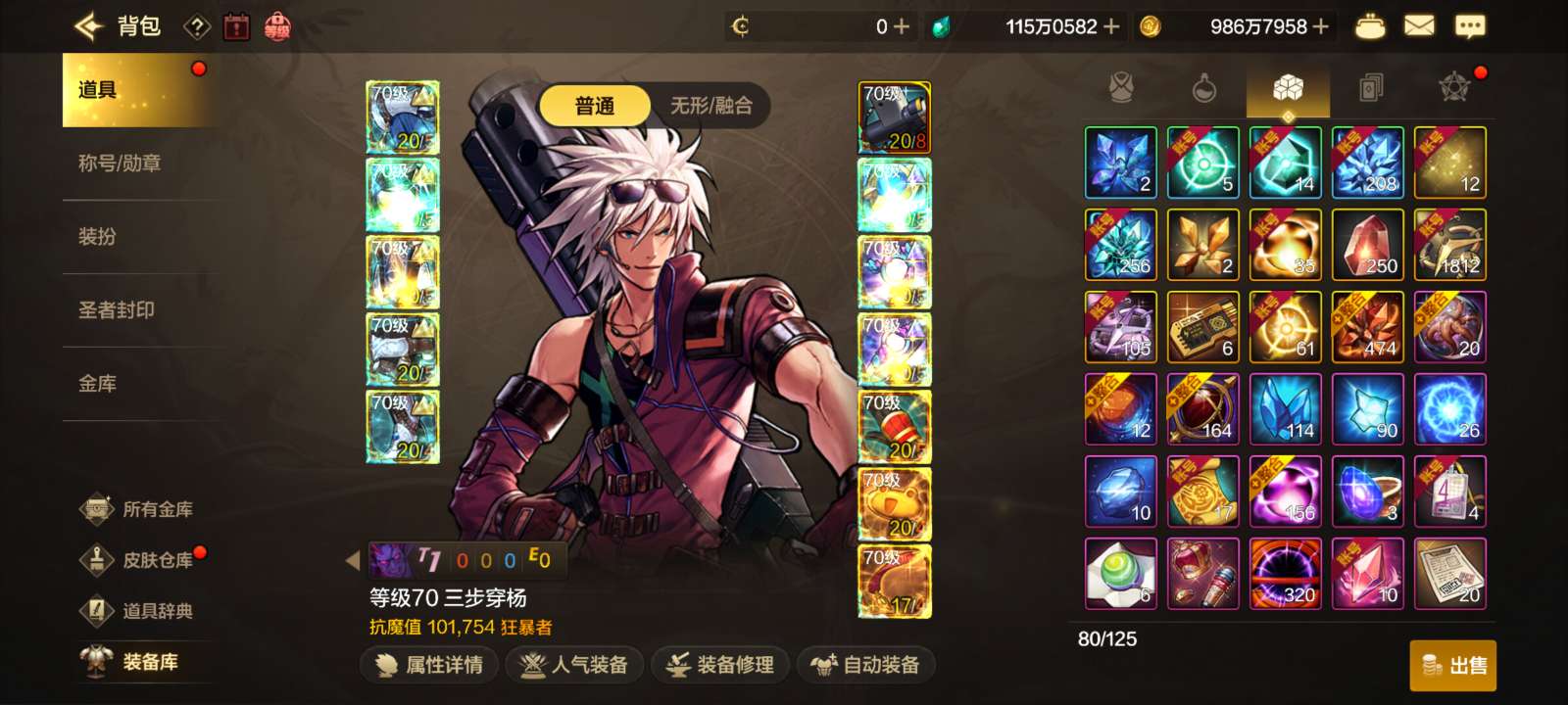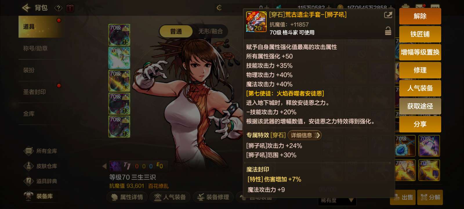 可二次,有百万泰拉,10万抗魔枪炮师,差一件全身20增幅四,有唐三藏装扮,白色天空套。气功有荒古手套