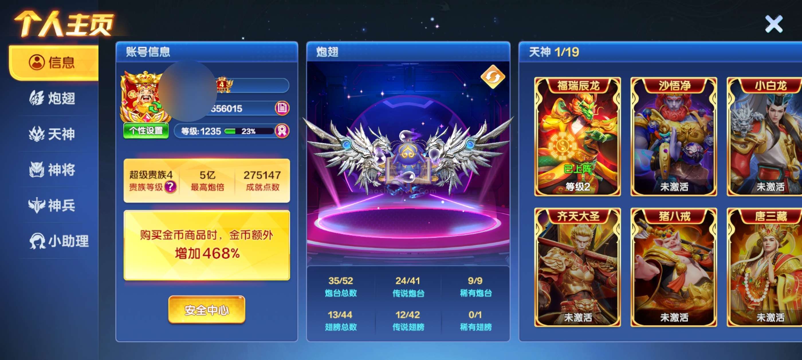 鱼大咖官方文字超级贵族S4,道具很多,极品号,充值20多万,可换绑,安卓苹果都可以玩