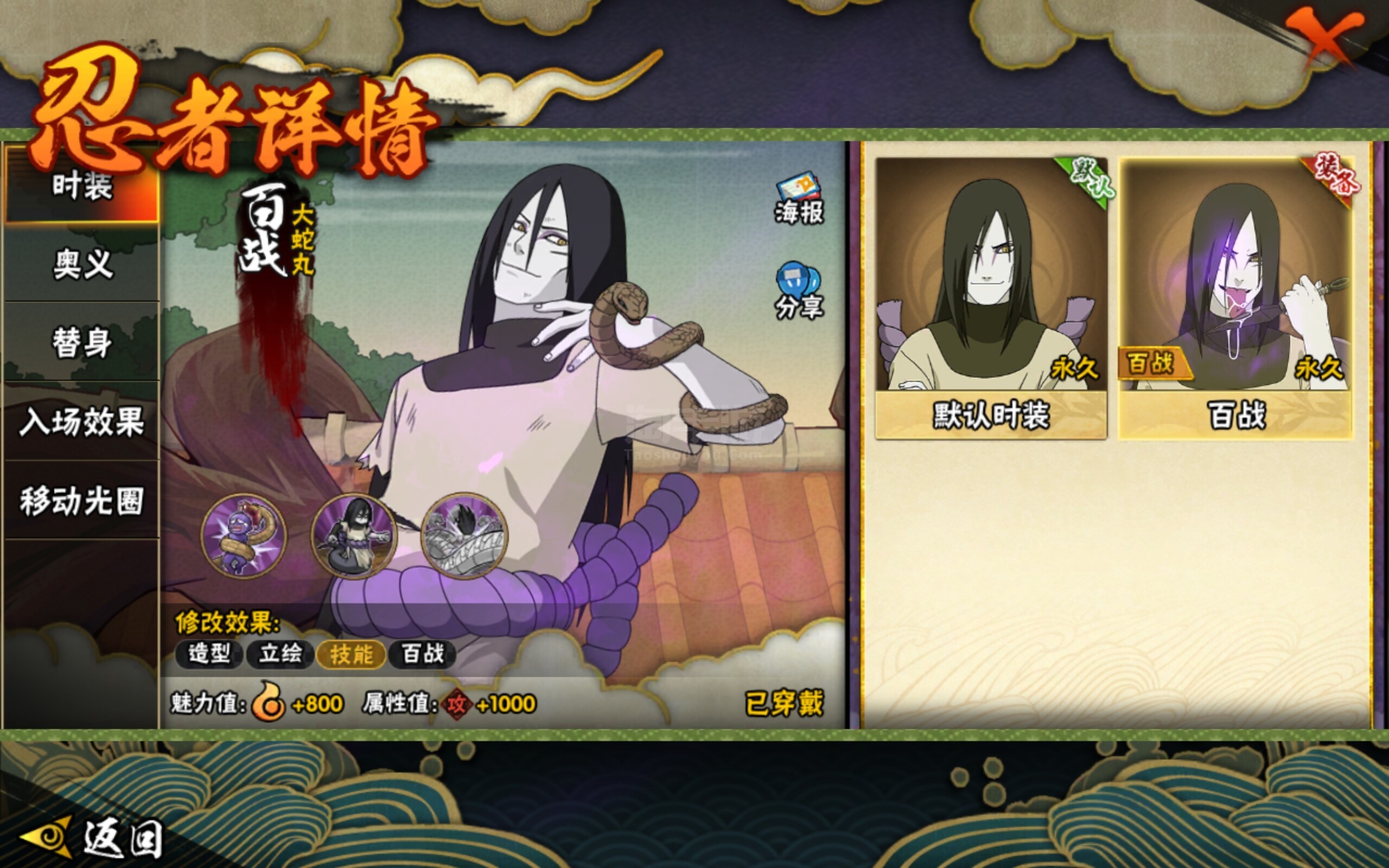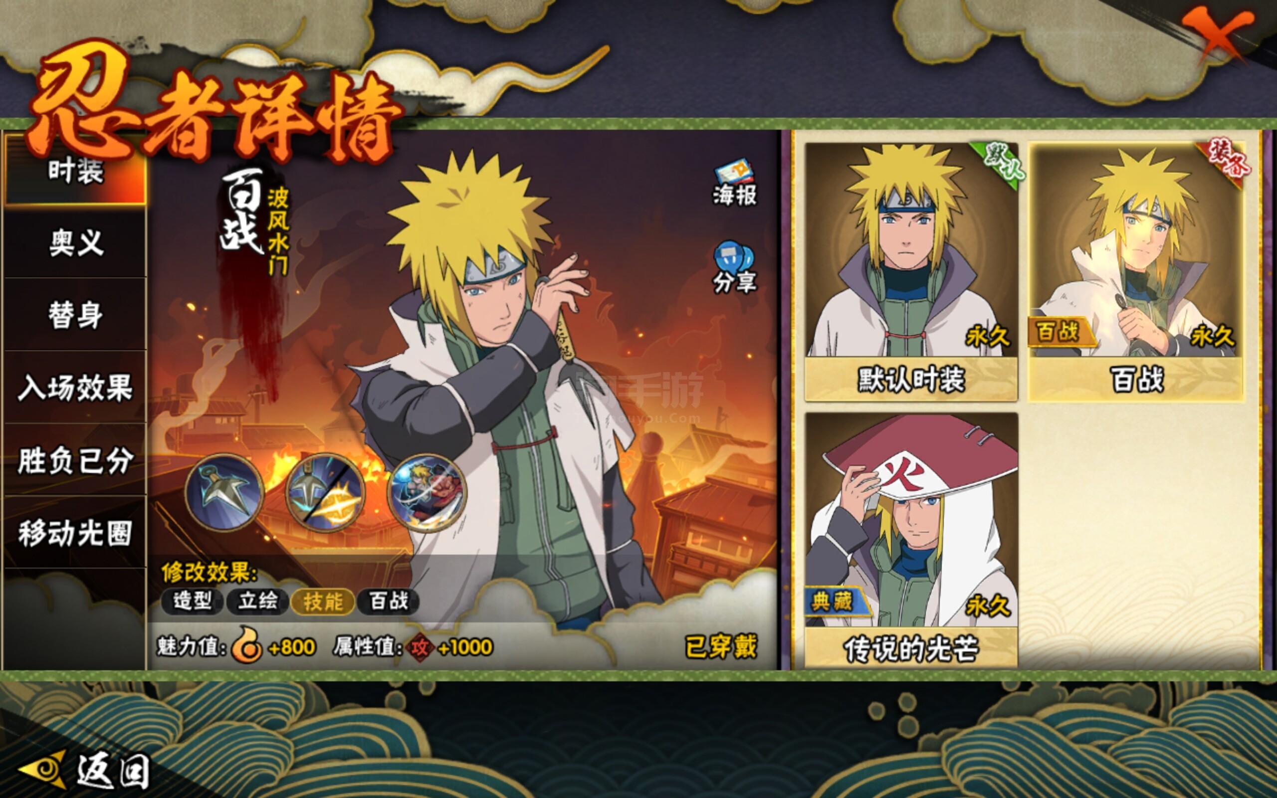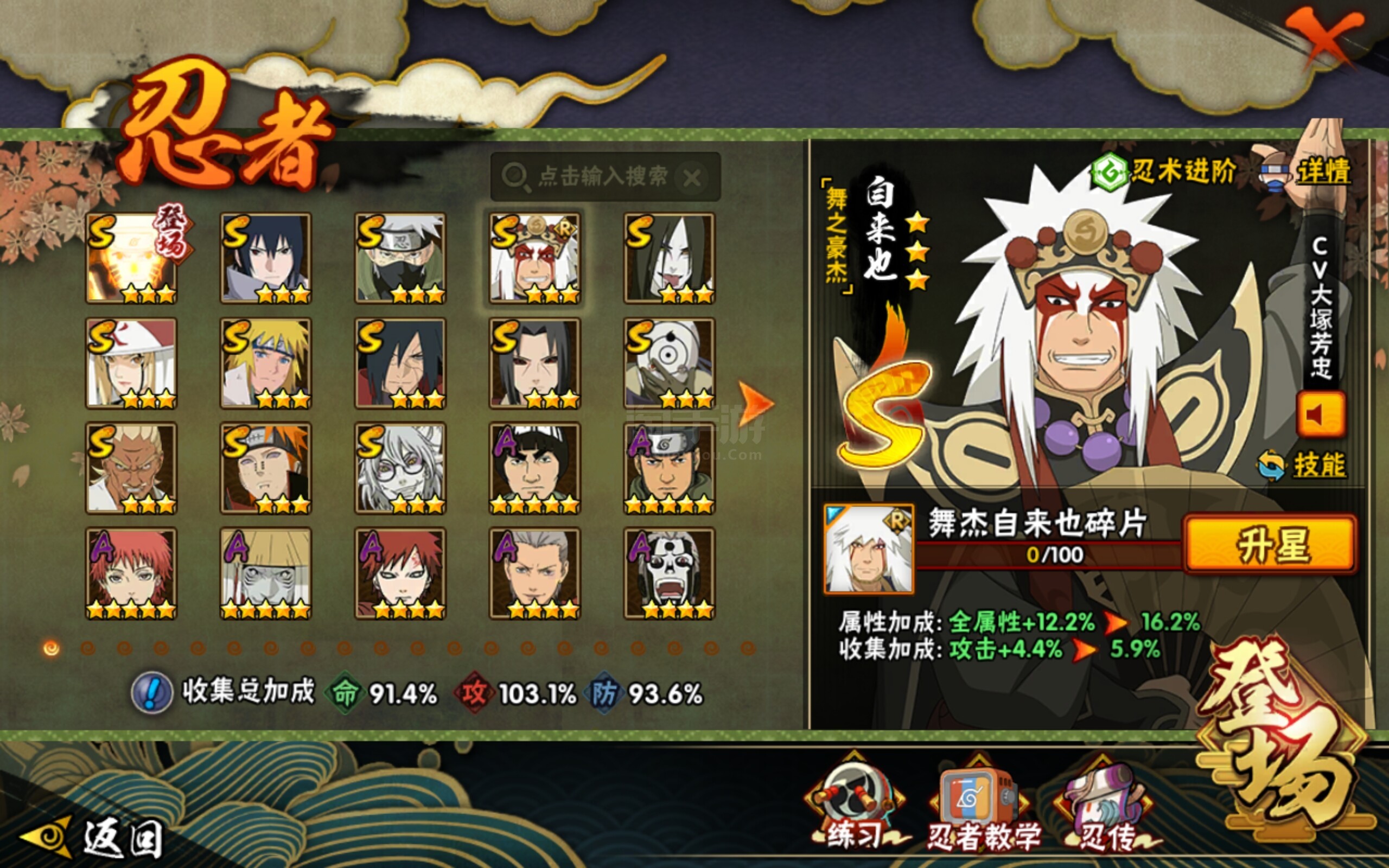 【S级忍者】:宇智波鼬「秽土转生」(3星),宇智波斑「秽土转生·解」(3星),艾「忍界大战」(3星),旗木卡卡西「须佐能乎」(3星),自来也「舞之豪杰」(3星),大蛇丸(3星),纲手「百豪」(3星),波风水门(3星),药师兜「仙人模式」(3星),漩涡鸣人「九喇嘛连结」(3星),佩恩「天道」(3星),宇智波佐助「永恒万花筒」(3星),宇智波斑