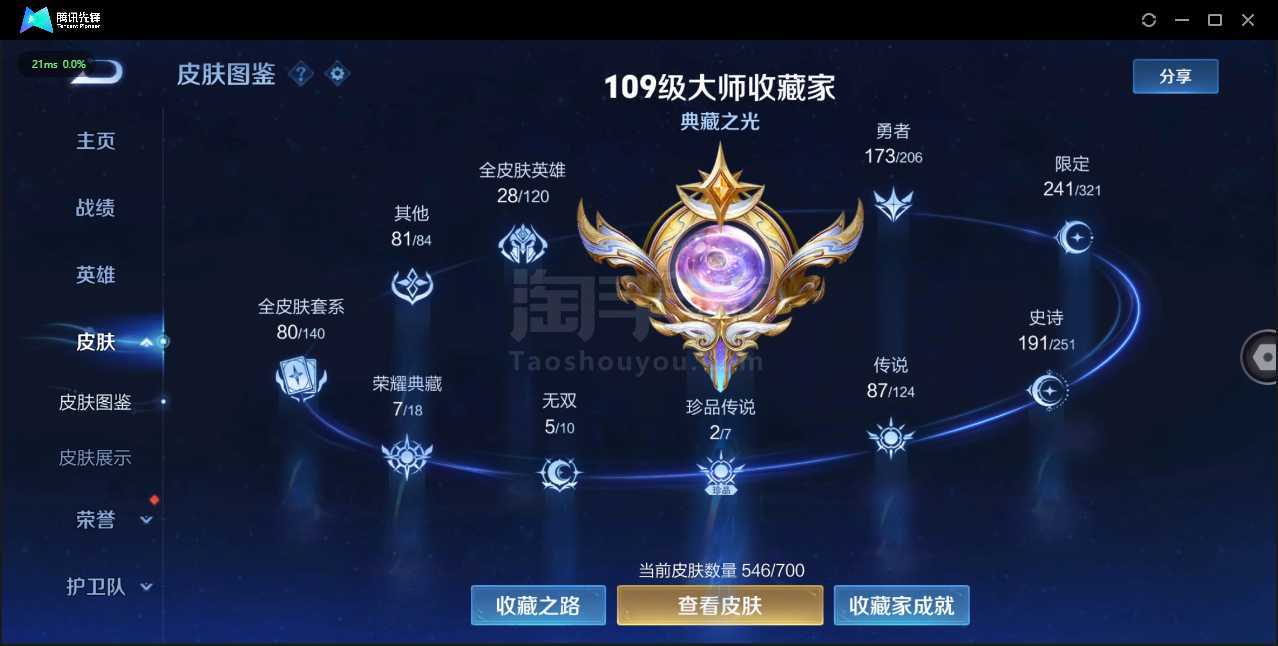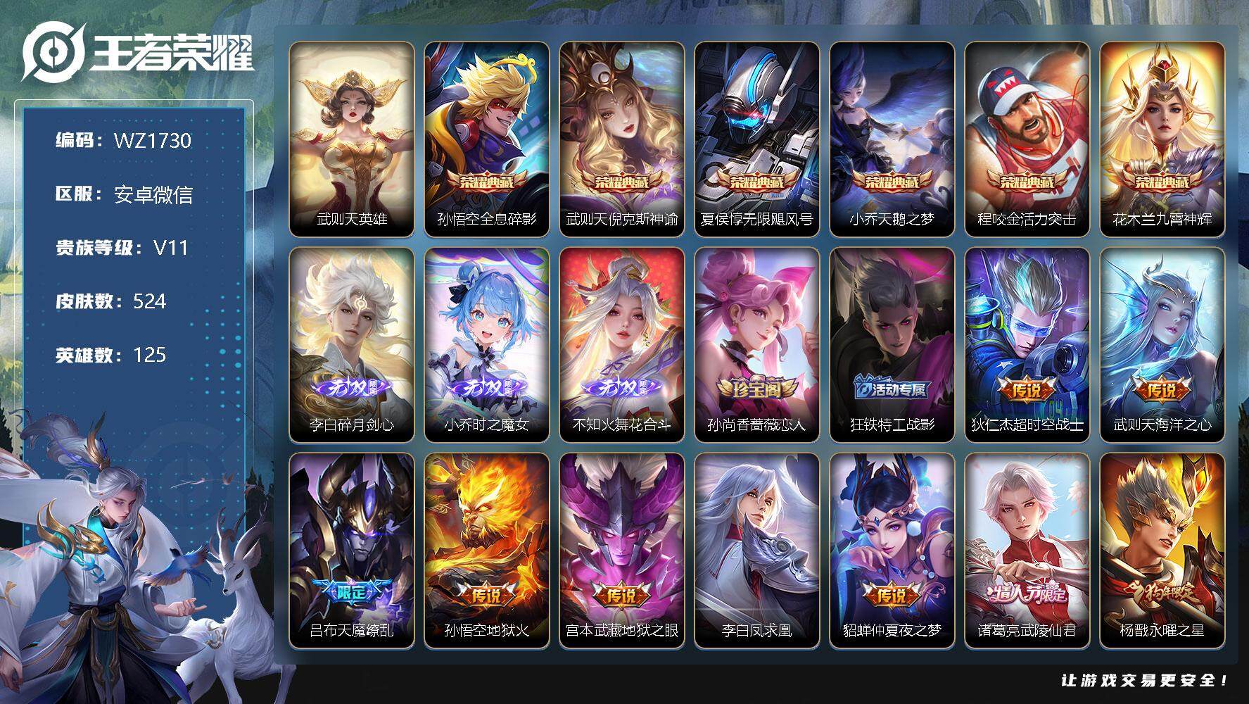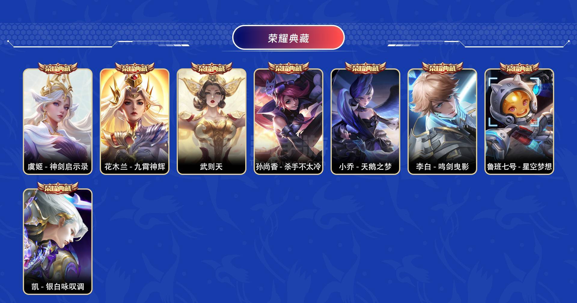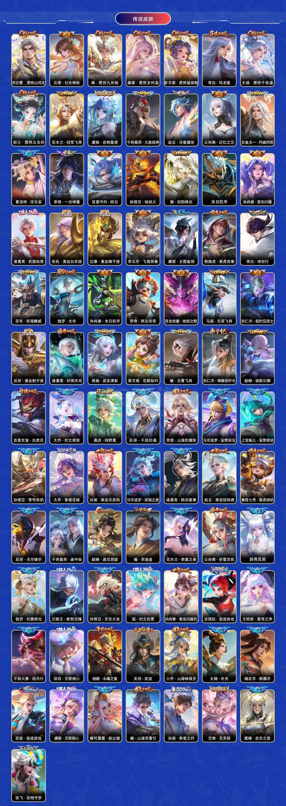 贵族等级:V10 皮肤价值:585634 荣耀典藏:8 无双皮肤:5 传说皮肤:87 史诗皮肤:18