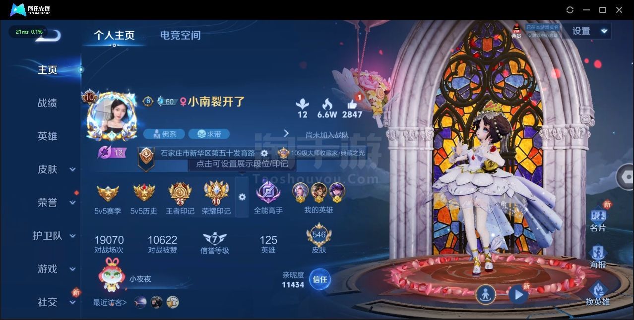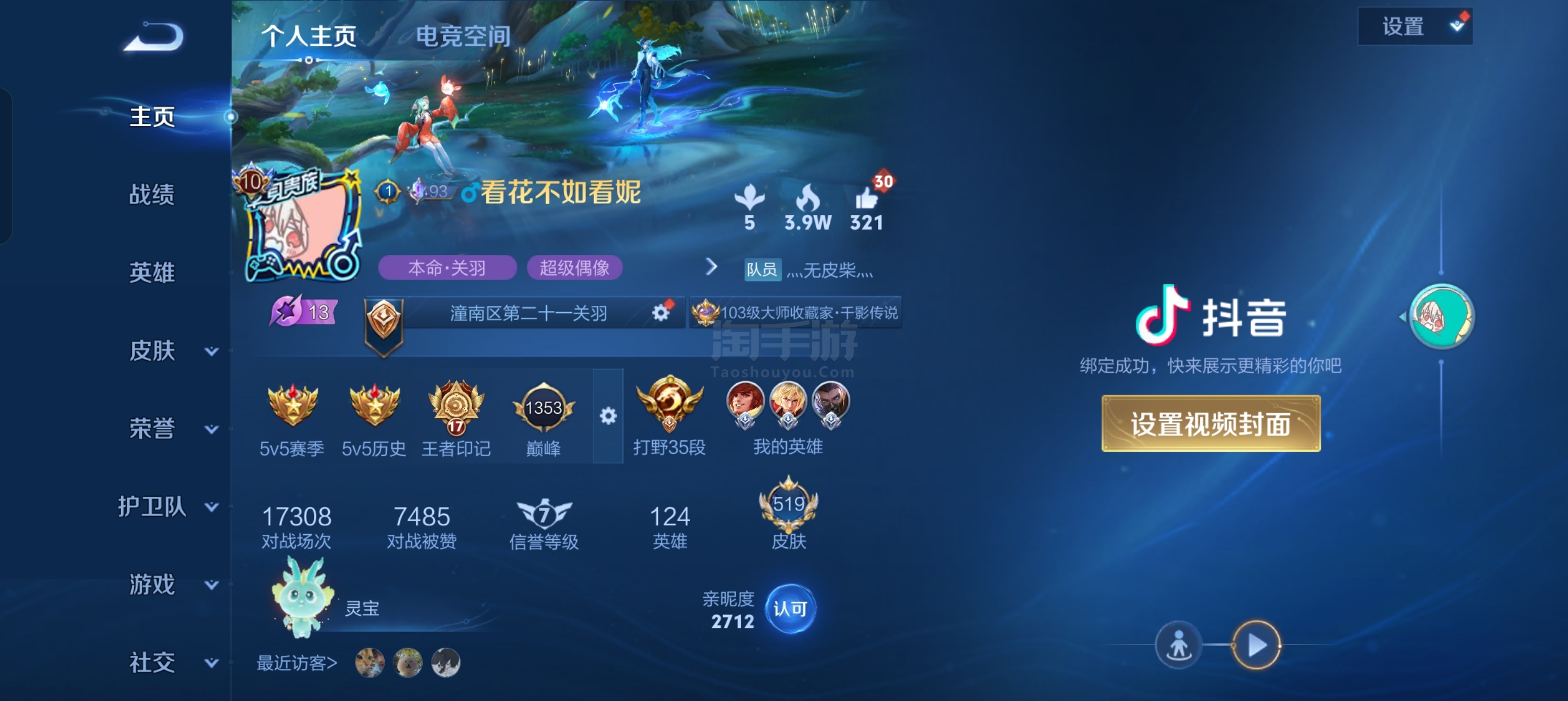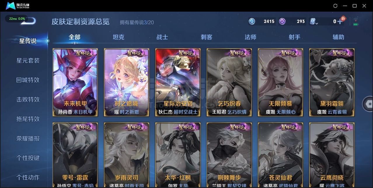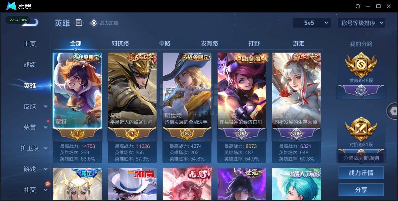贵族等级:V10 皮肤价值:585634 荣耀典藏:8 无双皮肤:5 传说皮肤:87 史诗皮肤:18