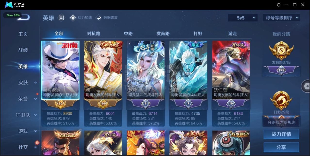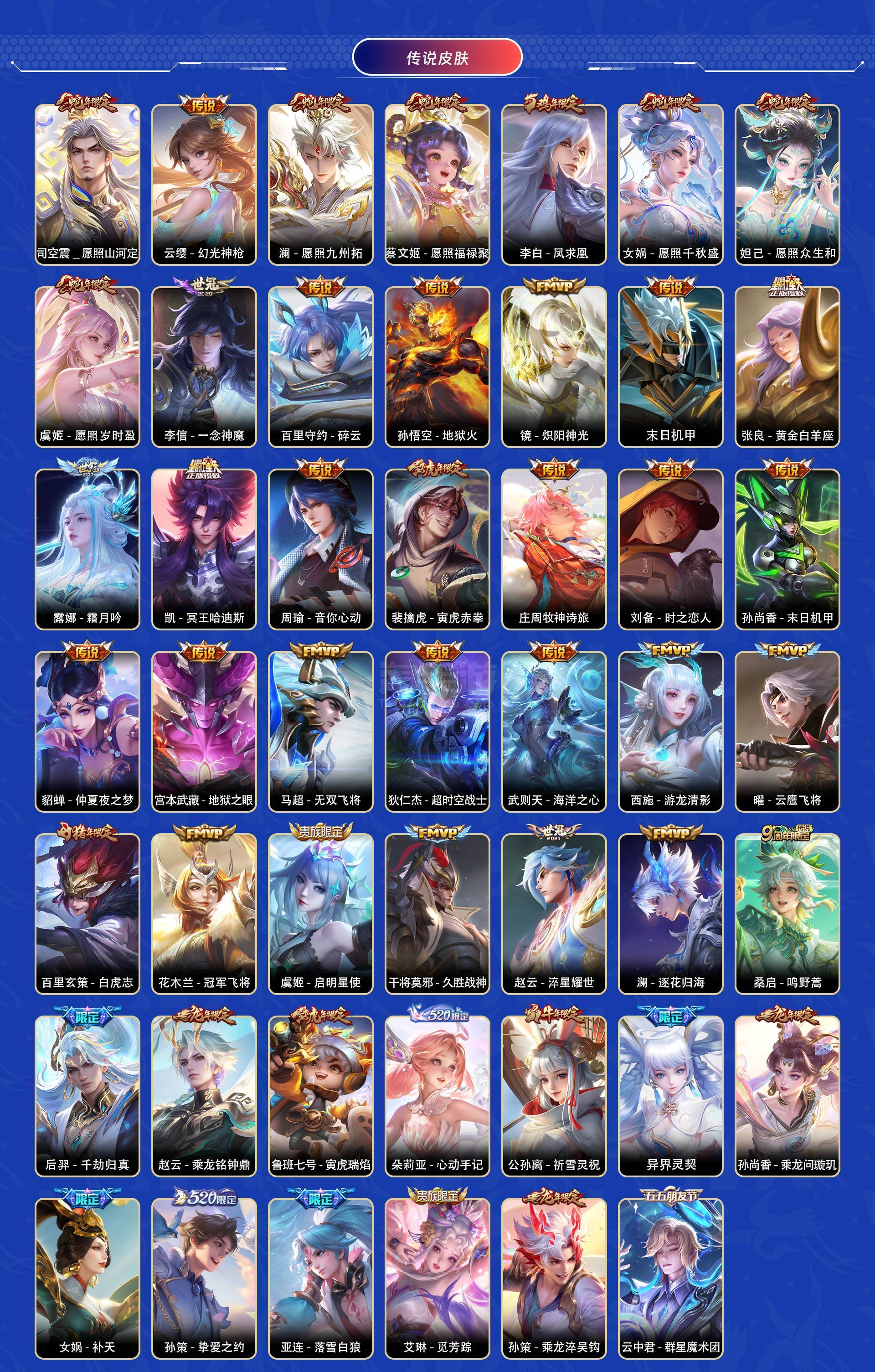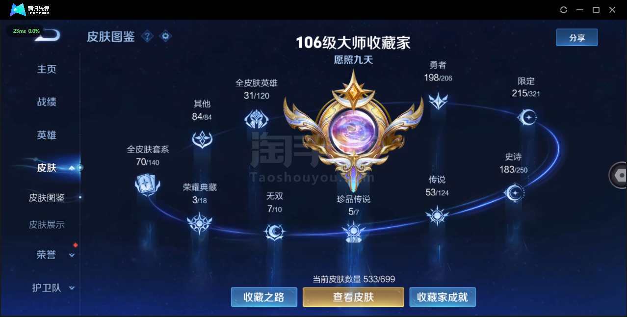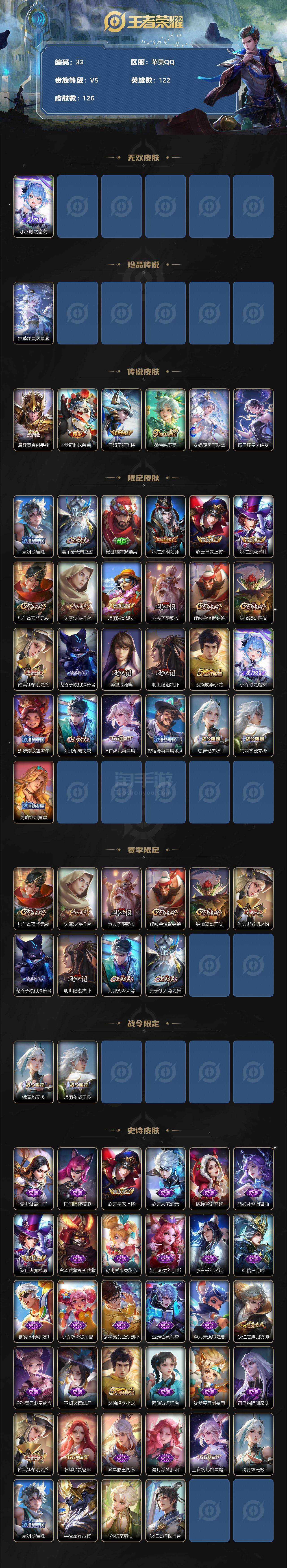 贵族等级:V10 皮肤价值:450014 荣耀典藏:4 无双皮肤:7 传说皮肤:53 史诗皮肤:18