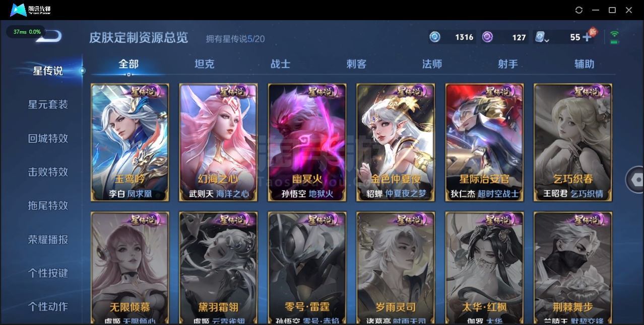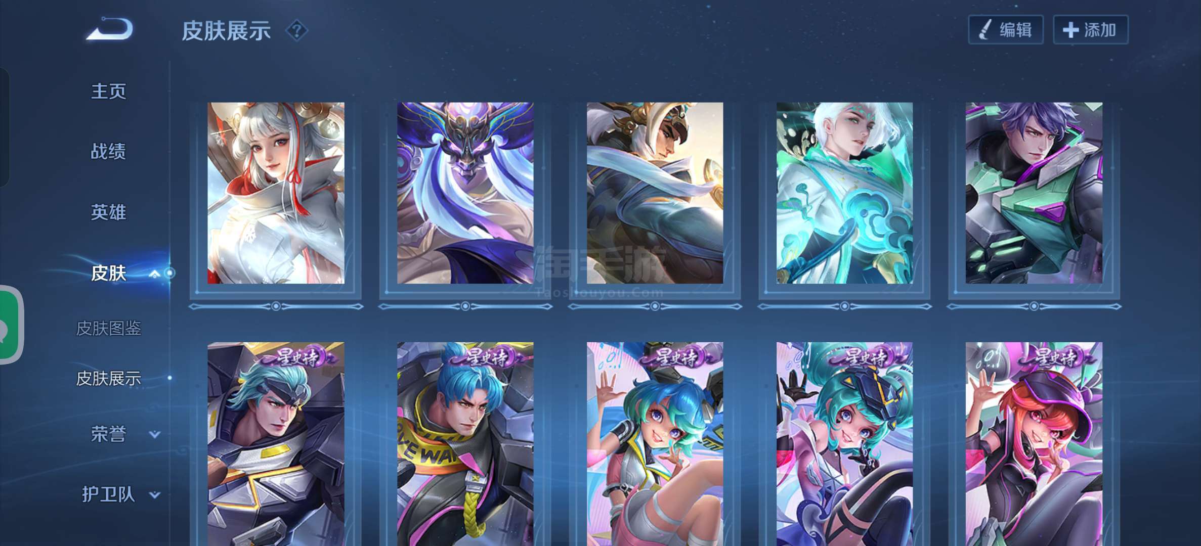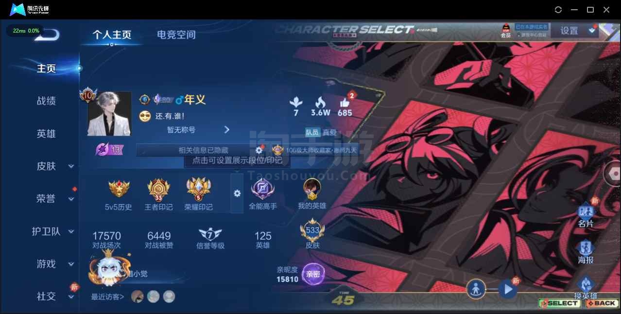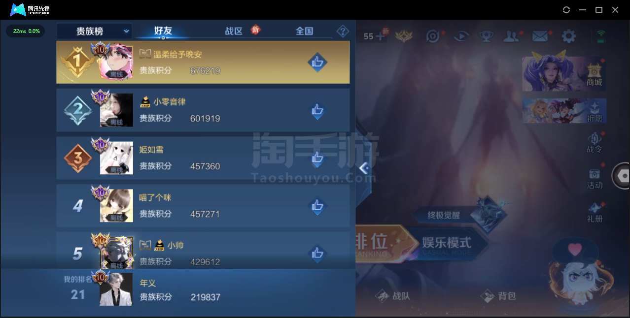 贵族等级:V10 皮肤价值:450014 荣耀典藏:4 无双皮肤:7 传说皮肤:53 史诗皮肤:18