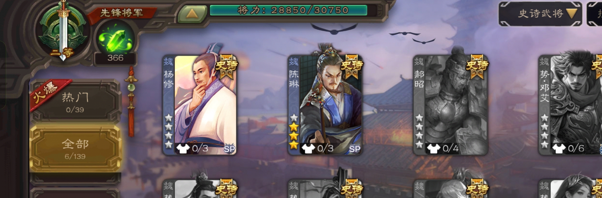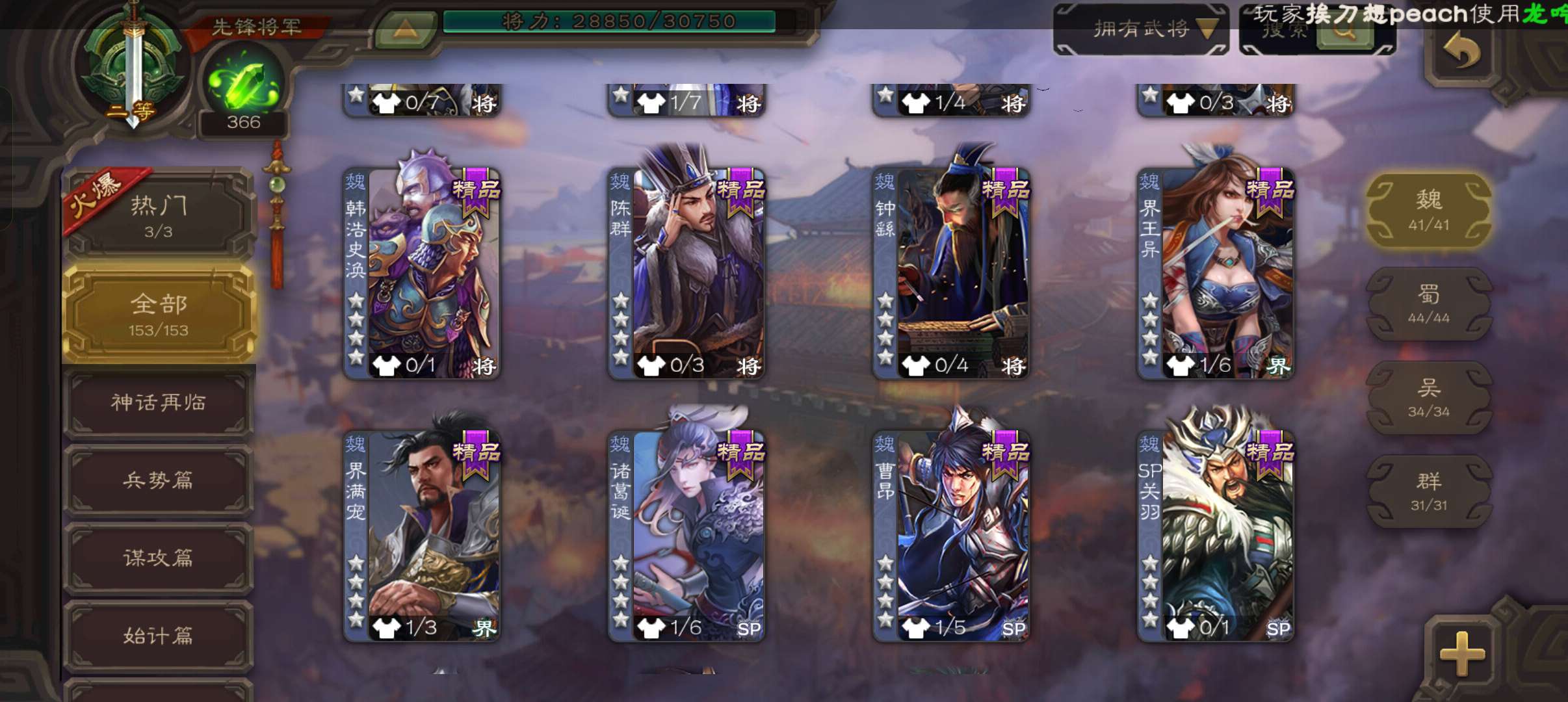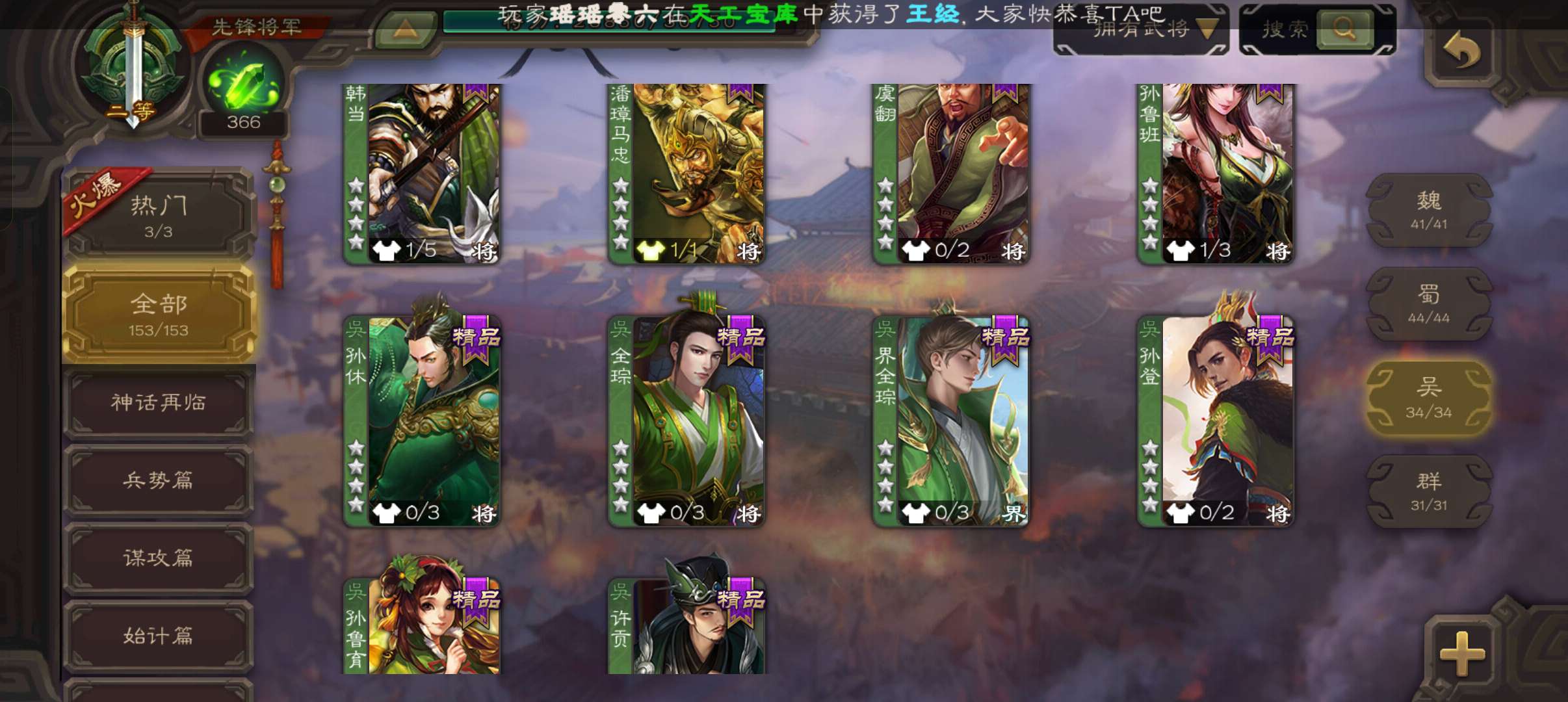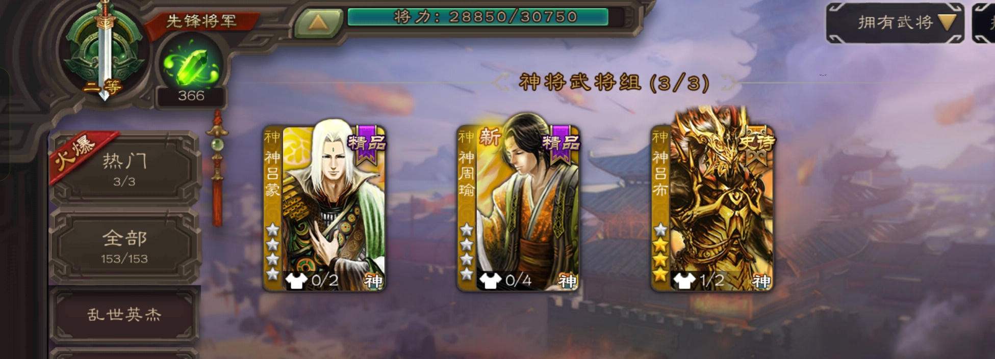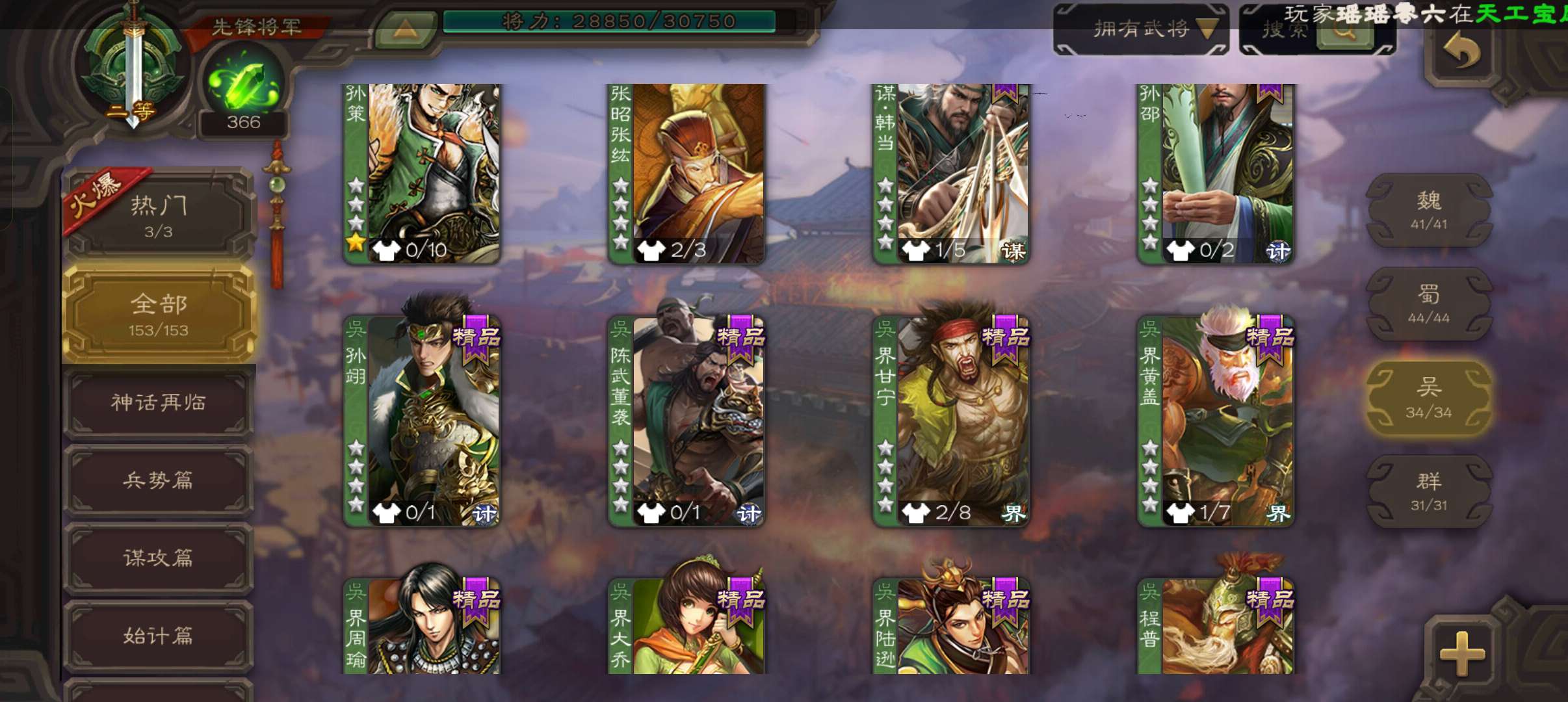 6史诗3神先锋,6万5豆,回廊动白马回廊神吕布谯周陈琳赵襄杨修,神周瑜神吕蒙谋韩当界满宠152将