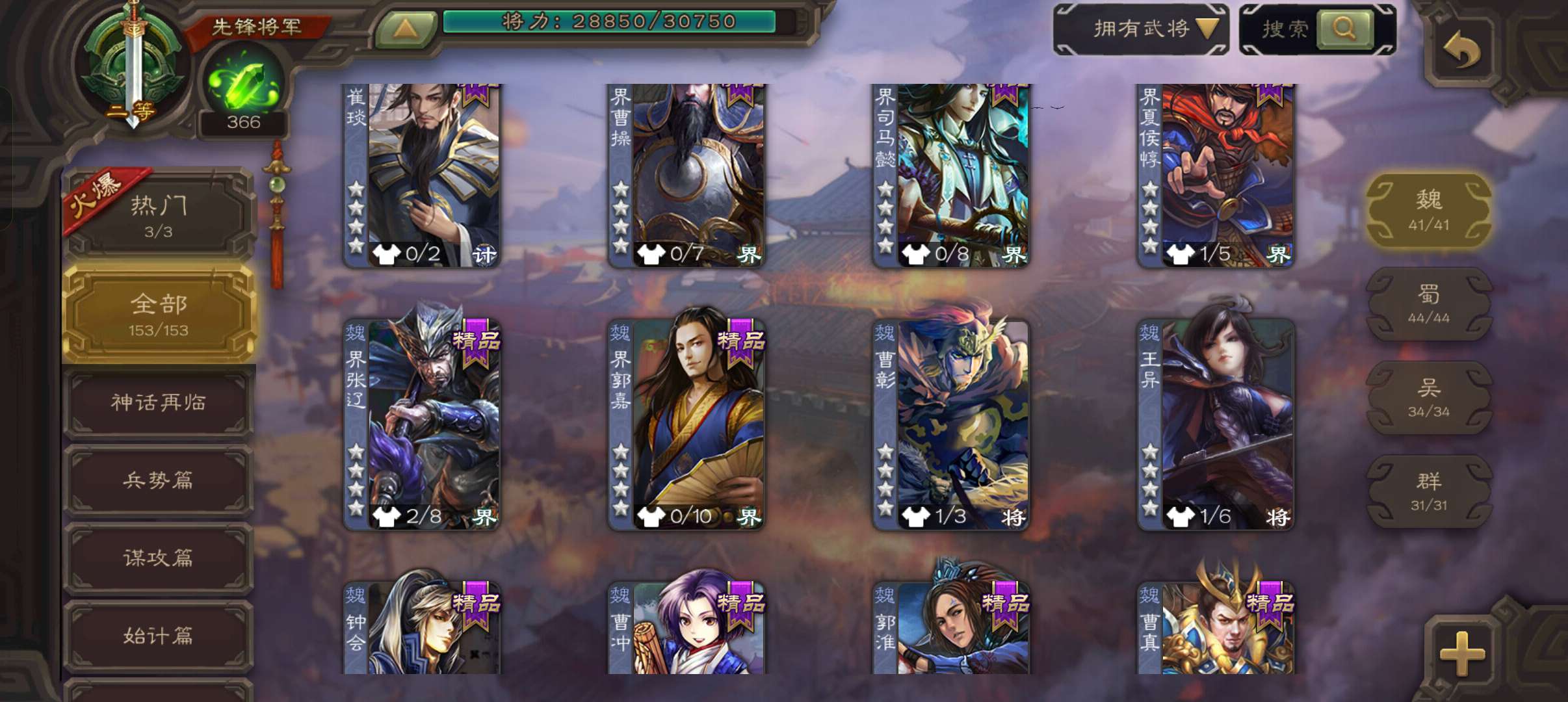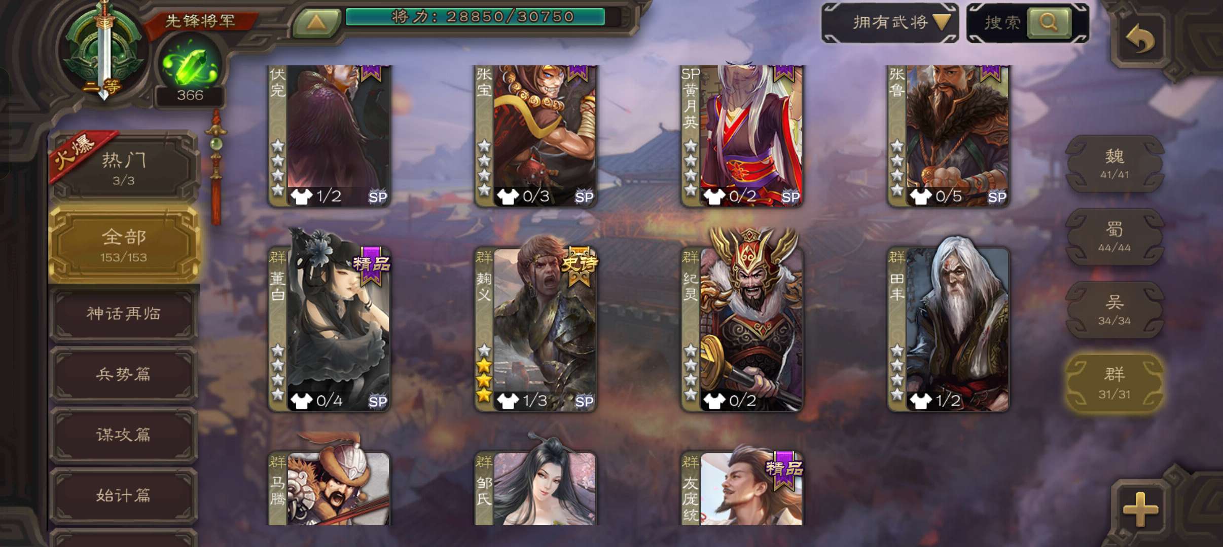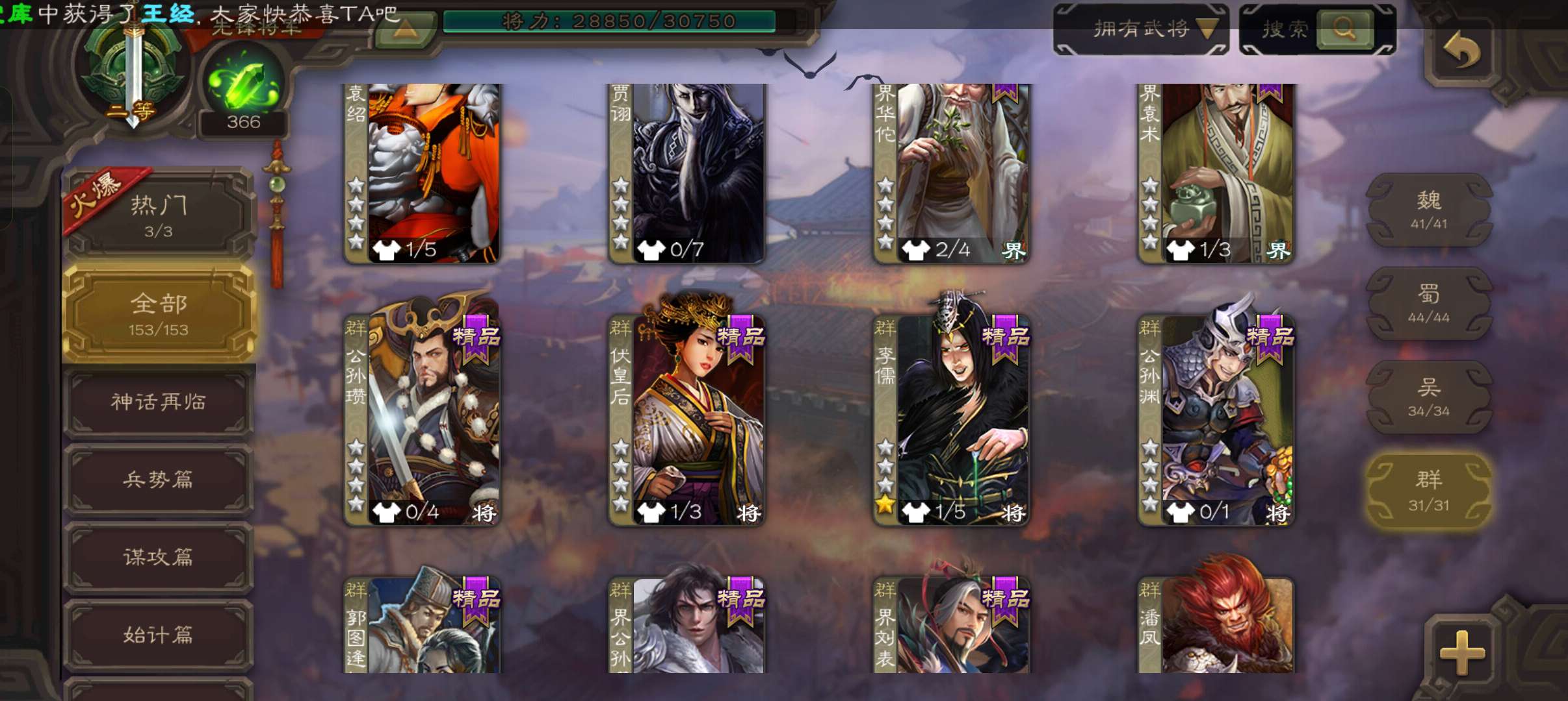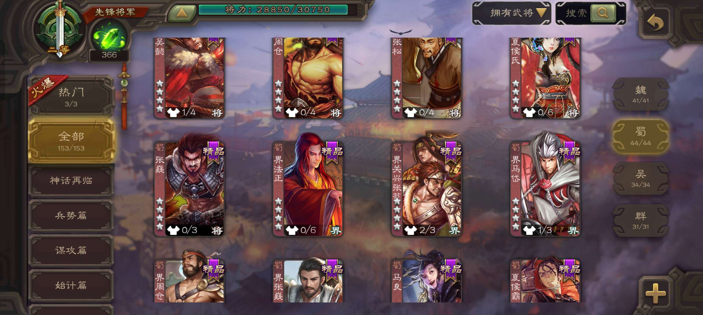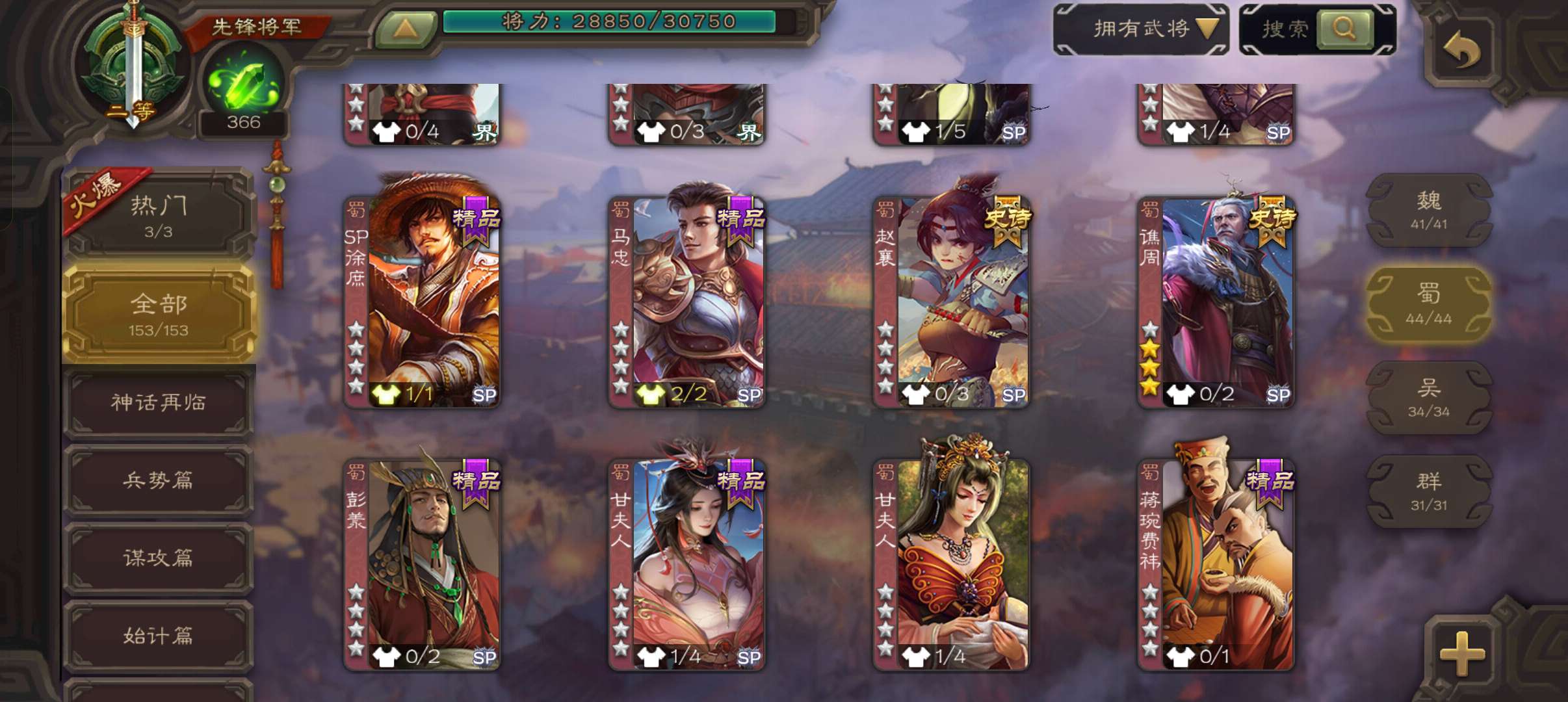 6史诗3神先锋,6万5豆,回廊动白马回廊神吕布谯周陈琳赵襄杨修,神周瑜神吕蒙谋韩当界满宠152将