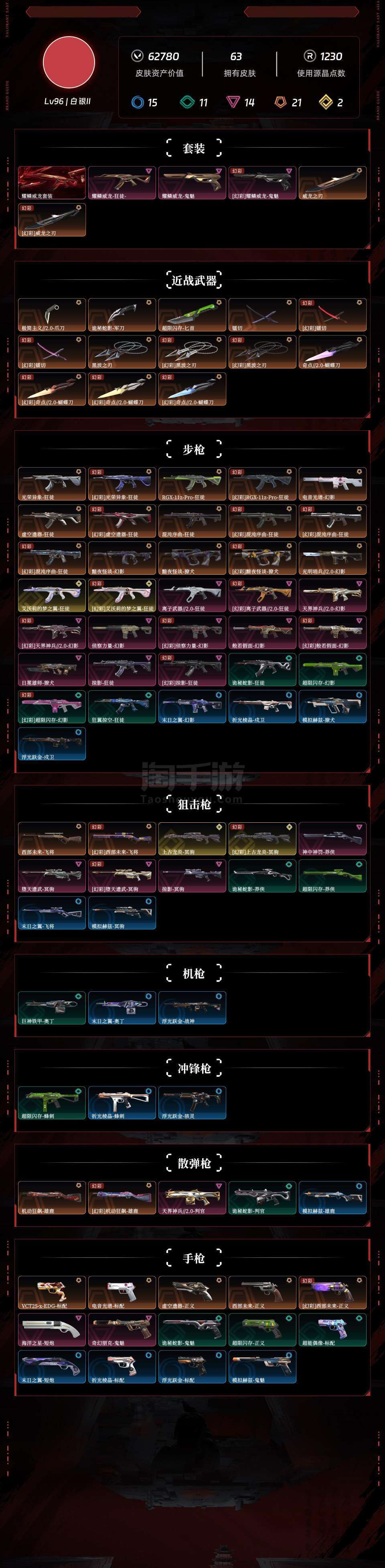 无畏契约【端游】R22995,有二次,剩余点券:7173 Lv96 ,皮肤总价值62780,白银II,总皮肤63,刀