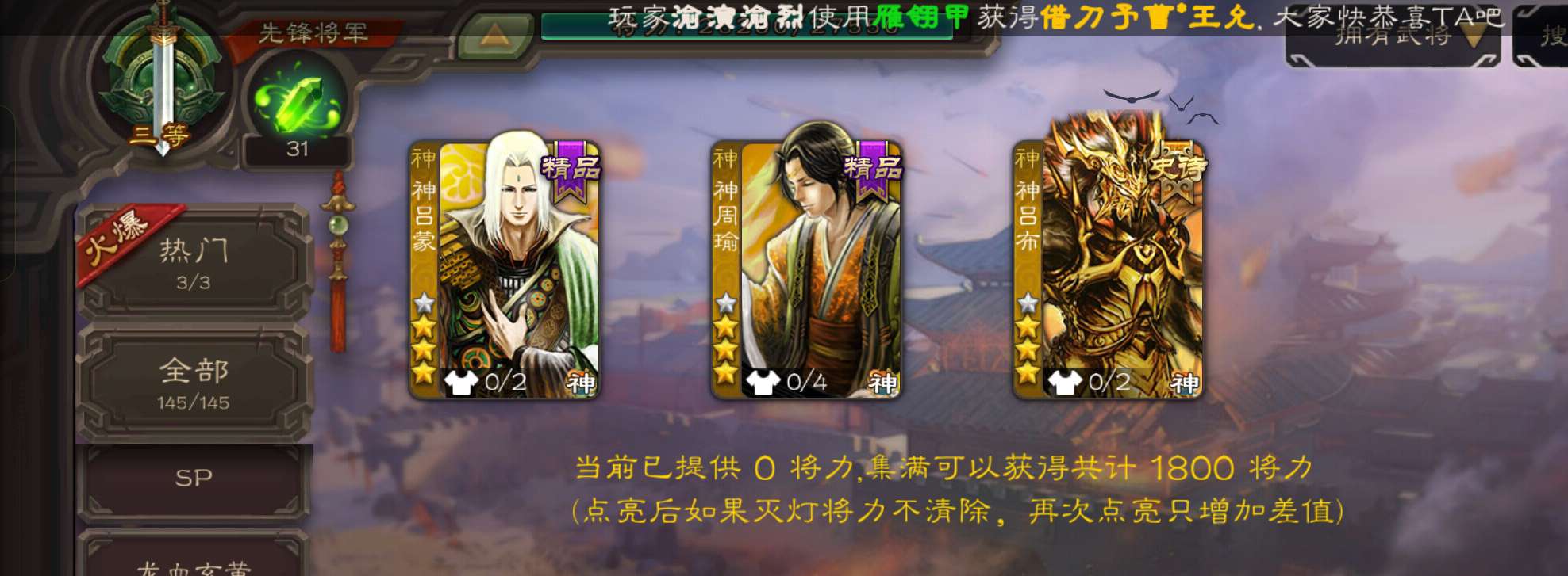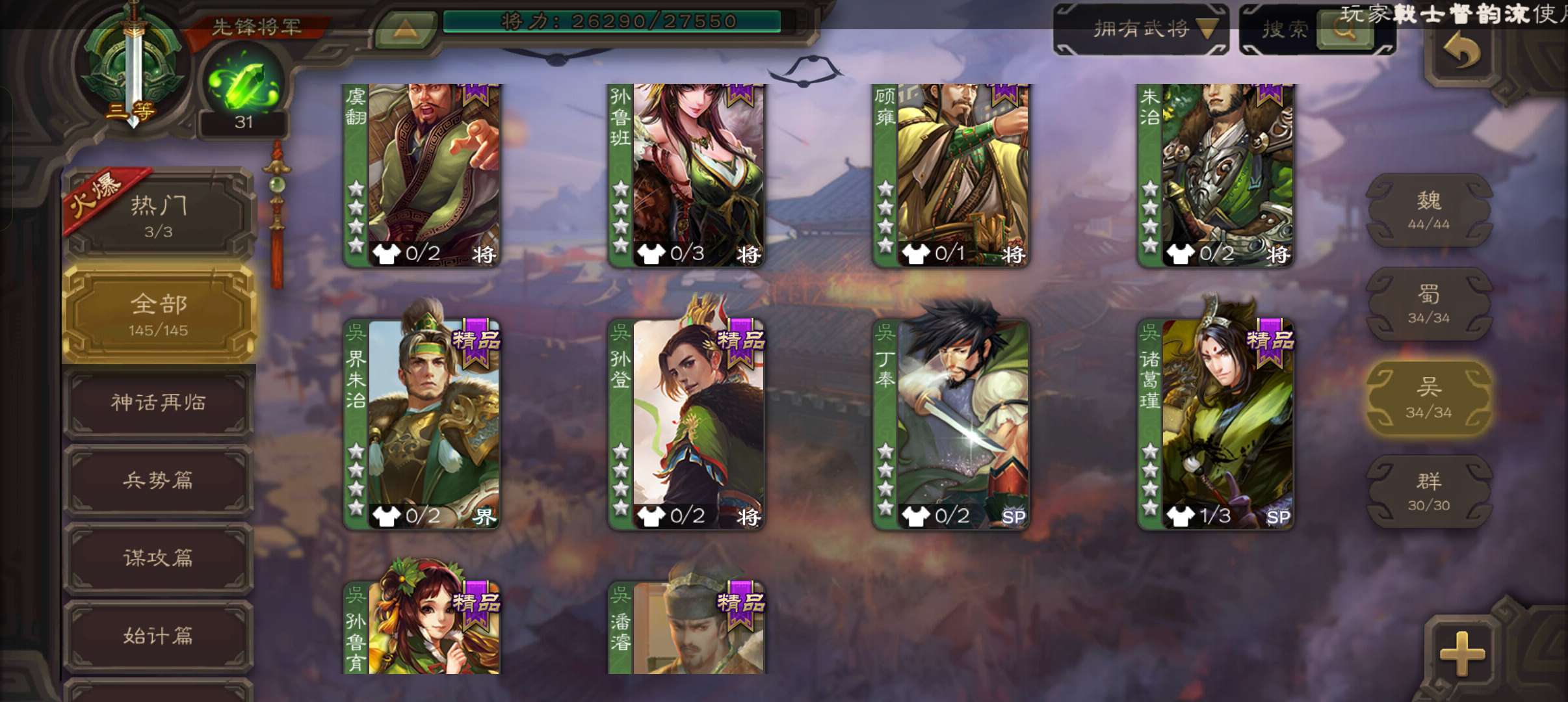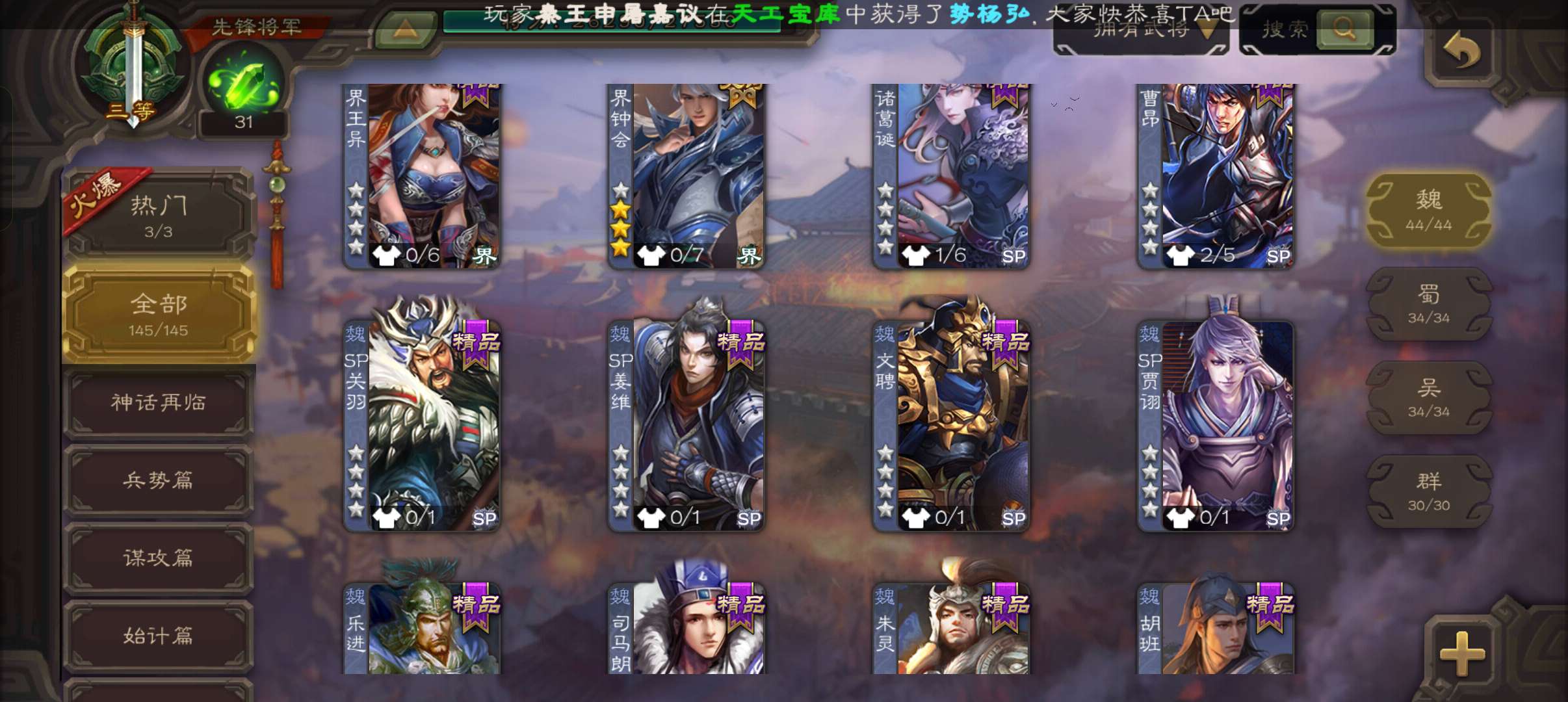 4万4羽毛5万豆,界钟会神吕布双史诗先锋,神周瑜神吕蒙金皮曹冲袁涣界关羽界曹植146将