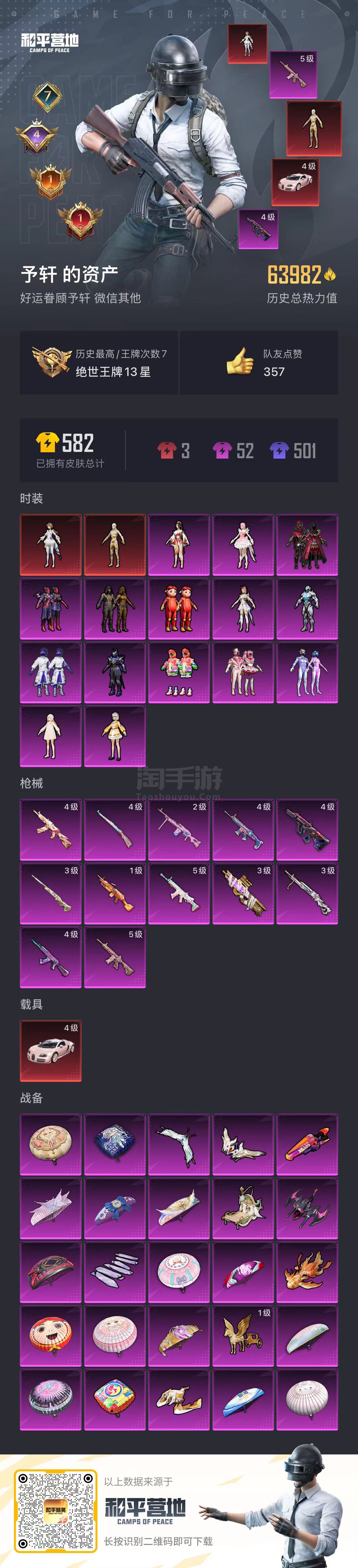 a3527/安卓微/-7王牌印记-15粉装-12特效枪-1载具-63982热力值-96套装-159