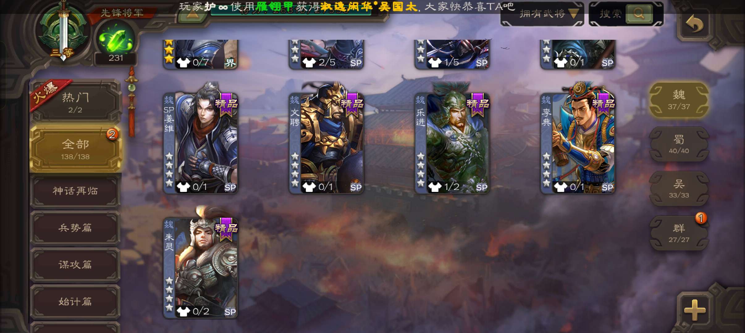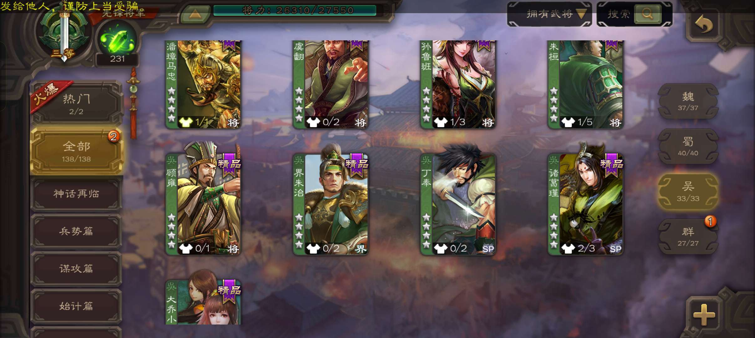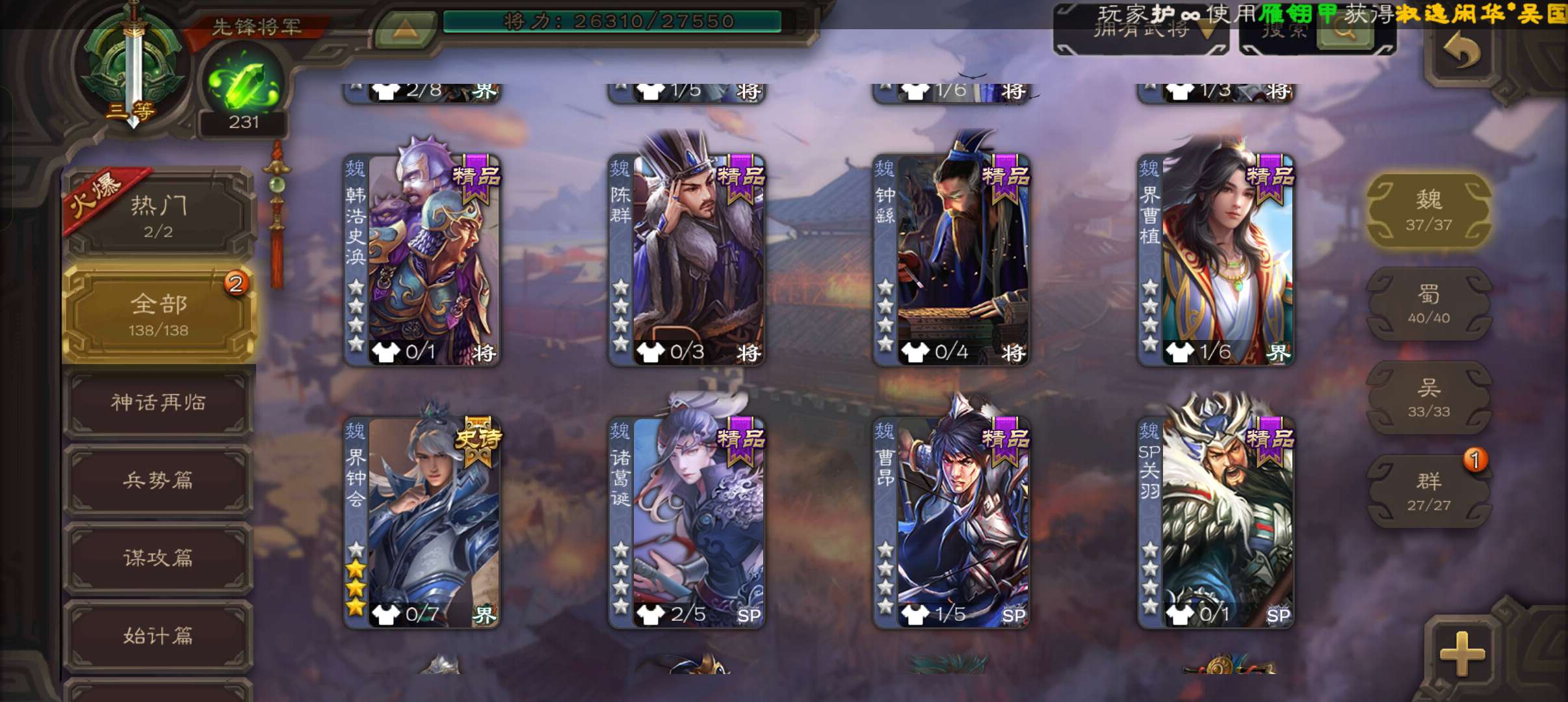 4万4羽毛4万3豆,回廊动白马界钟会谋马超谯周4史诗先锋,神吕蒙动态界曹植孙邵崔琰甘夫人张翼138将