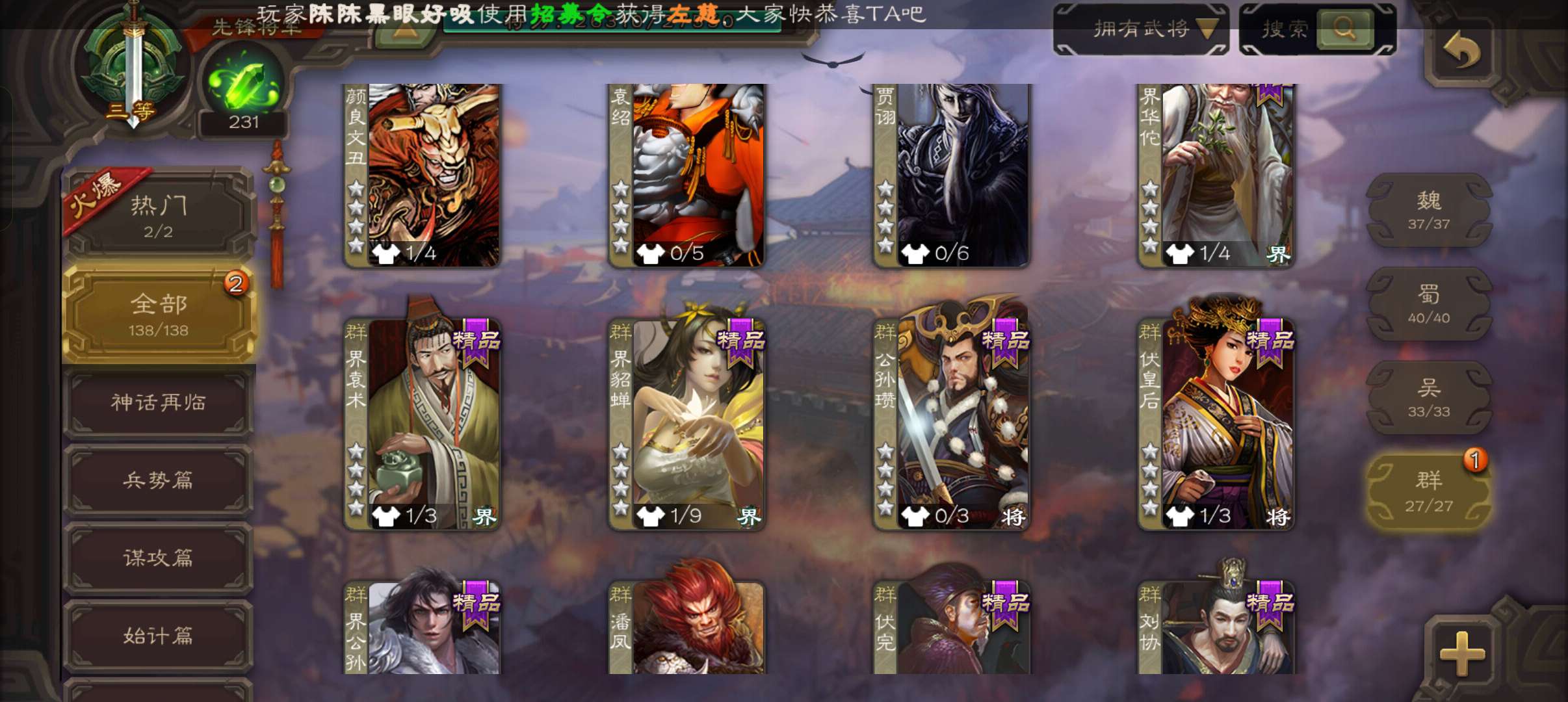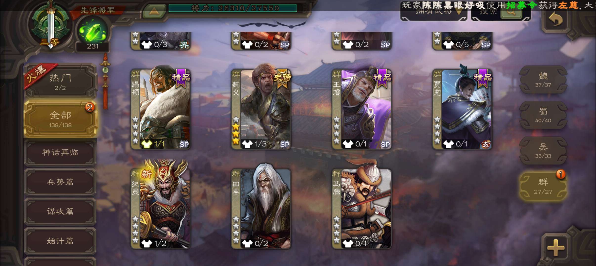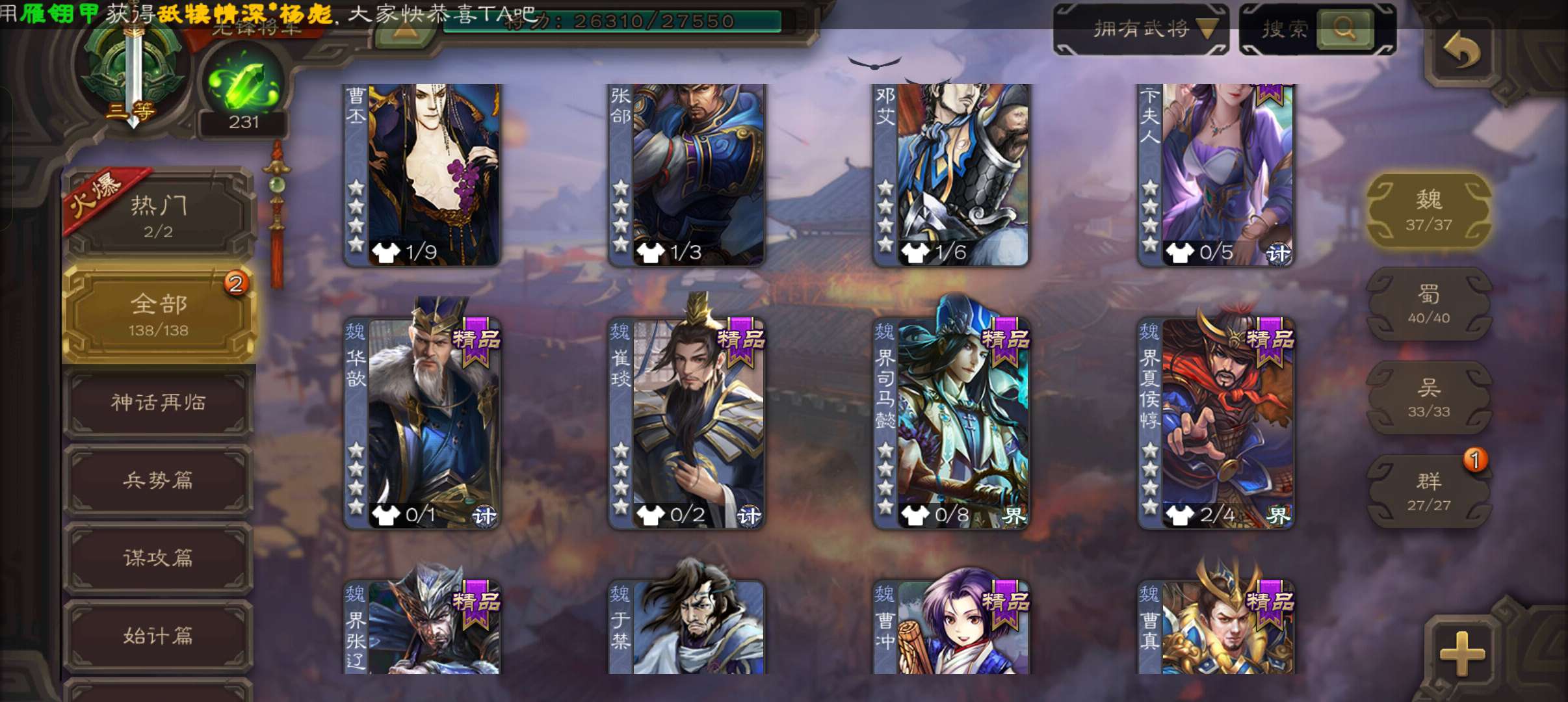 4万4羽毛4万3豆,回廊动白马界钟会谋马超谯周4史诗先锋,神吕蒙动态界曹植孙邵崔琰甘夫人张翼138将
