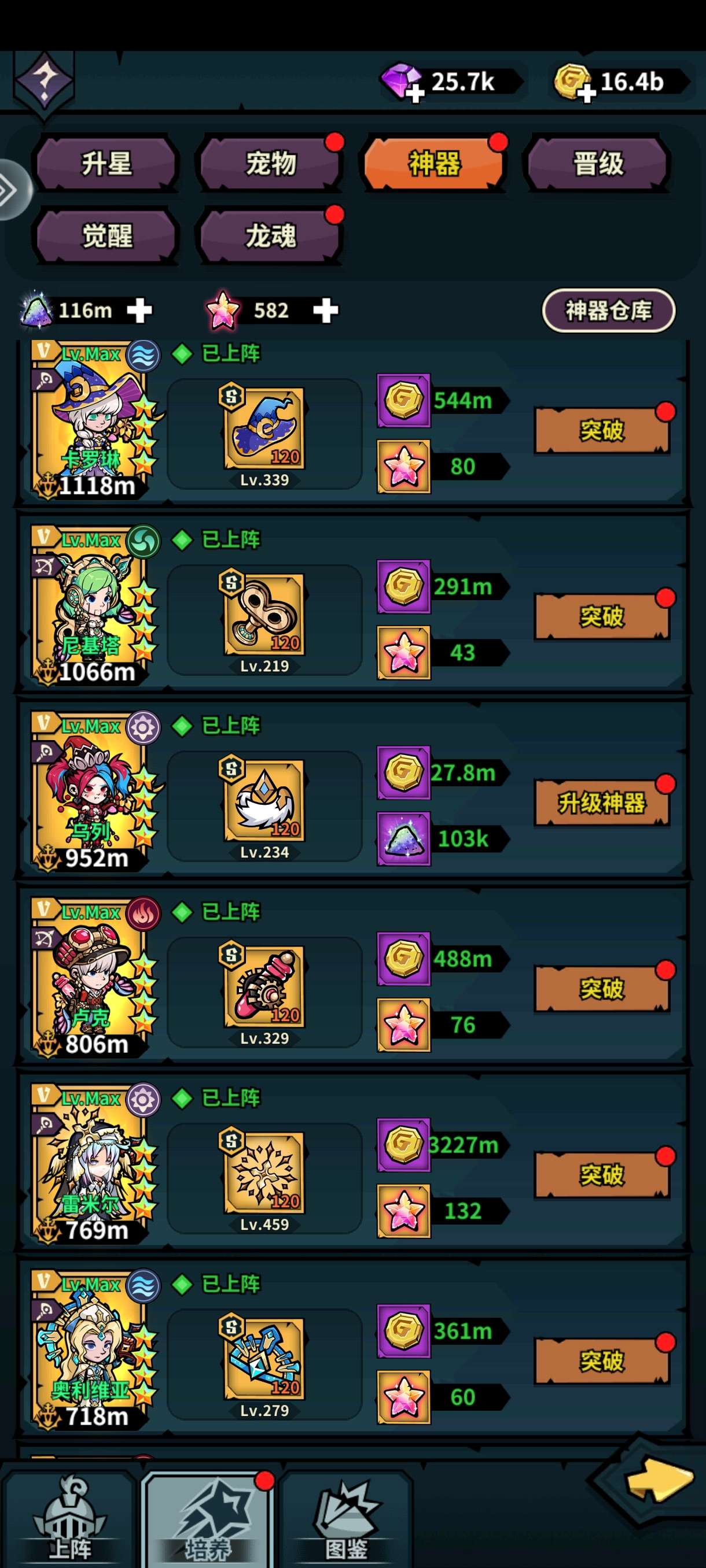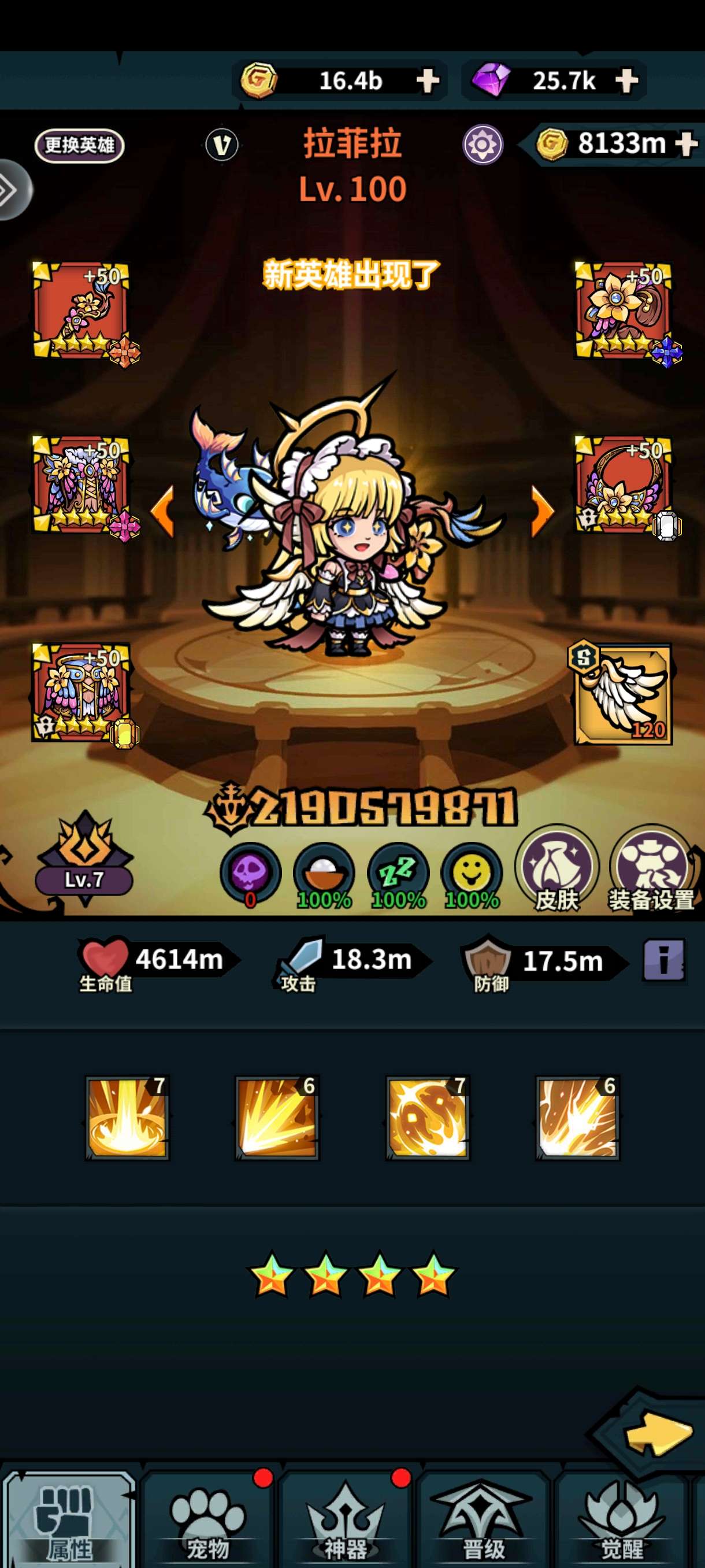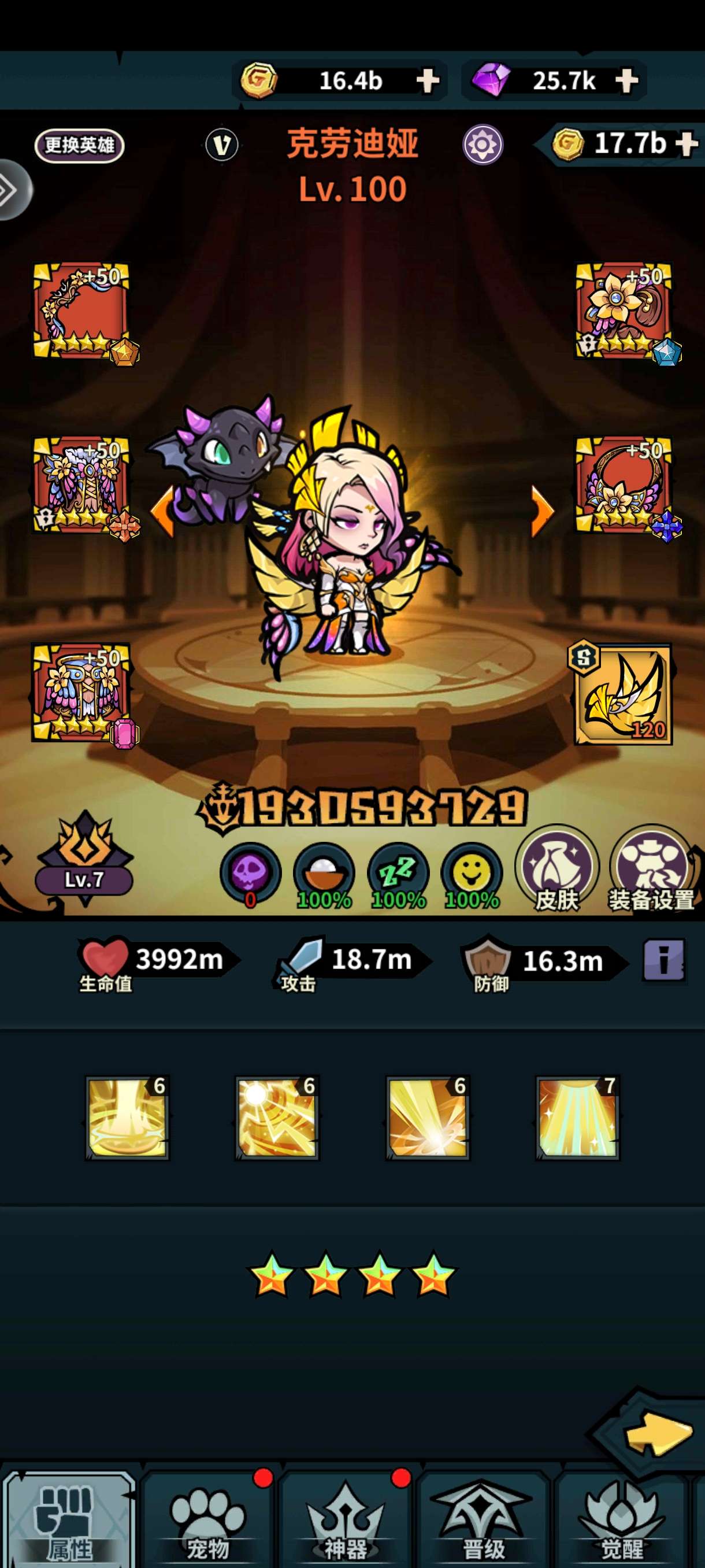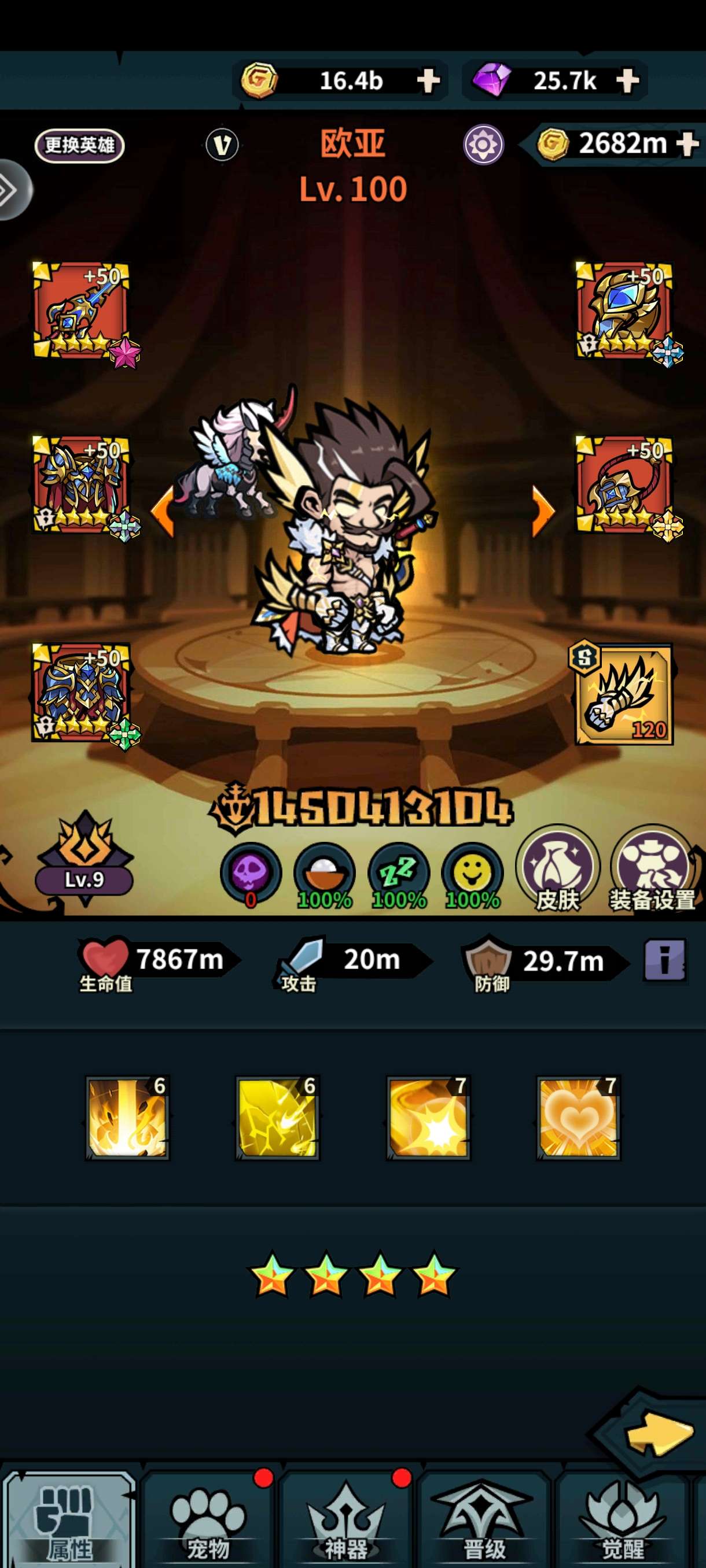 7光全满星,18.1B,远征45层,神兽360。所有主英雄都有套装,全部有专属神器,大概花了20万