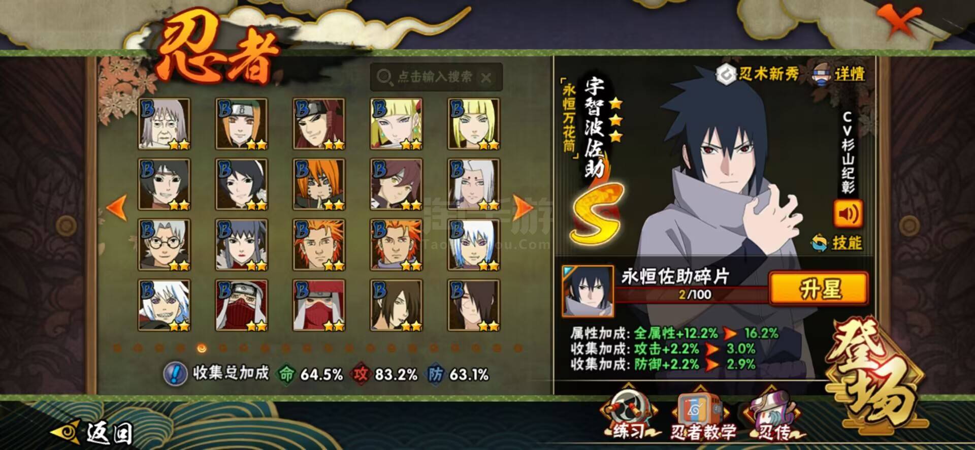 【S级忍者】:猿飞日斩「秽土转生」(3星猿飞日斩「秽土转生」),波风水门「秽土转生」(3星波风水门「秽土转生」),千手扉间「秽土转生」(3星千手扉间「秽土转生」),自来也「舞之豪杰」(3星自来也「舞之豪杰」),大蛇丸(3星大蛇丸),波风水门(3星波风水门),迈特凯「死门」(3星迈特凯「死门」),宇智波佐助「永恒万花筒」(3星宇智波佐助「永恒万花筒」)