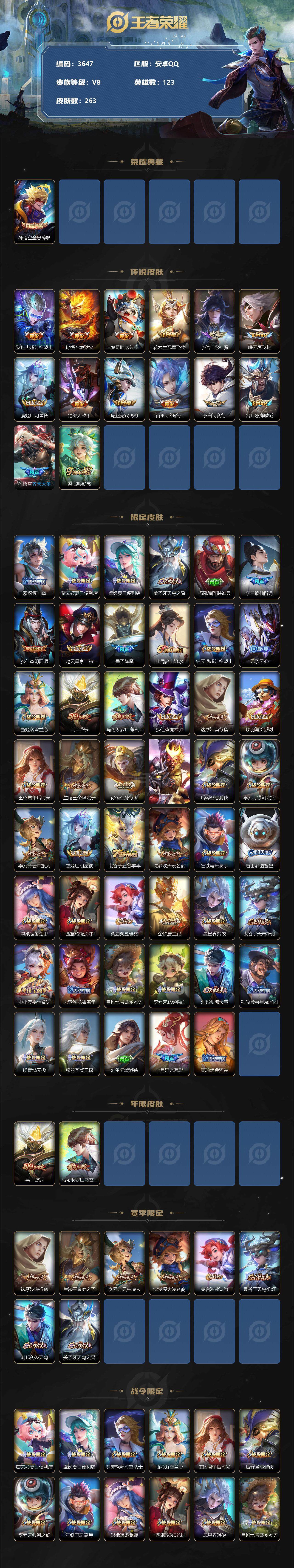 营地账号:1710559628/【商品标题】:955196王者荣耀账号安卓Q-V8-至尊星耀III段位-123英雄-263皮肤-1典藏-0珍品无双-0无双-0珍品传说-14传说-65史诗