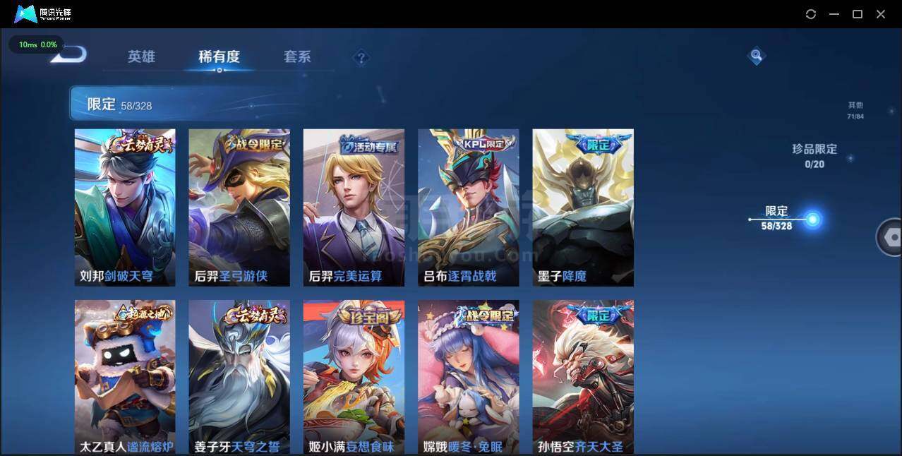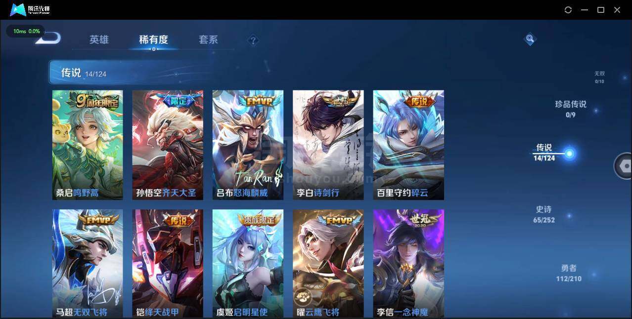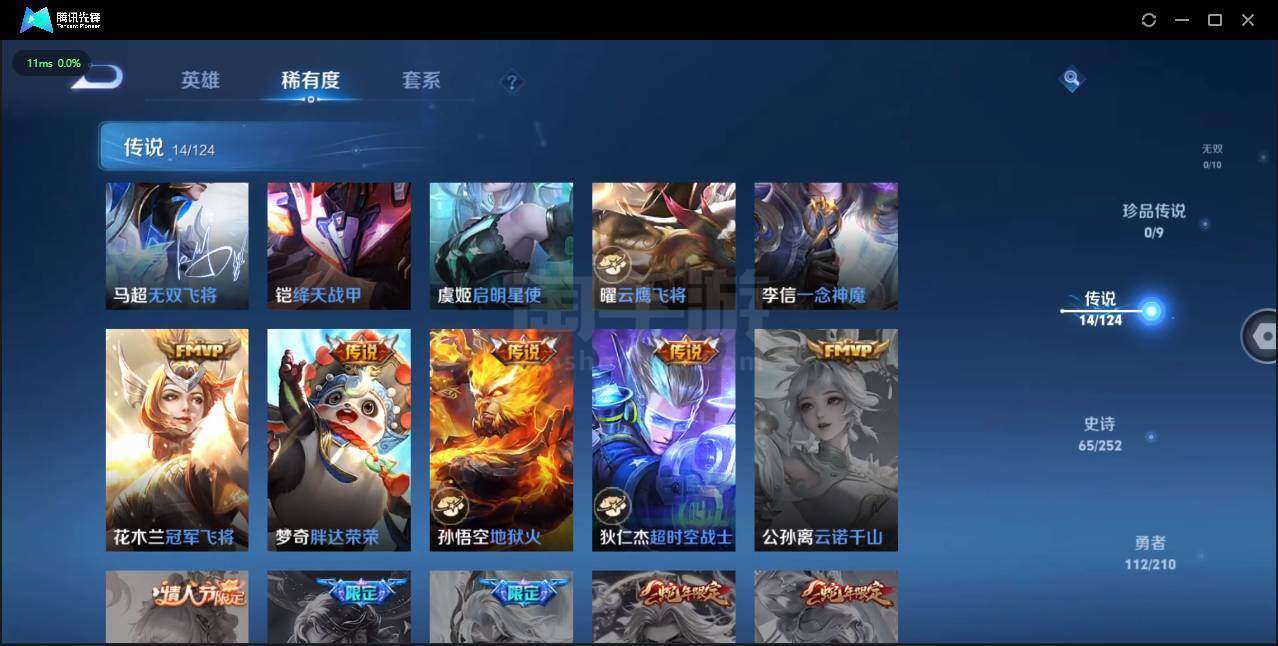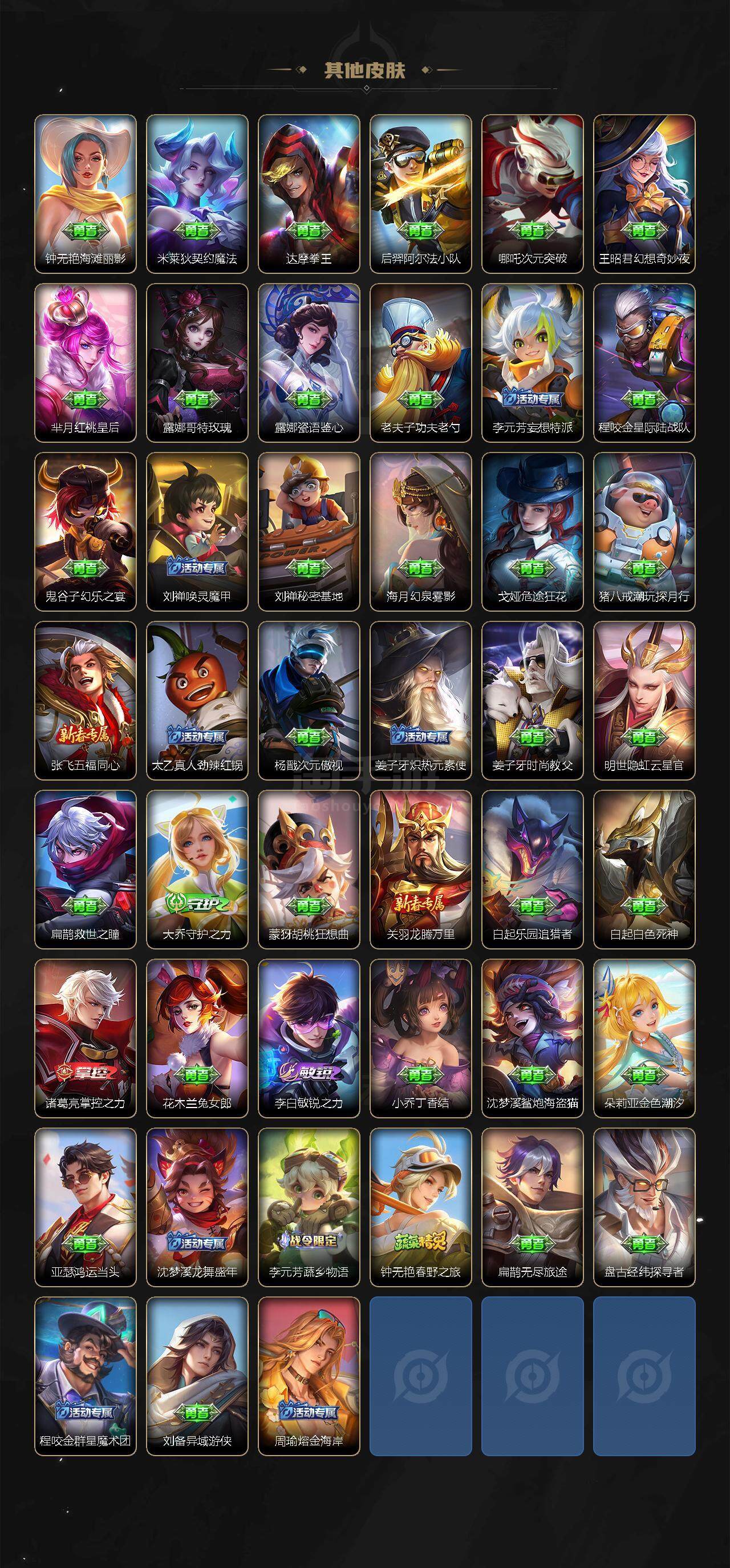【传说皮肤】:狄仁杰超时空战士,孙悟空地狱火,梦奇胖达荣荣,花木兰冠军飞将,李信一念神魔,曜云鹰飞将,虞姬启明星使,铠绛天战甲,马超无双飞将,百里守约碎云,李白诗剑行,吕布怒海麟威