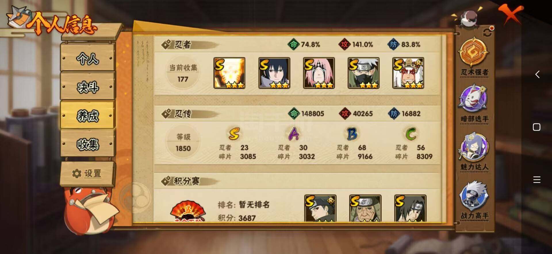 【S级忍者】:猿飞日斩「秽土转生」(3星),千手扉间「秽土转生」(3星),千手柱间「秽土转生」(3星),宇智波斑「秽土转生·解」(3星),大野木「忍界大战」(3星),春野樱「忍界大战」(3星),宇智波带土「忍界大战」(3星),宇智波鼬「须佐能乎」(3星),宇智波止水「须佐能乎」(3星),旗木卡卡西「须佐能乎」(3星),千手柱间
