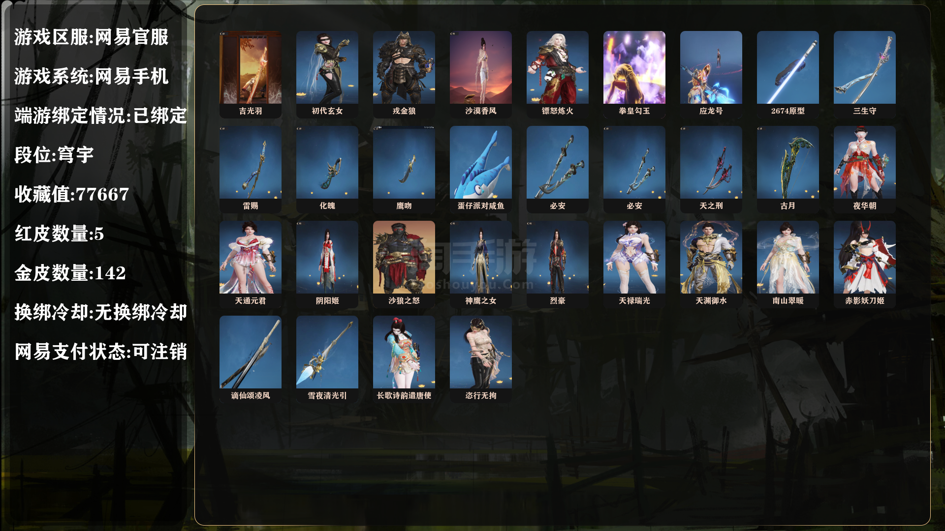 永劫无间手游【安卓官方】【红数量】5 【金数量】142 【总收藏值】77667 【通行证等级】LV75