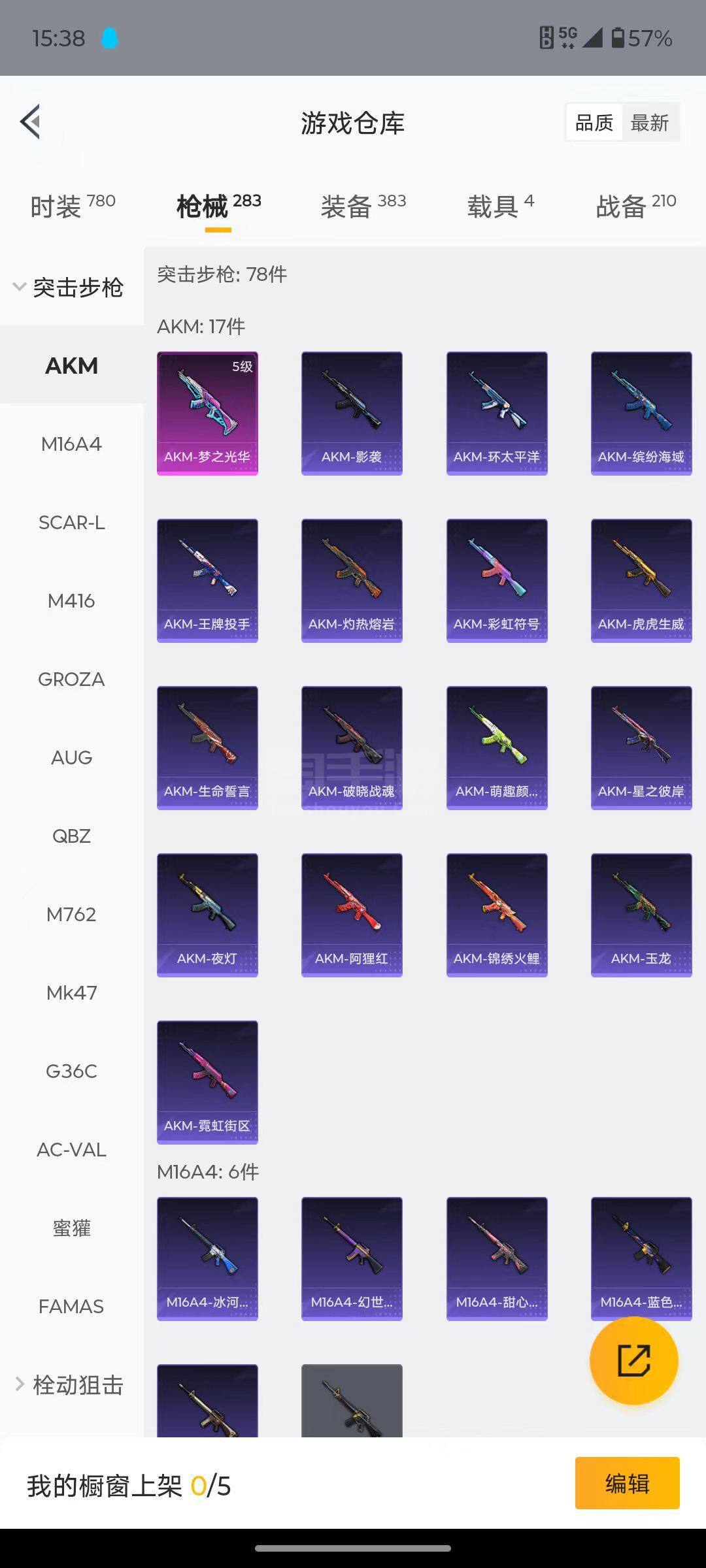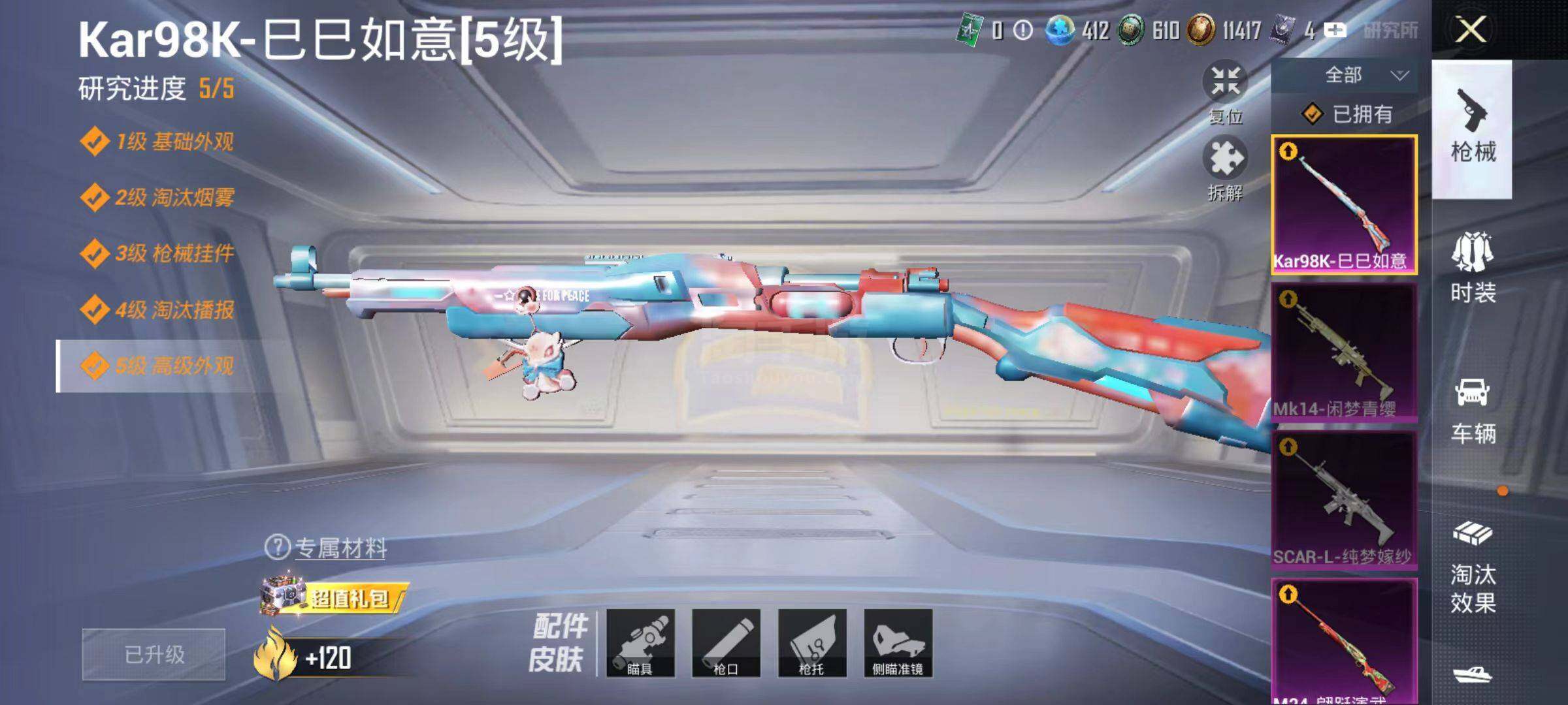 【特效枪等级】:AKM-梦之光华(五级),SCAR-L-纯梦嫁纱(四级),Vector-环太平洋(七级),Kar98K-巳巳如意(五级),M24-翩跹演武(四级)