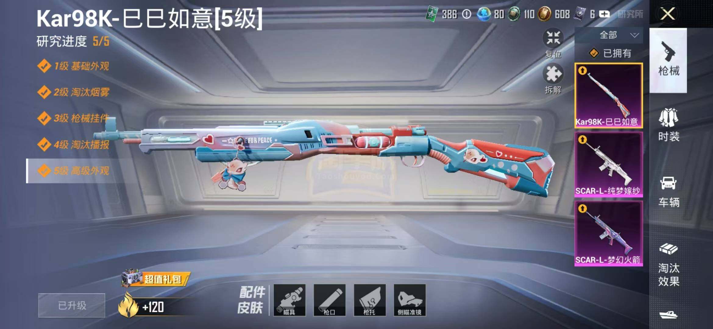 【特效枪等级】:SCAR-L-梦幻火箭(四级),SCAR-L-纯梦嫁纱(七级),Kar98K-巳巳如意(五级)