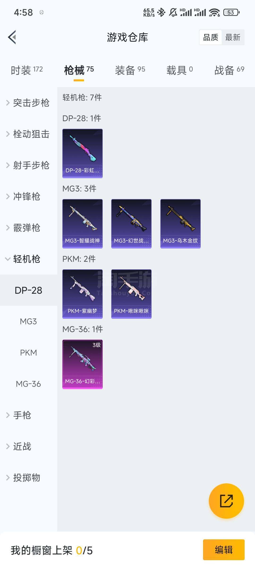 【特效枪等级】:M762-鬼刀(三级),Kar98K-巳巳如意(五级),AMR-智耀战神(四级),MG3-辉羽雀灵(三级MG-36-幻彩电音)