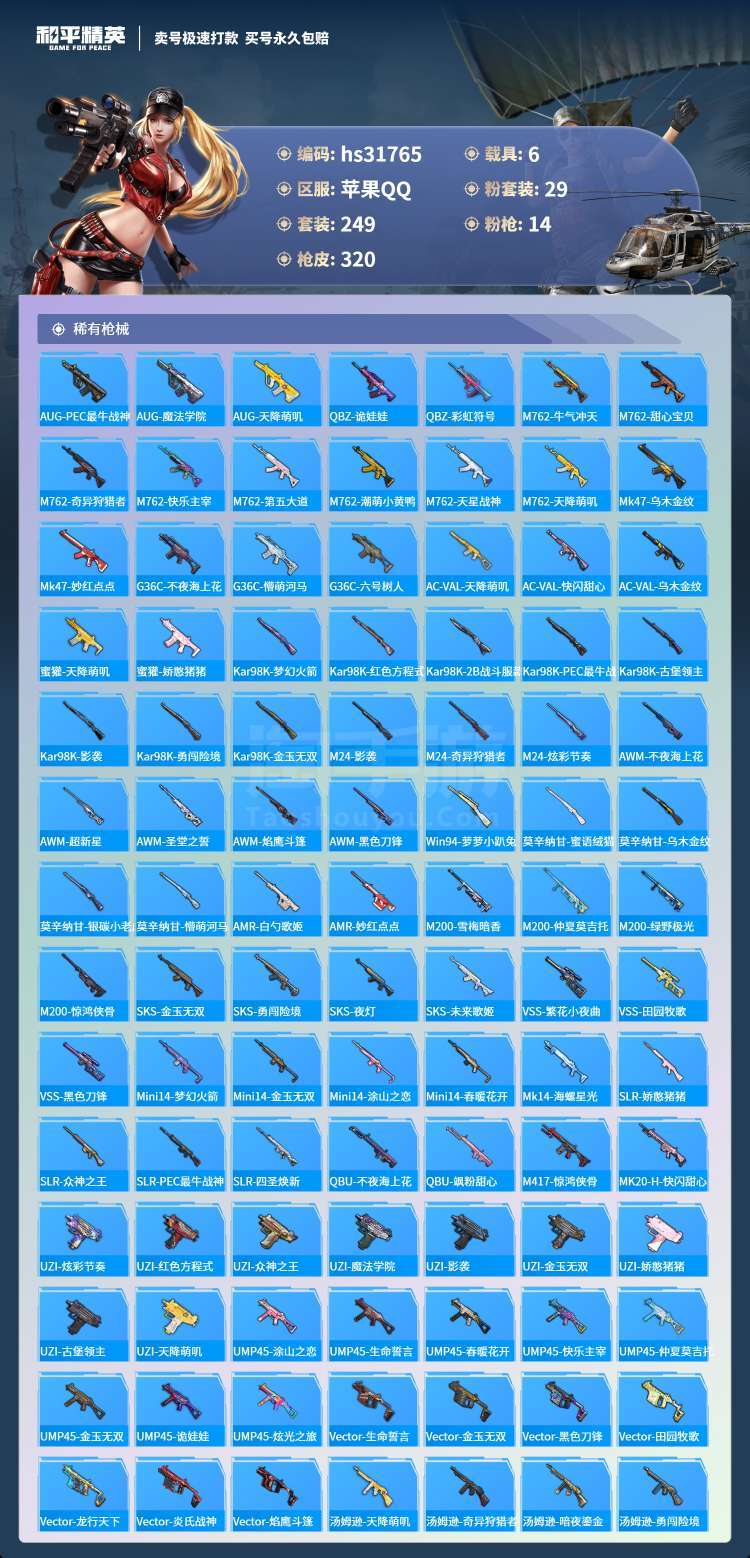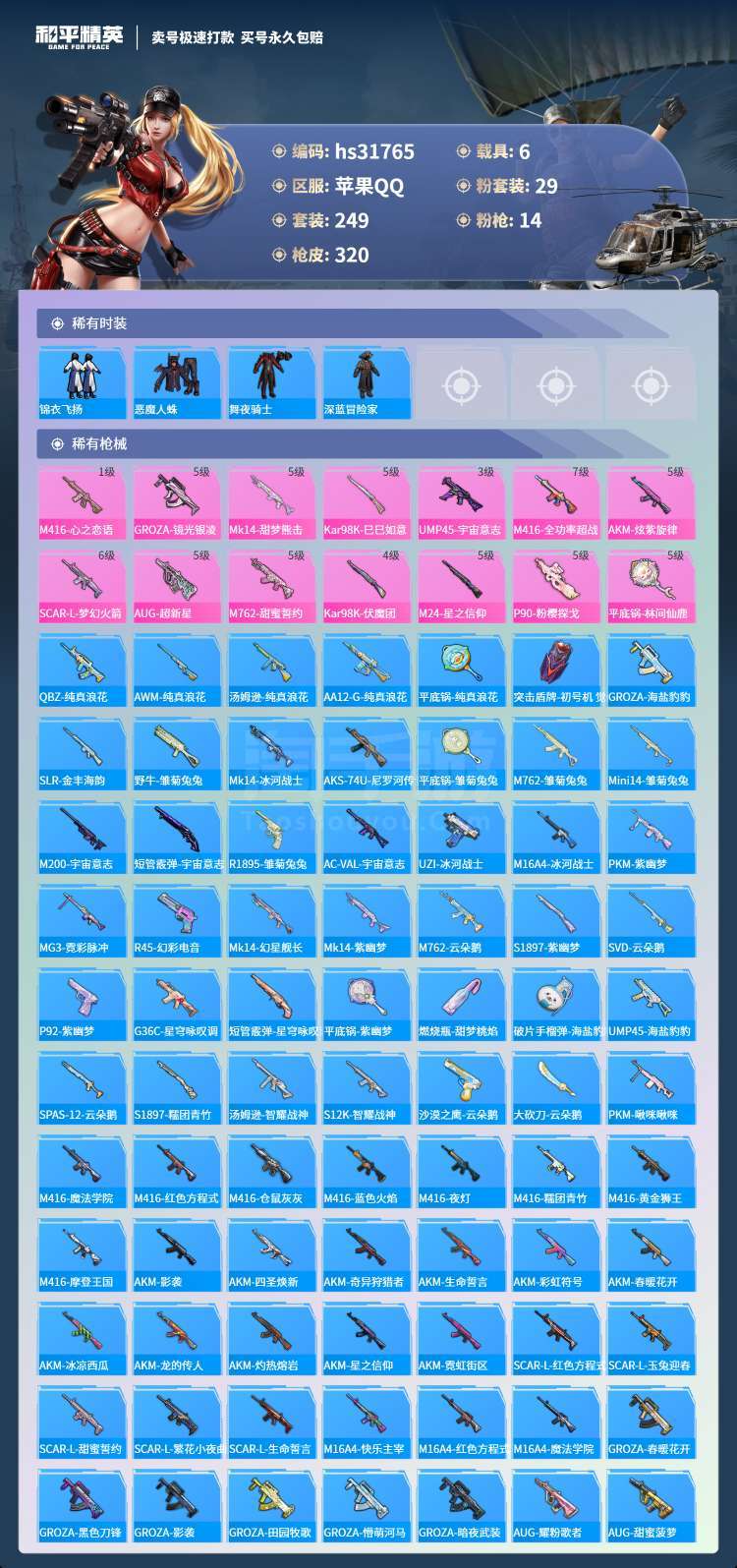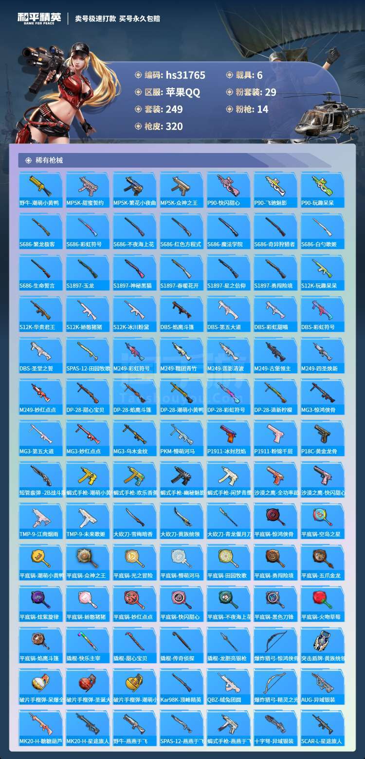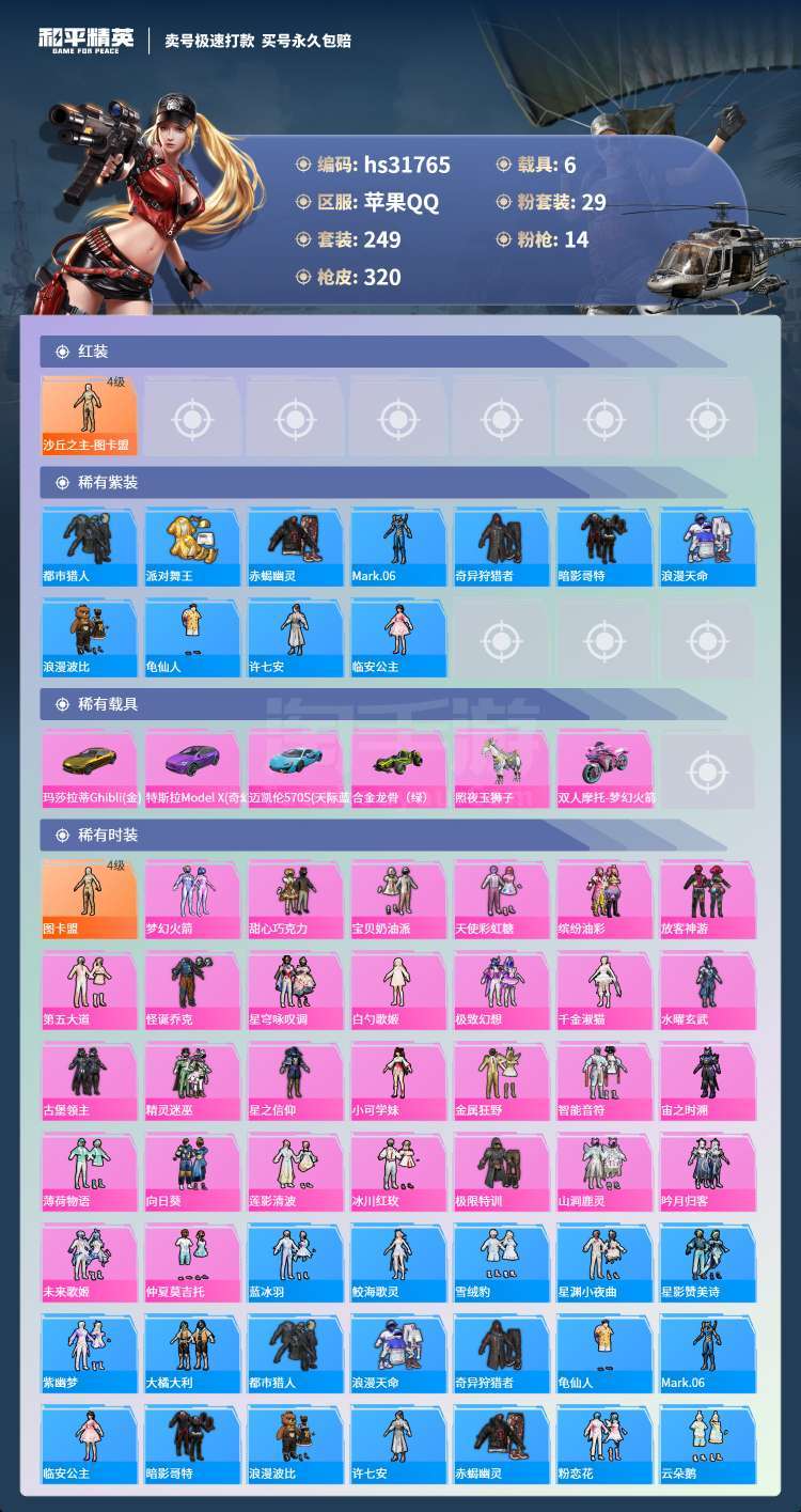 和平精英【苹果QQ】hs31765 苹果手Q-13王牌印记-有战神框-29粉装-14特效枪-6载具-138091热力值-