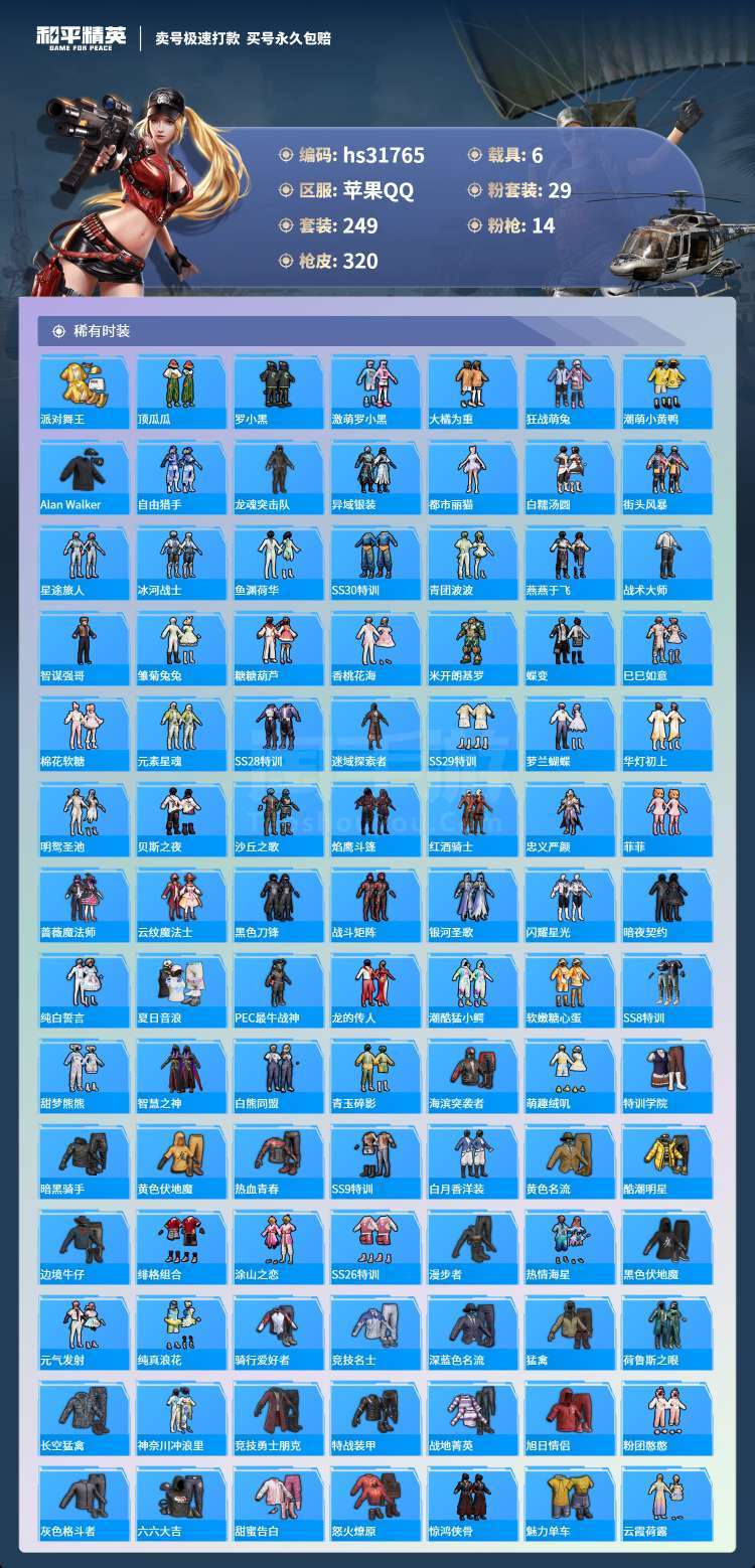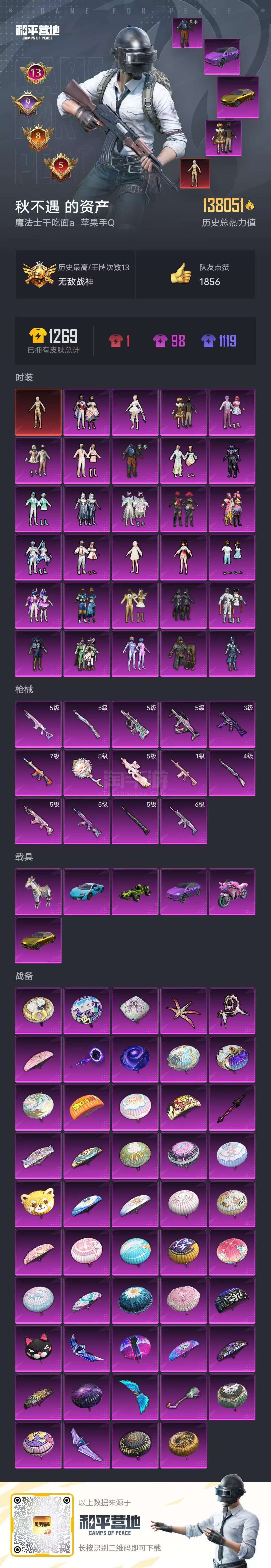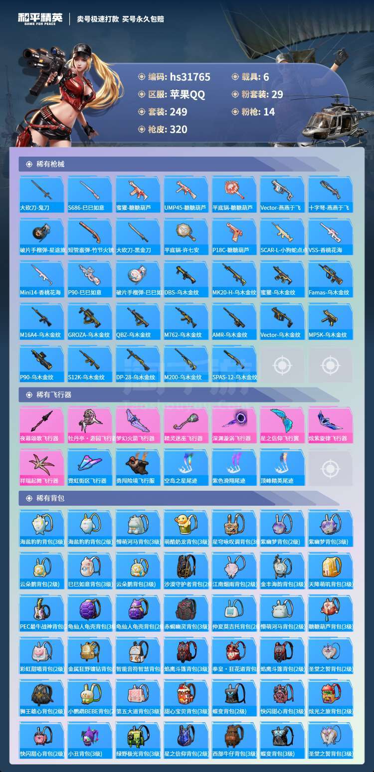 和平精英【苹果QQ】hs31765 苹果手Q-13王牌印记-有战神框-29粉装-14特效枪-6载具-138091热力值-