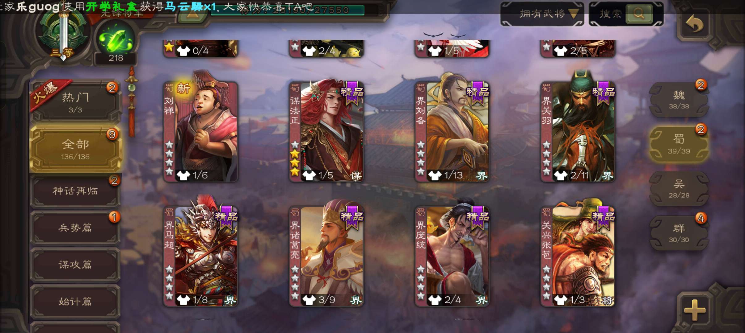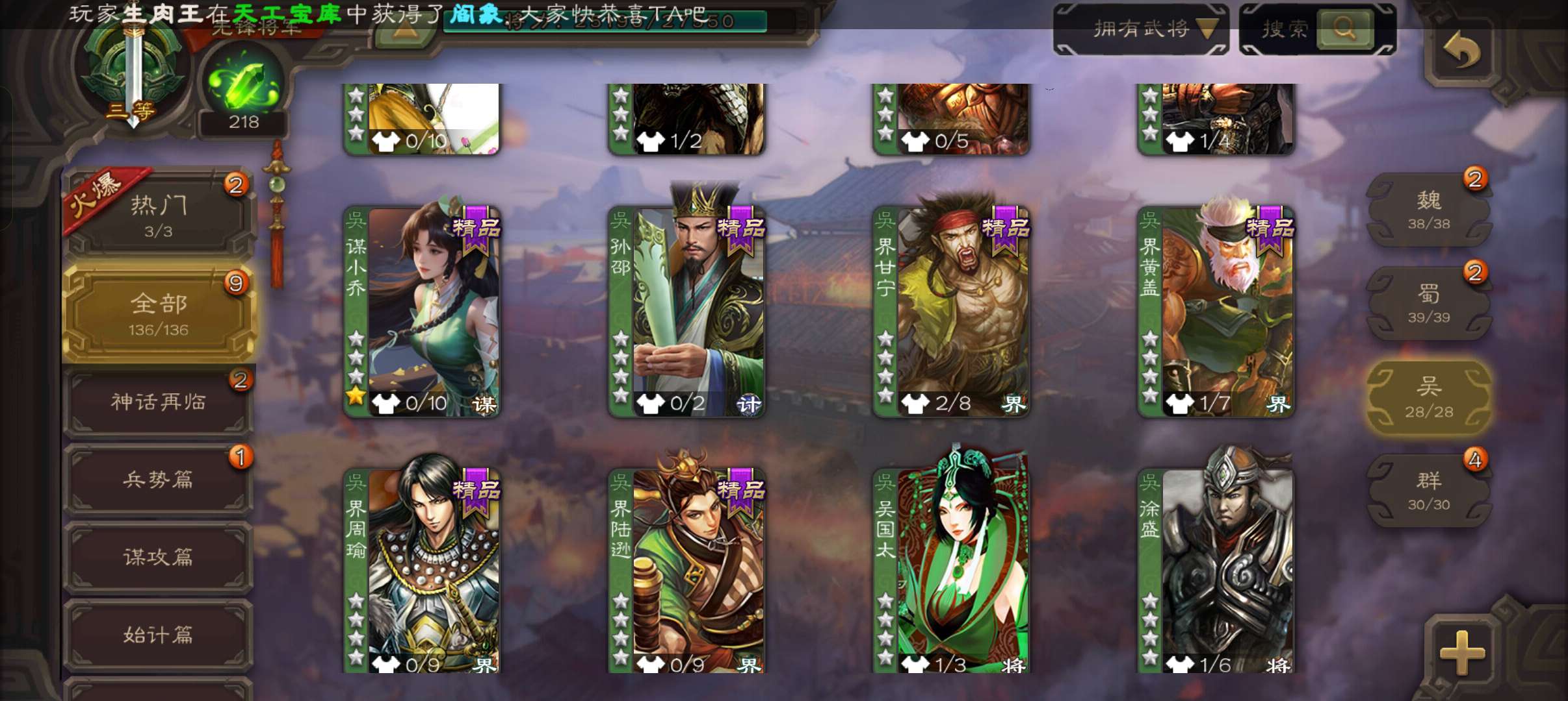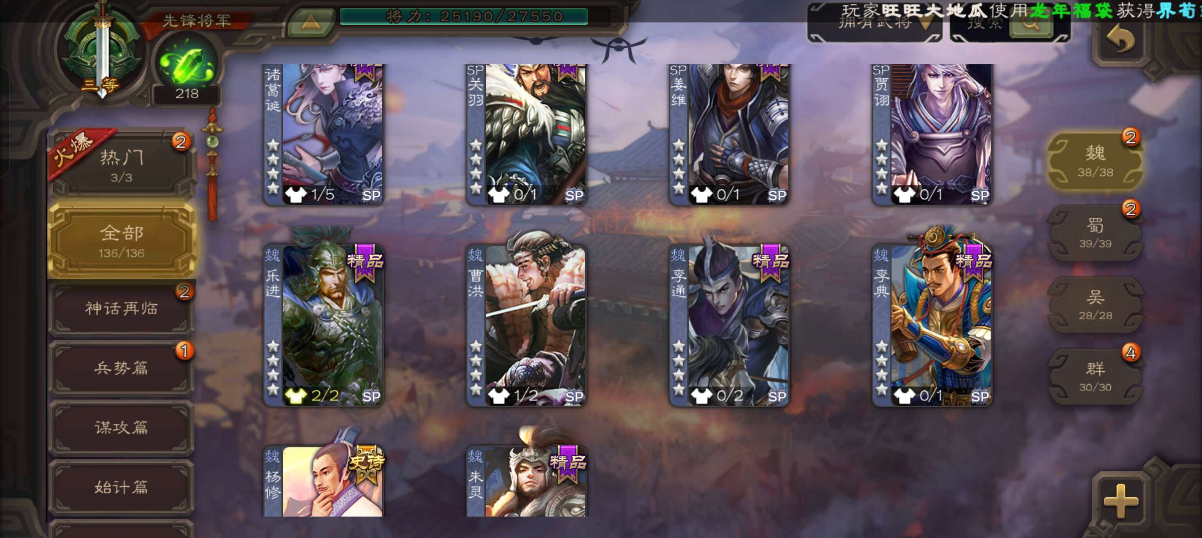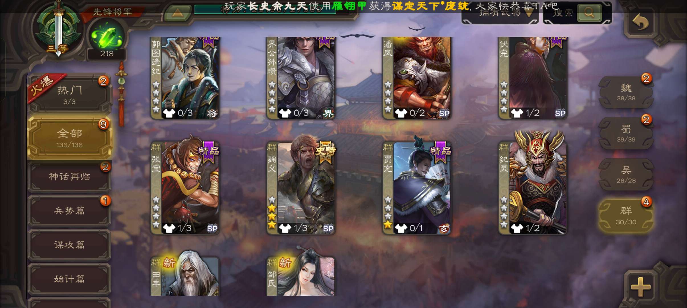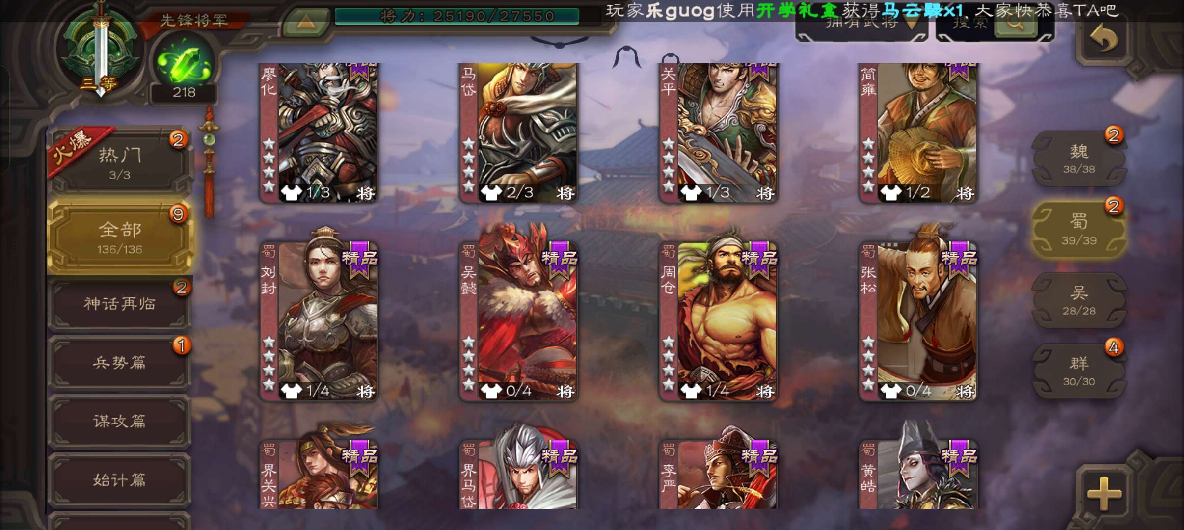 先锋将军,天工谋法正,回廊动白马谯周杨修3史诗,神吕蒙动界诸葛亮动界刘备崔琰谋小乔孙邵界吕布136将