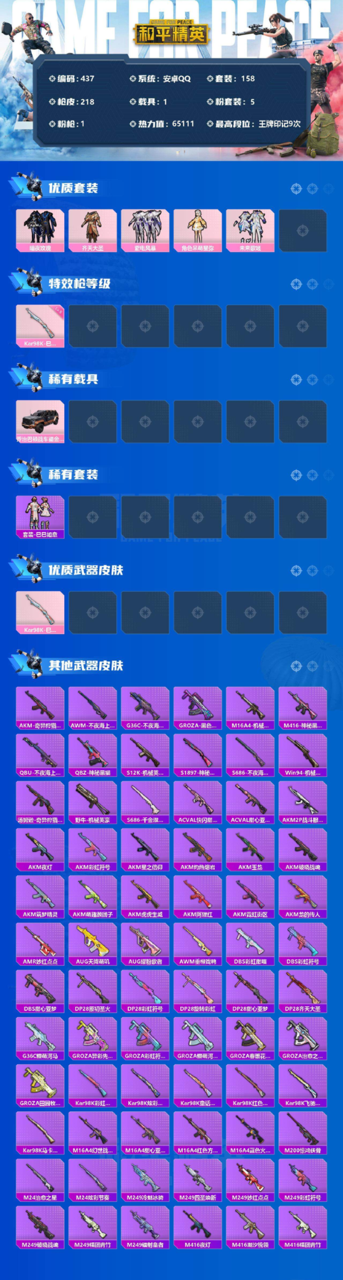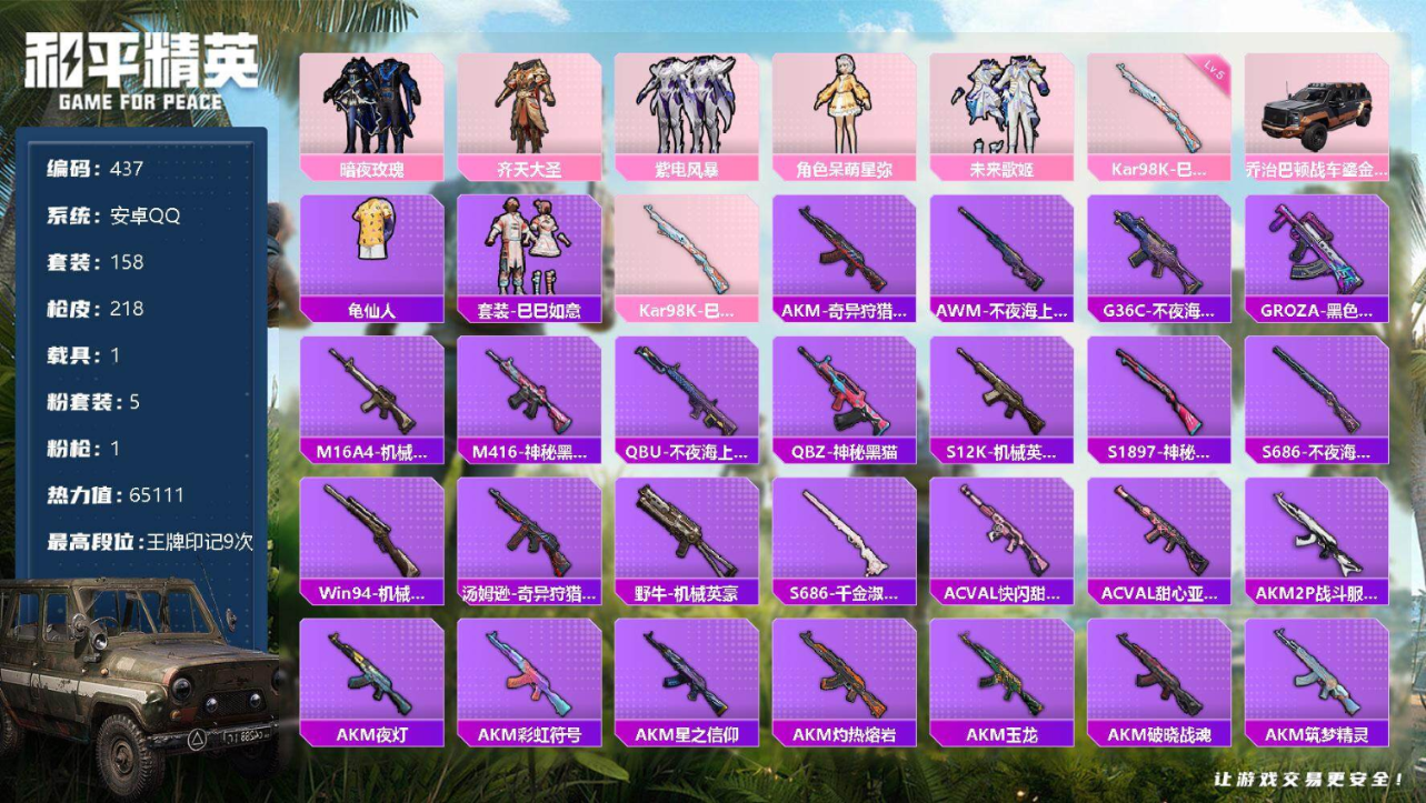 手Q-5粉装-1特效枪-1载具-65111热力值-9印记-158套装-218枪皮