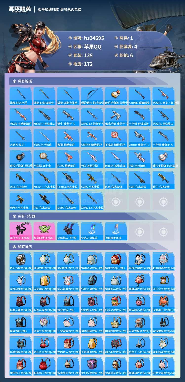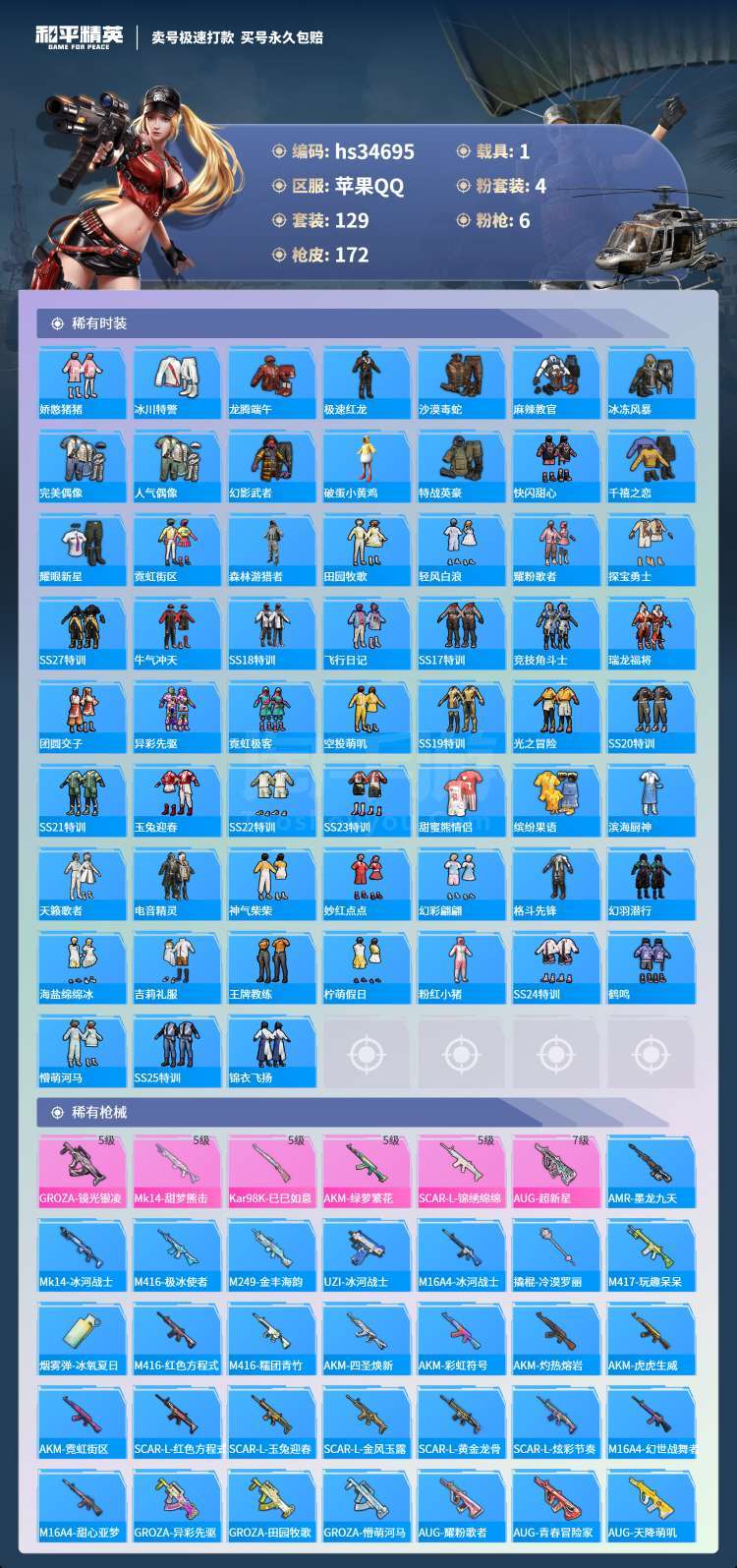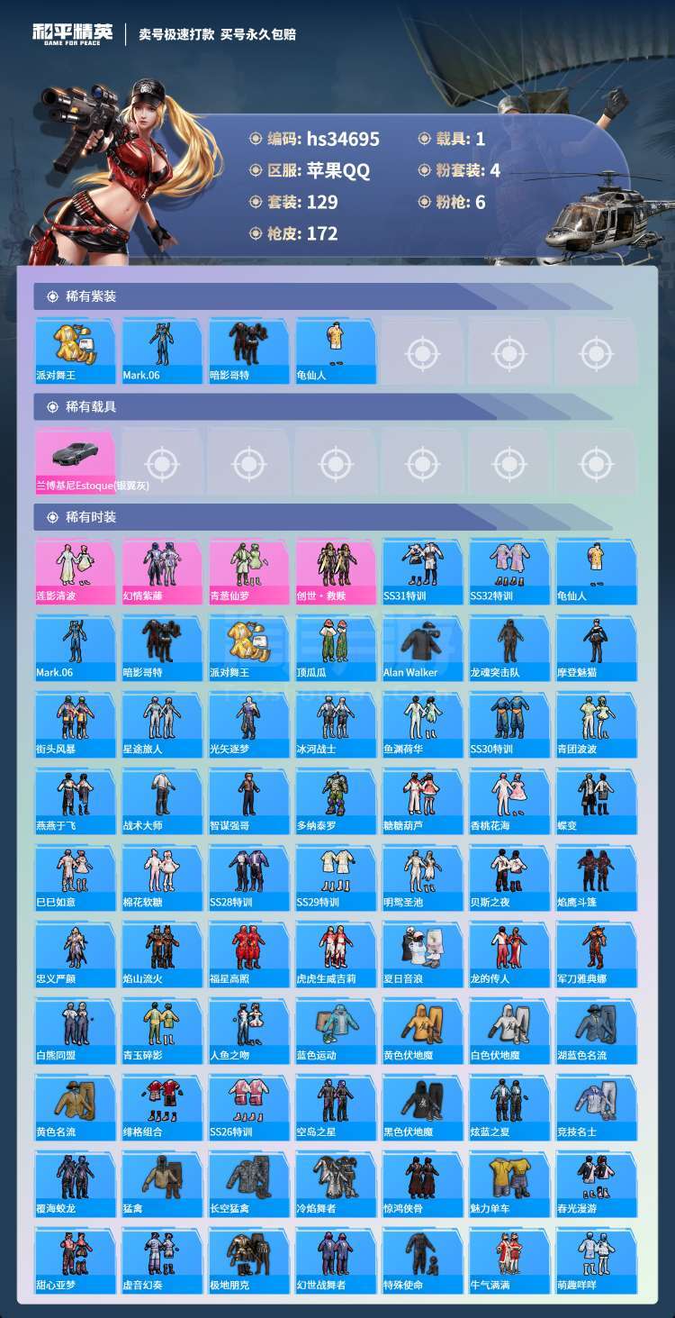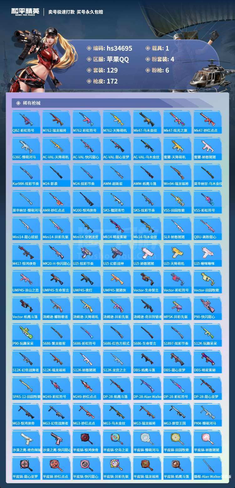 hs34695 苹果手Q-4王牌印记-4粉装-6特效枪-1载具-55268热力值-129套装-172