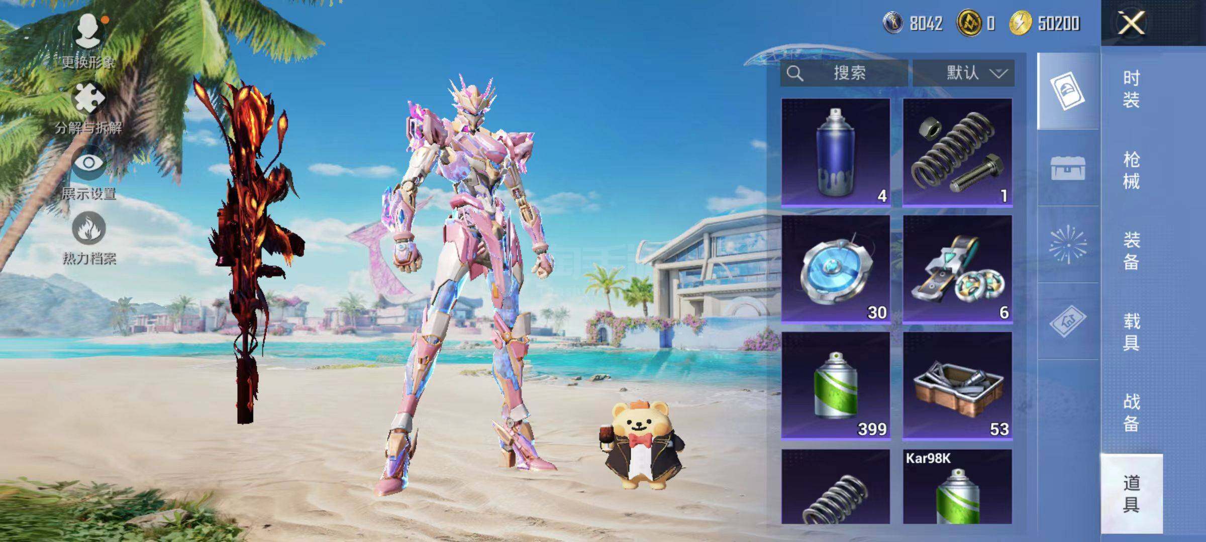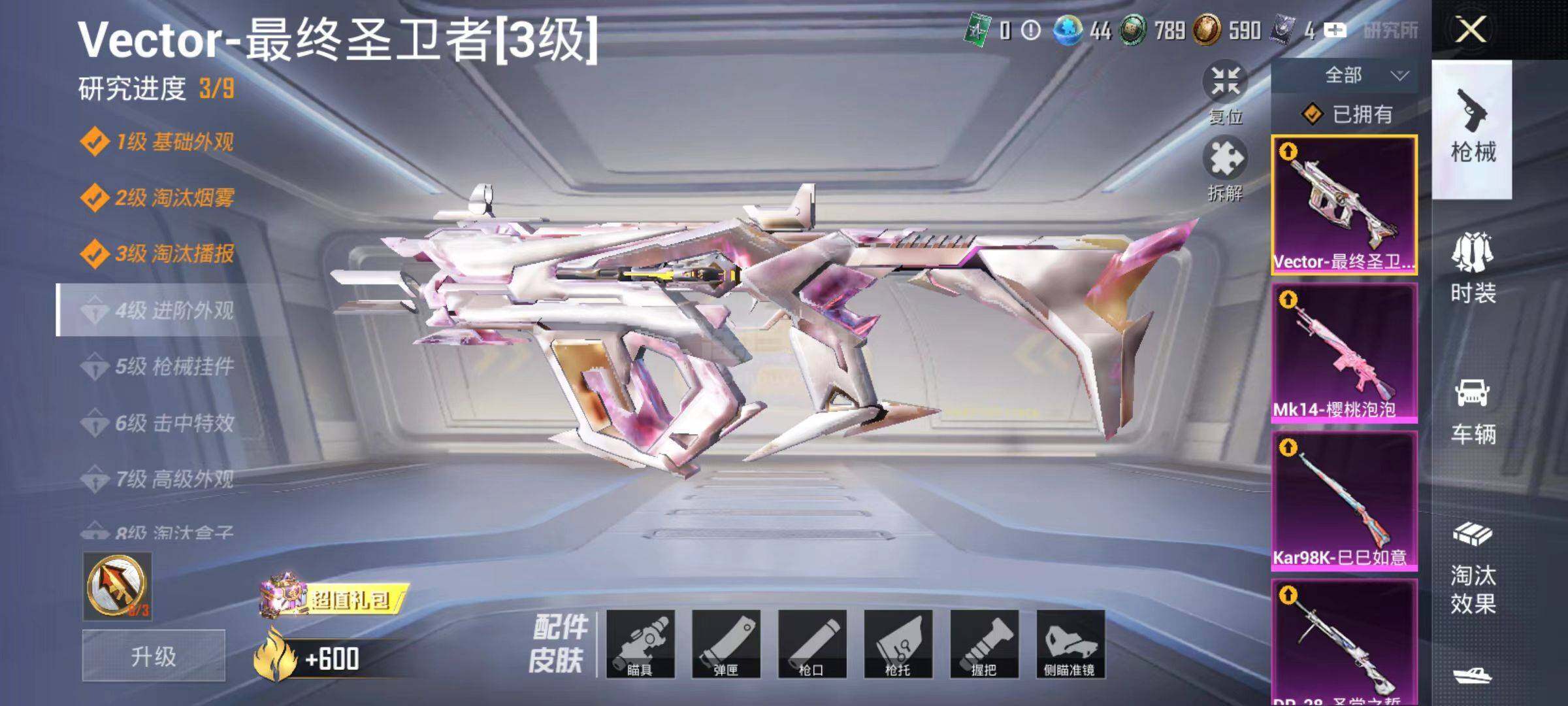 【特效枪等级】:M416-风花雪月(六级),Vector-最终圣卫者(三级),Kar98K-巳巳如意(五级),Mk14-樱桃泡泡(四级),DP-28-圣堂之誓(五级),MG3-洛神天依(五级)